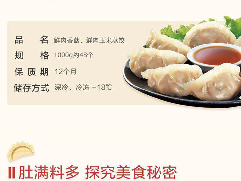 | Packaging specifications | Fresh meat, corn and mushroom combination 2kg pack [about 96 pieces,Fresh meat corn 2kg pack [about 96 pieces],Fresh meat and mushrooms 2kg pack [about 96 pieces],Fresh meat corn 1.0kg pack [about 48 pieces],Fresh meat and mushrooms 1.0kg pack [about 48 pieces] |