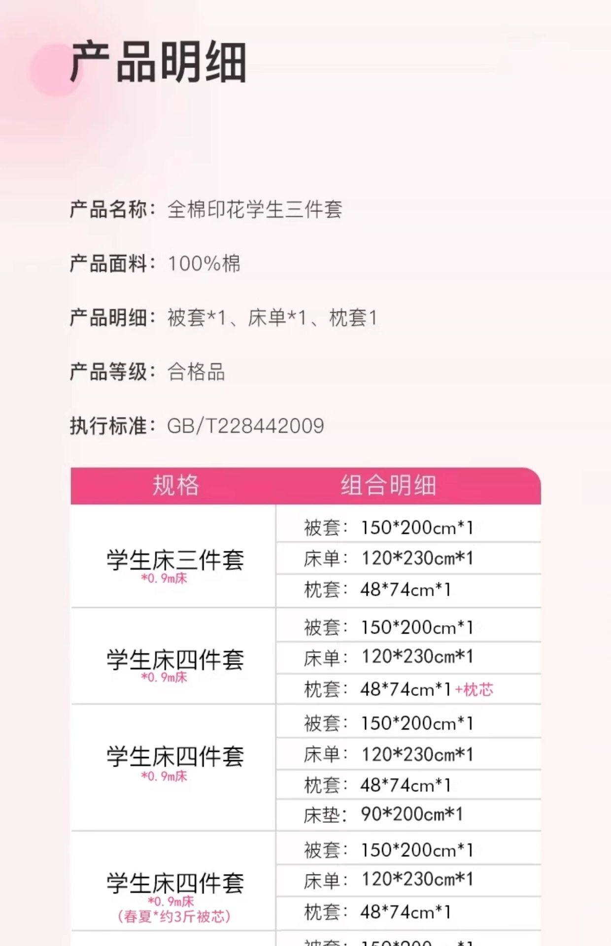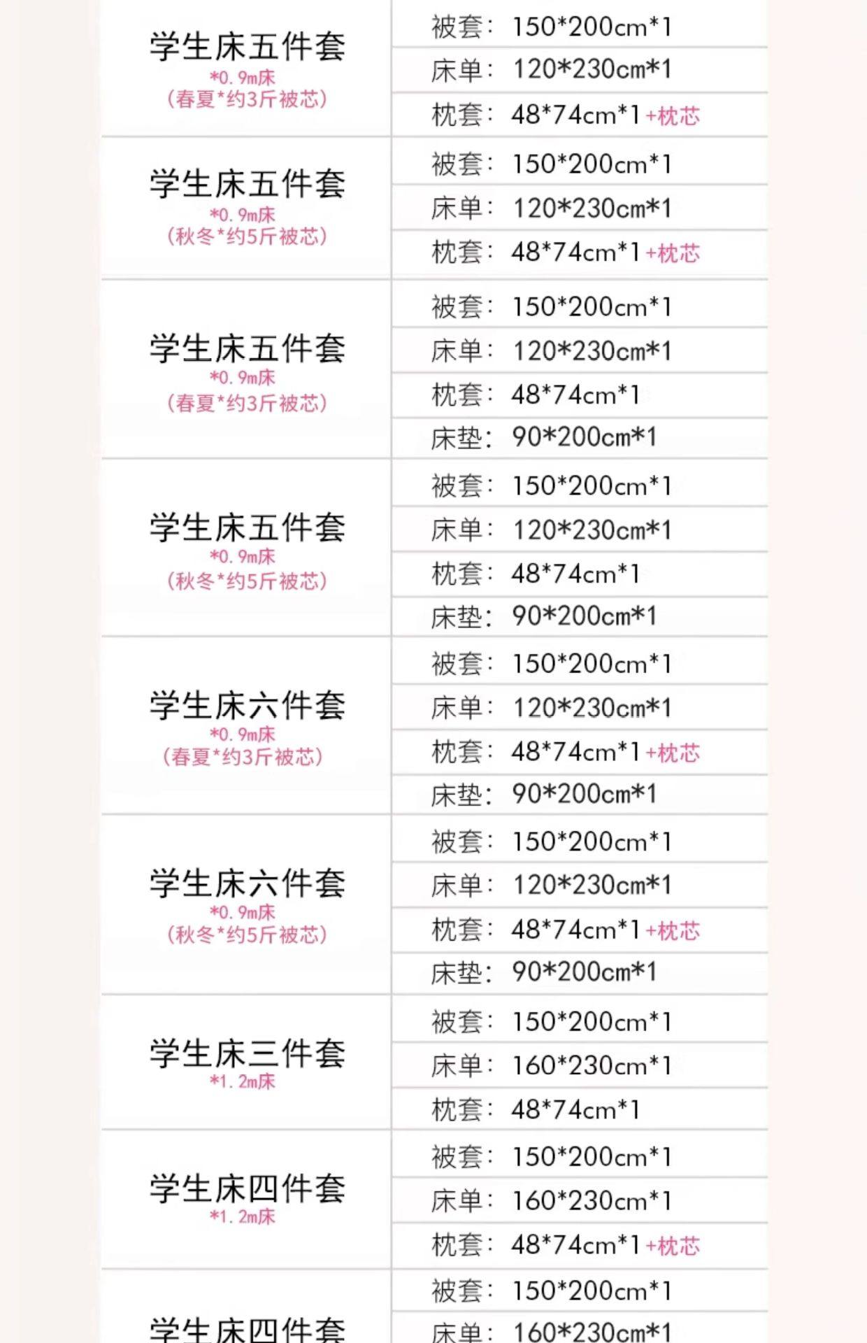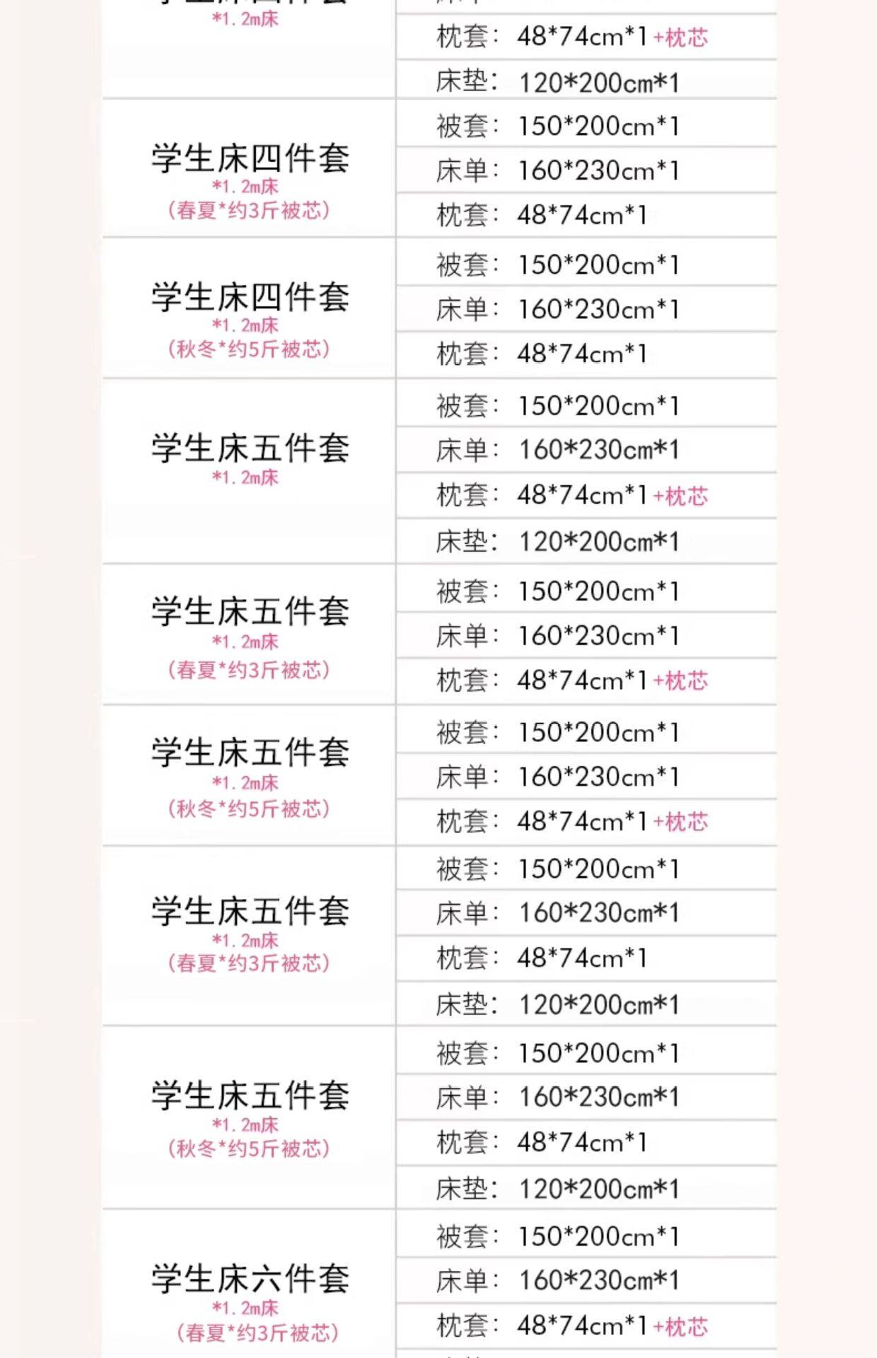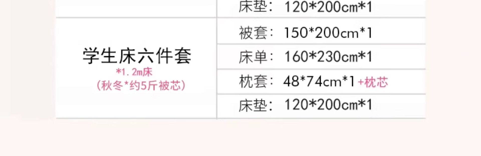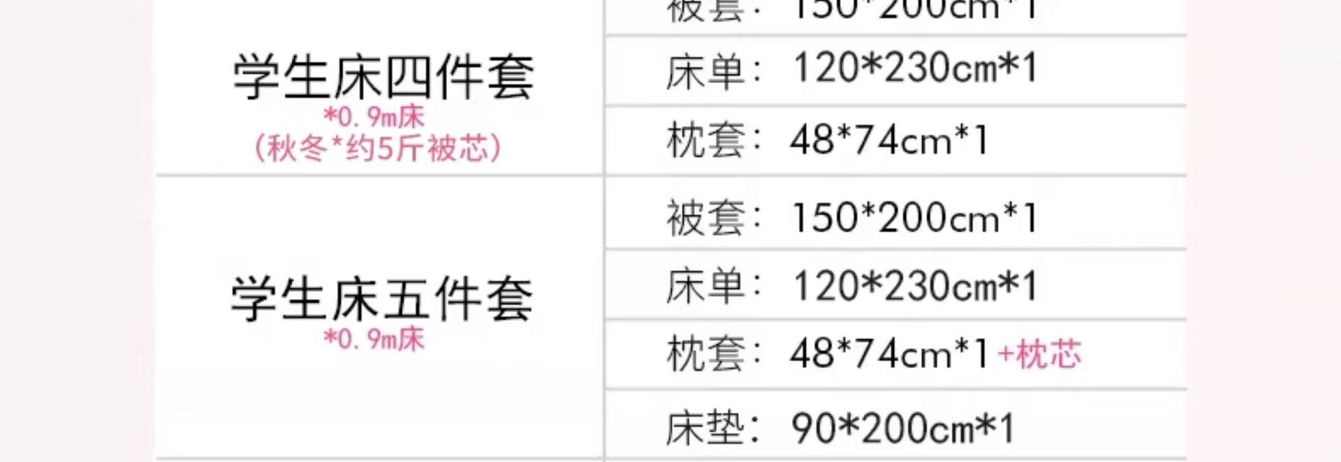 Dimensions 0.9m student fitted sheet three-piece set [fitted sheet + quilt cover + pillowcase] + additional gift bag*1,0.9m student bed sheet three-piece set [sheet + quilt cover + pillowcase] + additional gift bag*1,1.2m student fitted sheet three-piece set [fitted sheet + quilt cover + pillowcase] + additional gift bag*1,1.2m three-piece student bed sheet set [sheet + quilt cover + pillowcase] + additional gift bag*1,0.9m student bed sheet four-piece set [three-piece set + pillow core] + additional gift bag*1,0.9m student fitted sheet set of four [three-piece set + pillow core] + additional gift bag*1,1.2m student bed sheet four-piece set [three-piece set + pillow core] + additional gift bag*1,1.2m student fitted sheet set of four [three-piece set + pillow core] + additional gift bag*1,Spring and summer: 0.9m student bed sheet five-piece set [three-piece set + pillow core + about 1.5kg quilt core] + additional gift bag * 1,Spring and summer: 0.9m student fitted sheet five-piece set [three-piece set + pillow core + about 1.5kg quilt core] + additional gift bag*1,Spring and summer: 1.2m student bed sheet five-piece set [three-piece set + pillow core + about 1.5kg quilt core] + additional gift bag * 1,Spring and summer: 1.2m student fitted sheet five-piece set [three-piece set + pillow core + about 1.5kg quilt core] + additional gift bag*1,Autumn and winter: 0.9m student bed sheet five-piece set [three-piece set + pillow core + about 2.5kg quilt core] + additional gift bag *1,Autumn and winter: 0.9m student fitted sheet five-piece set [three-piece set + pillow core + about 2.5kg quilt core] + additional gift bag*1,Autumn and winter: 1.2m student bed sheet five-piece set [three-piece set + pillow core + about 2.5kg quilt core] + additional gift bag * 1,Autumn and winter: 1.2m student fitted sheet five-piece set [three-piece set + pillow core + about 2.5kg quilt core] + additional gift bag *1,Spring and summer: 0.9m student bed sheet six-piece set [three-piece set + pillow core + about 1.5kg quilt core + 90x200cm mattress],Spring and summer: 0.9m student fitted sheet six-piece set [three-piece set + pillow core + about 1.5kg quilt core + 90x200cm mattress],Spring and summer: 1.2m student bed sheet six-piece set [three-piece set + pillow core + about 1.5kg quilt core + 120x200cm mattress],Spring and summer: 1.2m student fitted sheet six-piece set [three-piece set + pillow core + about 1.5kg quilt core + 120x200cm mattress],Autumn and winter: 0.9m student bed sheet six-piece set [three-piece set + pillow core + about 2.5kg quilt core + 90x200cm mattress],Autumn and winter: 0.9m student fitted sheet six-piece set [three-piece set + pillow core + about 2.5kg quilt core + 90x200cm mattress],Autumn and winter: 1.2m student bed sheet six-piece set [three-piece set + pillow core + about 2.5kg quilt core + 120x200cm mattress],Autumn and winter: 1.2m student fitted sheet six-piece set [three-piece set + pillow core + about 2.5kg quilt core + 120x200cm mattress]