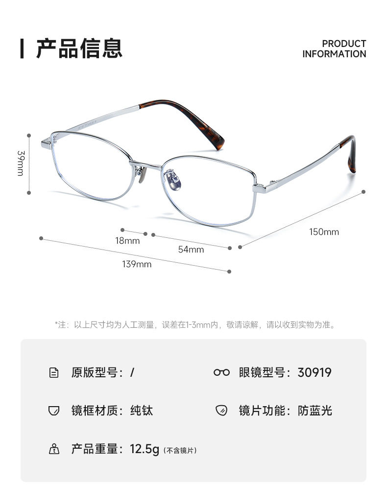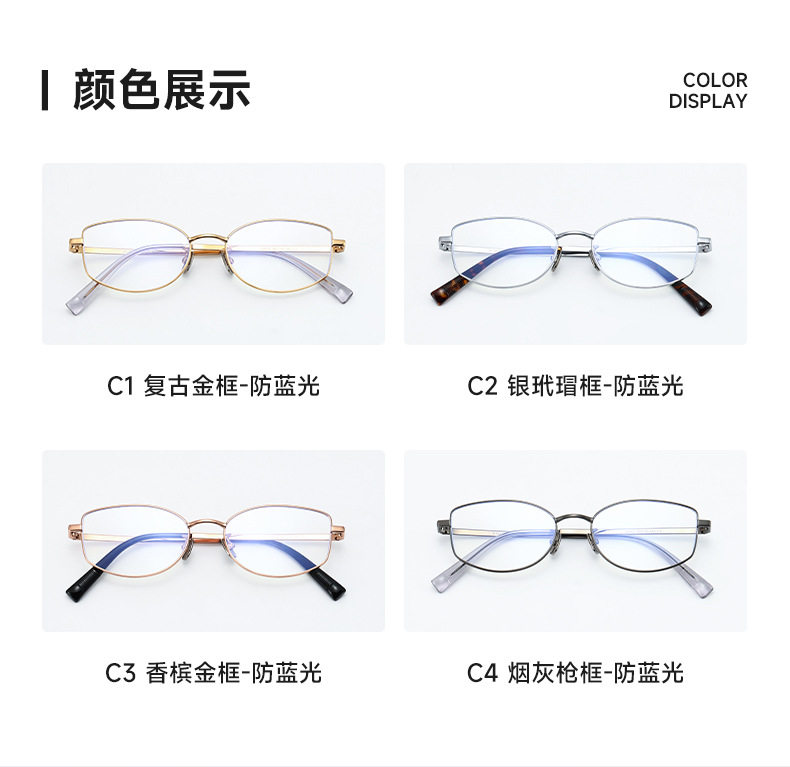 | Frame color | Retro gold frame-anti-blue light,Silver tortoiseshell frame-anti-blue light,Champagne gold frame-anti-blue light,Ash gun frame-anti-blue light,Please contact customer service for dosage,Exclusive protection authority,Duqiao plate top supplier,Baichuan's unique value-added services |