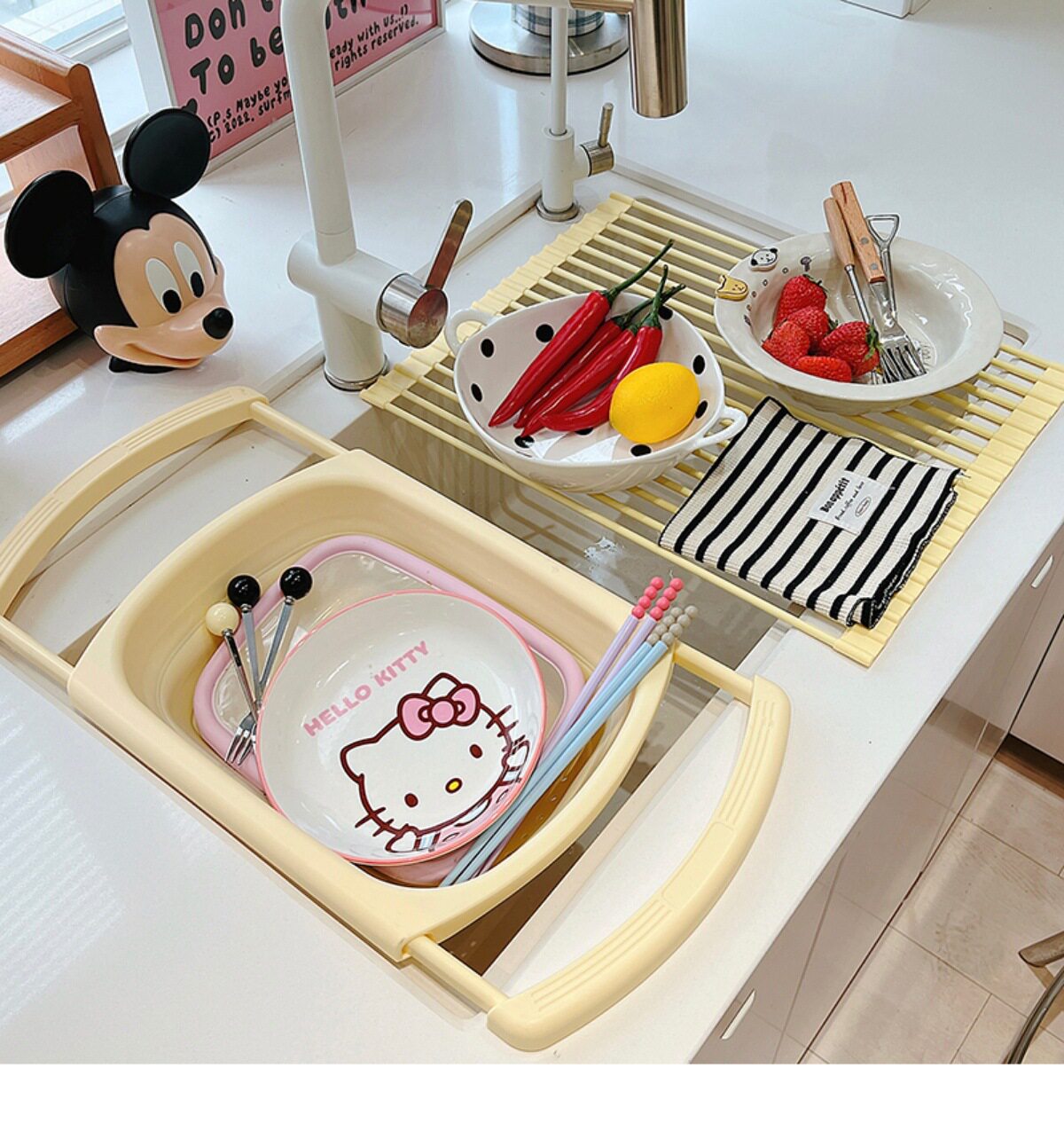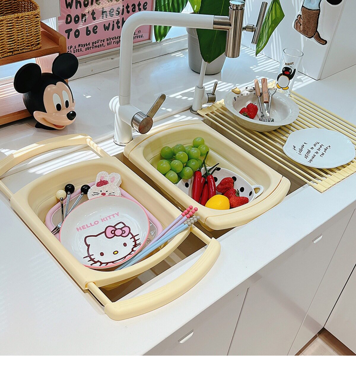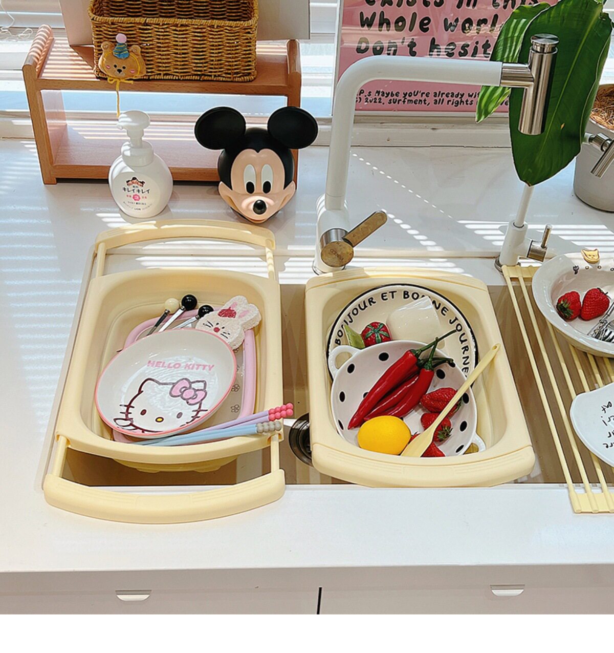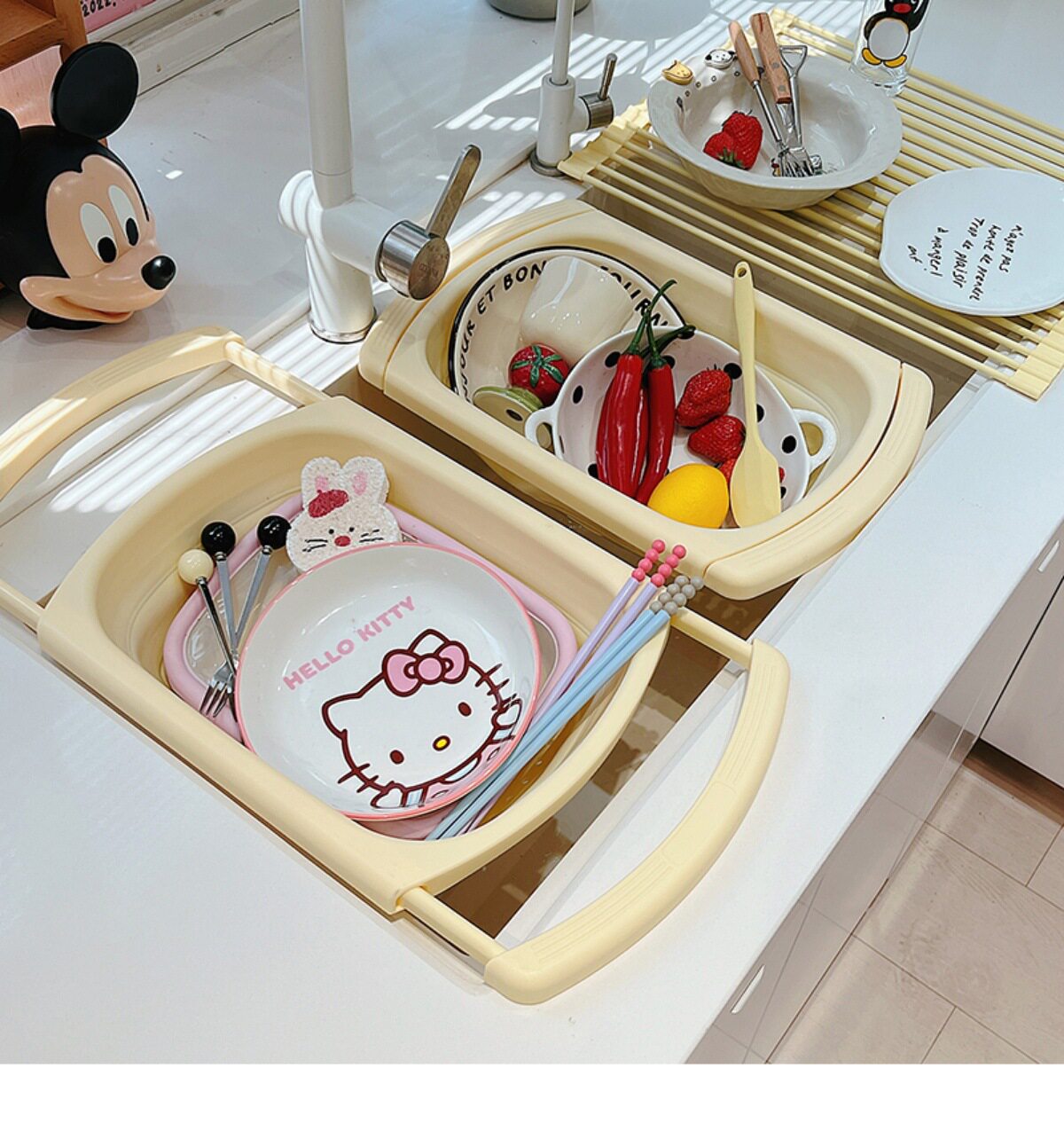 Ins Cream Drain Rack Kitchen Household Retractable Foldableing Dish Basket Dish Drain Rack Fruit Washing Basket