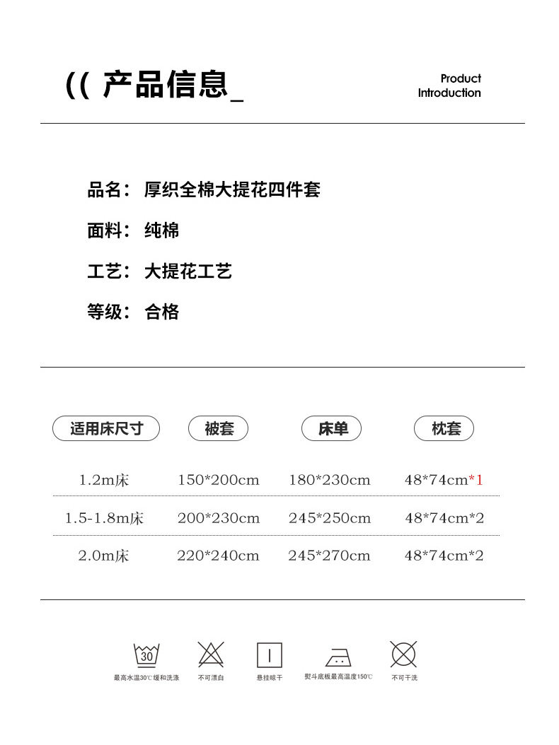 | Dimensions | 1.2m bed sheet three-piece set | Suitable for 150x200 quilt core,1.5m bed sheet four-piece set | Suitable for 200x230 quilt core,1.8m bed sheet four-piece set | Suitable for 200x230 quilt core,2.0m bed sheet four-piece set | Suitable for 220x240 quilt core,1.5m fitted sheet set of four | Suitable for 200x230 quilt core,1.8m fitted sheet set of four | Suitable for 200x230 quilt core |