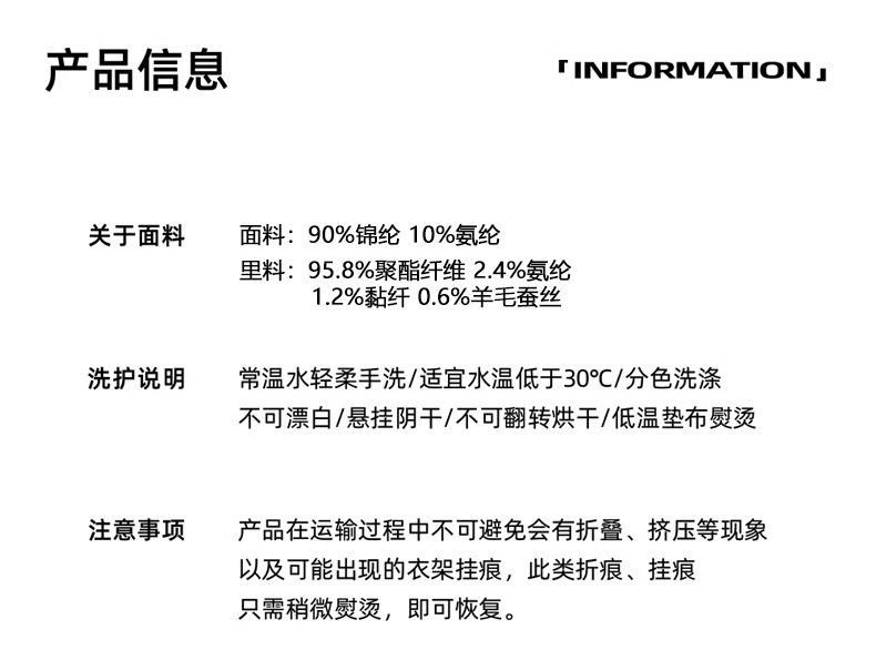 | Lining | 95.8 polyester fiber 2.4 spandex 1.2 viscose fiber 0.6 wool silk |