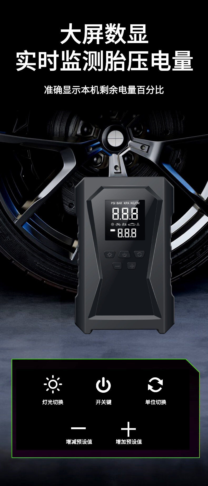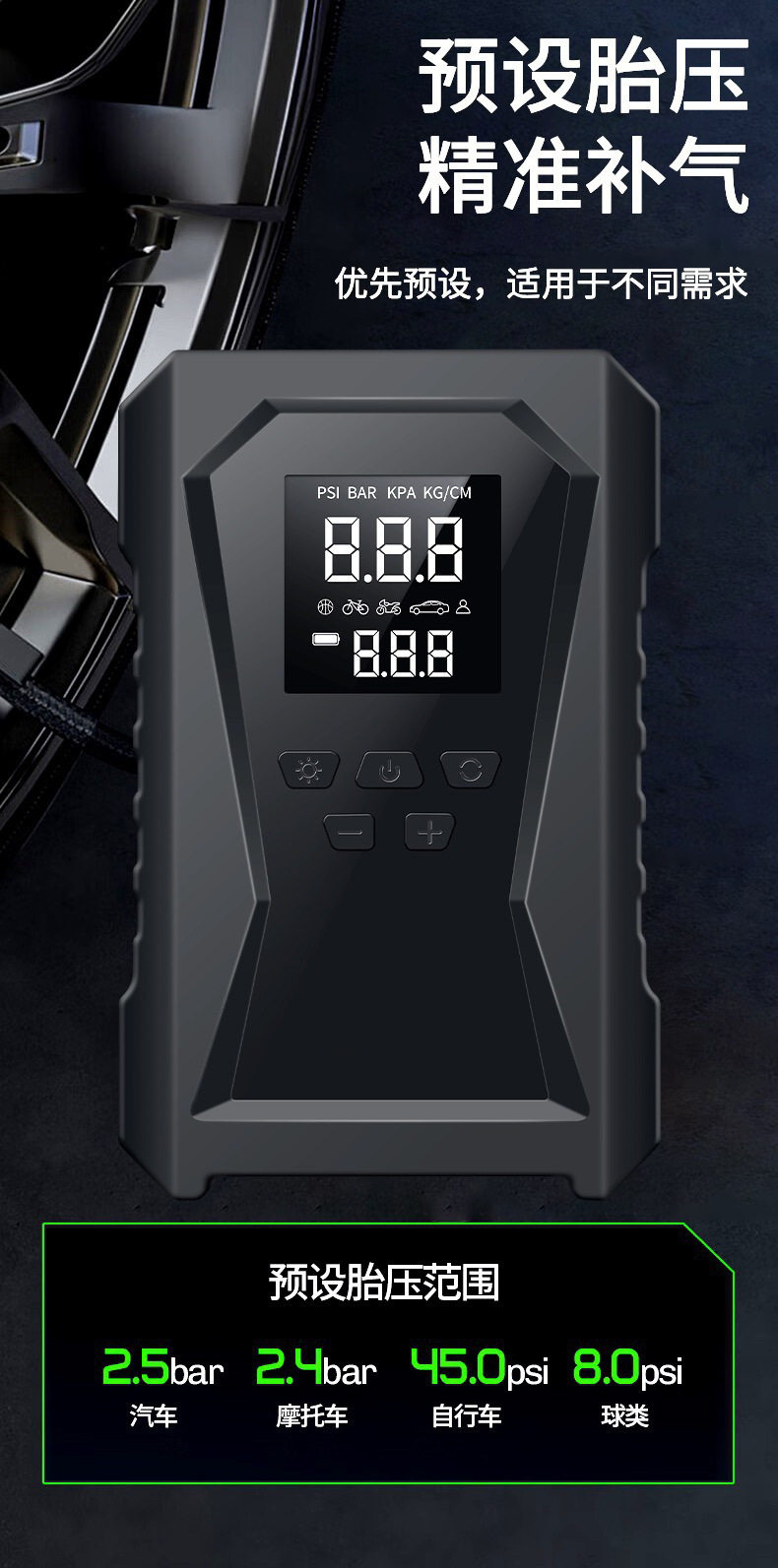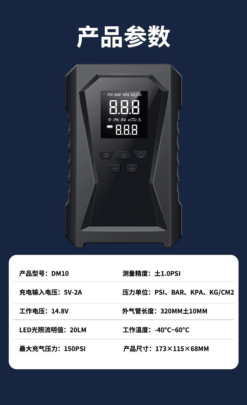 | Additional features | Lighting,Tire pressure gauge,Warning light,Usb charging |
