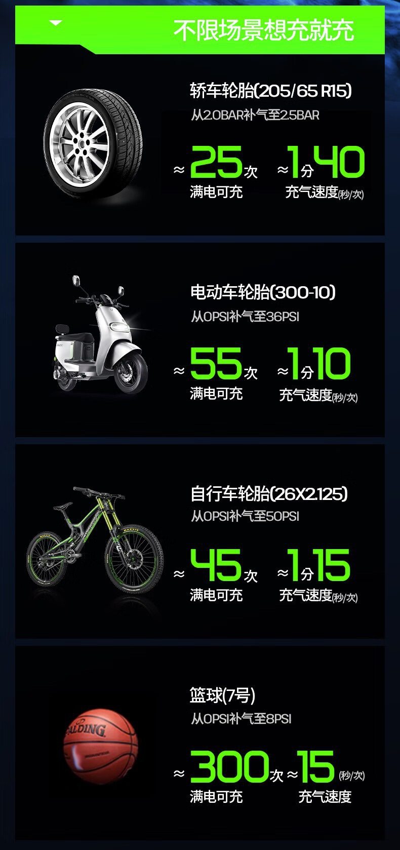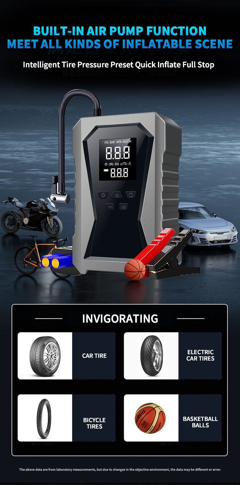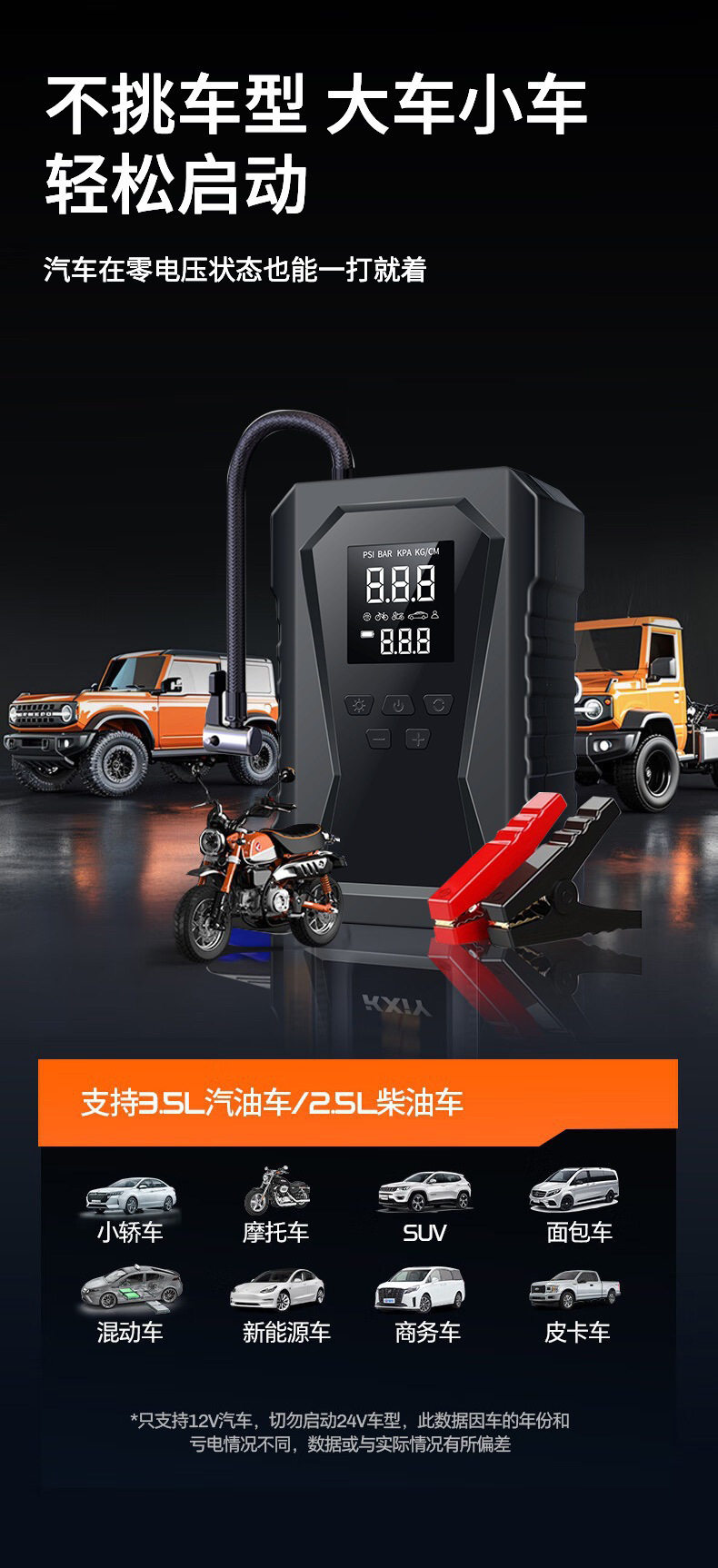 | Additional features | Lighting,Tire pressure gauge,Warning light,Usb charging |