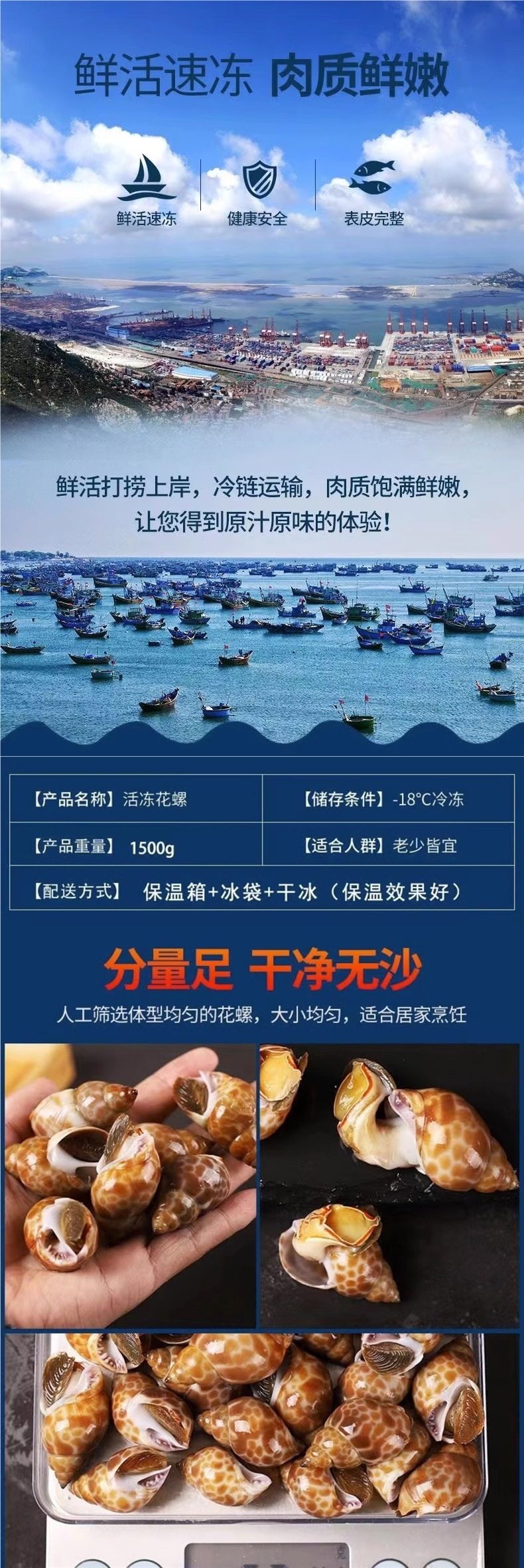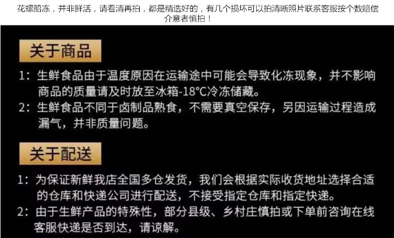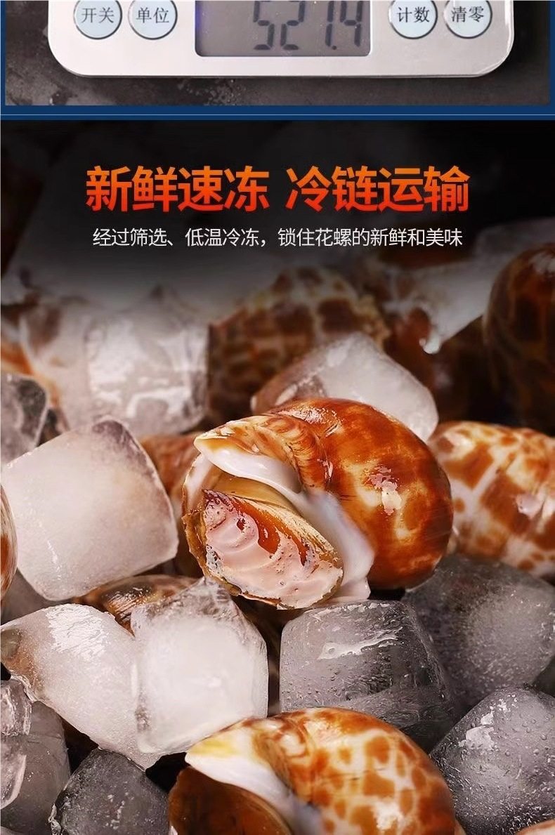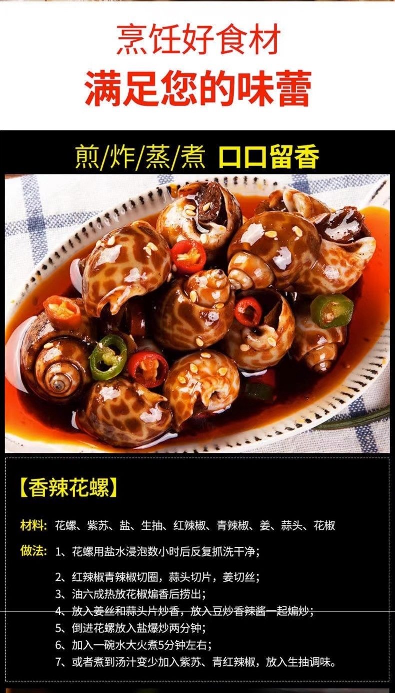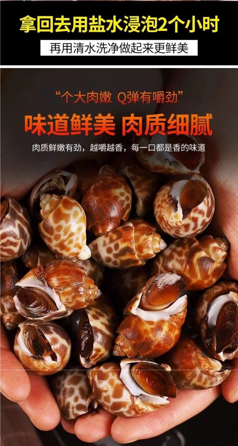 | Packaging specifications | Small flower snails (50~100 pieces/jin) - 0.5kg pack,Large flower snails (25~40 pieces/catties) - 0.5kg pack,Large flower snails (25~40 pieces/catties) - 1.0kg pack,Large flower snails (25~40 pieces/catties) - 1.5kg pack,Large flower snails (25~40 pieces/catties) - 2kg pack,Large flower snails (25~40 pieces/catties) - 2.5kg pack,Small flower snails (50~100 pieces/jin) - 1.0kg pack,Small flower snails (50~100 pieces/jin) - 1.5kg pack,Small flower snails (50~100 pieces/jin) - 2kg pack,Small flower snails (50~100 pieces/jin) - 2.5kg pack |