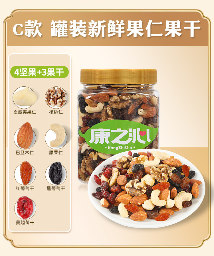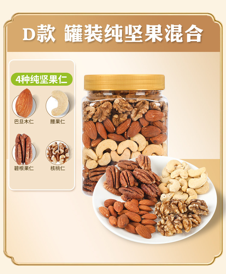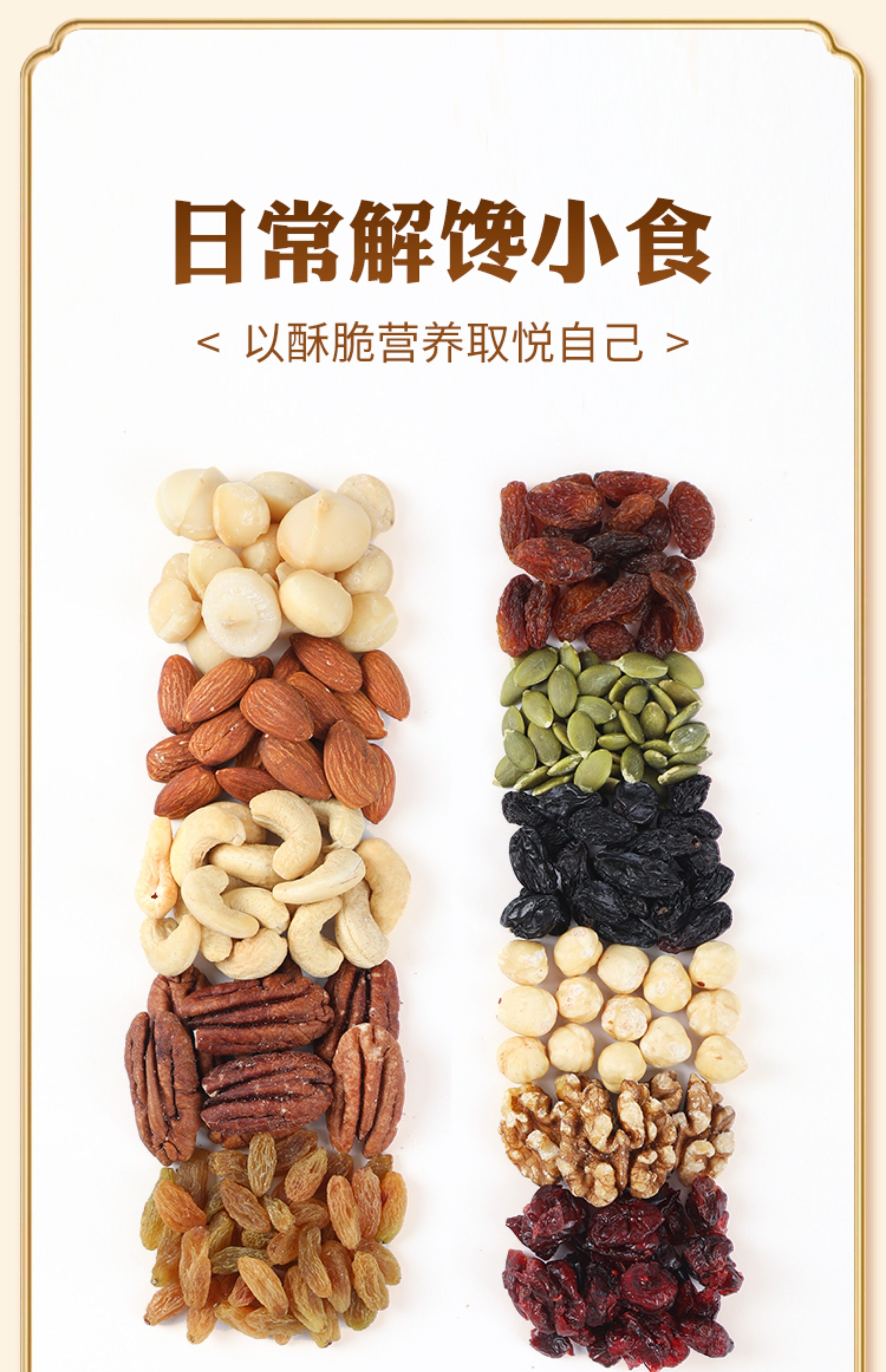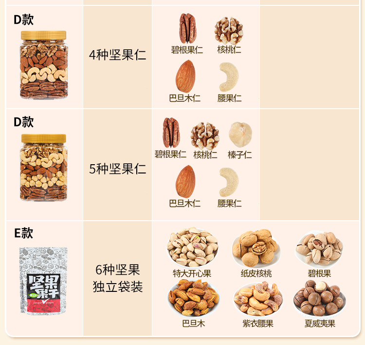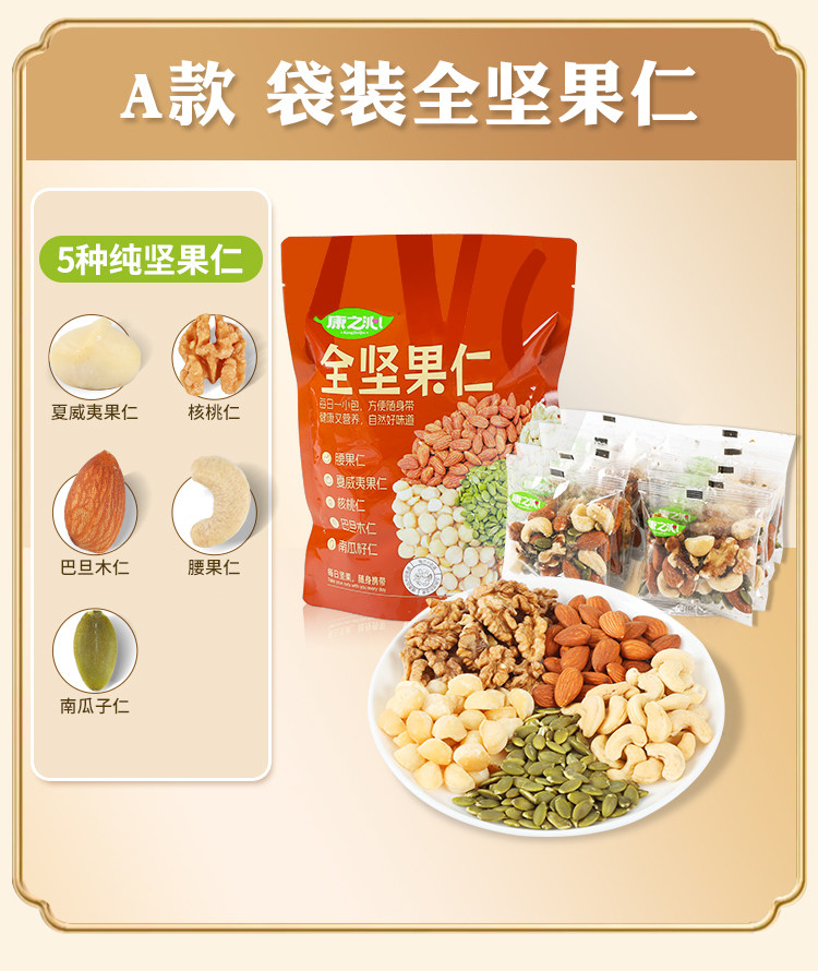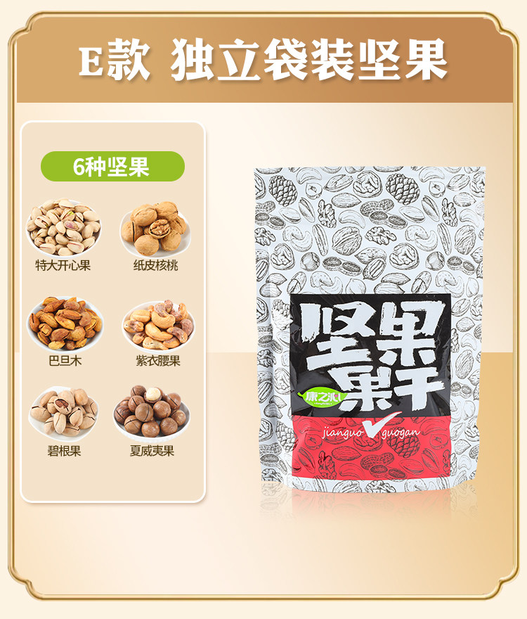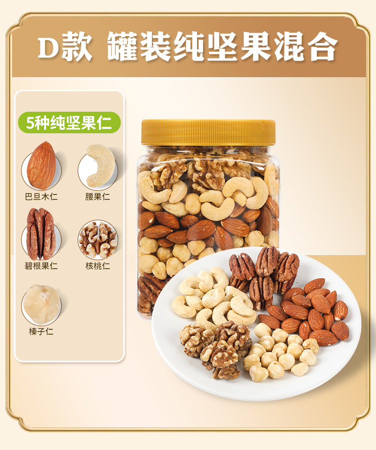 | Packaging specifications | Type a [original pure nuts] 0.5kg : 250g*2 bags (buy 10 bags, get 10 bags free, a total of 20 small bags),Type a [original pure nuts] 1.0kg : 250g*4 bags (buy 20 bags, get 20 bags free, a total of 40 small bags),Type a [original pure nuts] half a pound: 250g*1 bag (buy 5 bags, get 5 free, a total of 10 small bags),Type a [original pure nuts] 2.5kg : 250g*10 bags (buy 50 bags, get 50 bags free, a total of 100 small bags),Type b [pure nuts with pecan nuts] 0.5kg : 250g*2 bags (buy 10 bags, get 10 bags free, a total of 20 small bags),Type b [pure nuts with pecan nuts] 1.0kg : 250g*4 bags (buy 20 bags, get 20 bags free, a total of 40 small bags),Type b [pure nuts with pecans] half a pound: 250g*1 bag (buy 5 bags, get 5 free, a total of 10 small bags),Type b [pure nuts with pecans] 2.5kg : 250g*10 bags (buy 50 bags, get 50 bags free, a total of 100 small bags),Type c [7 kinds of fresh nuts and dried fruits] large can: 500g*1 can (4 kinds of nuts + 3 kinds of dried fruits),Type c [7 kinds of fresh nuts and dried fruits] large can: 500g*2 cans (4 kinds of nuts + 3 kinds of dried fruits),Type d [4 kinds of mixed pure nuts] large can: 500g*1 can (almond kernels + cashew kernels + walnut kernels + pecan kernels),Type d [5 kinds of mixed pure nuts] large can: 500g*1 can (almond kernels + cashew kernels + walnut kernels + pecan kernels + hazelnut kernels),Type d [4 kinds of mixed pure nuts] large can: 500g*2 cans (almond kernels + cashew kernels + walnut kernels + pecan kernels),Type d [5 kinds of mixed pure nuts] large can: 500g*2 cans (almond kernels + cashew kernels + walnut kernels + pecan kernels + hazelnut kernels),Type e [type 2kg bags] extra large pistachios + macadamia nuts + almonds + paper-skinned walnuts (net weight 0.5kg each),Type e [classic style 2kg bags] extra large pistachios + macadamia nuts + almonds + purple cashews (net weight 0.5kg each),Type e [type 2.5kg bags] extra large pistachios + macadamia nuts + pecans + almonds + purple cashews (net weight 0.5kg each),Type e [type 2.5kg bags] extra large pistachios + paper-skinned walnuts + pecans + macadamia nuts + almonds (net weight 0.5kg each),Type e [family portrait type 3kg bags] extra large pistachios + macadamia nuts + almonds + pecans + purple cashews + paper walnuts (net weight 0.5kg each) |