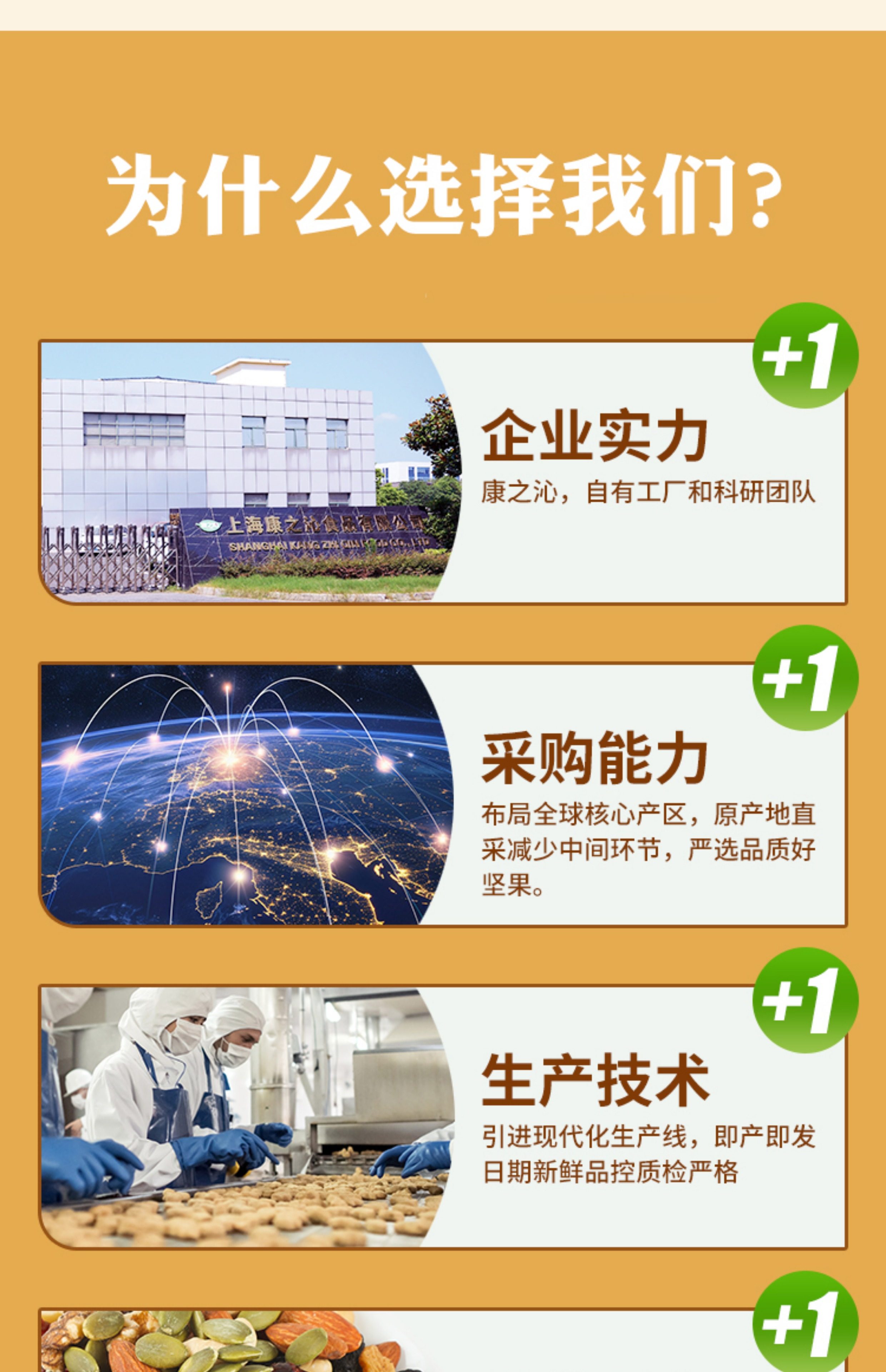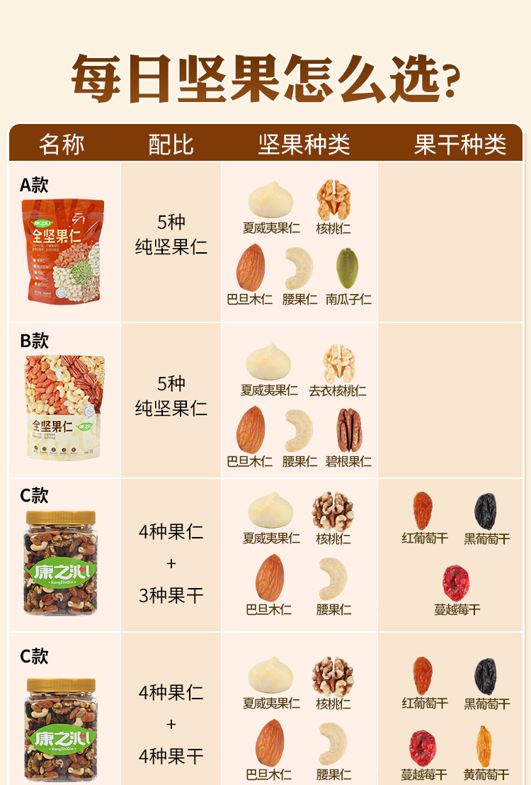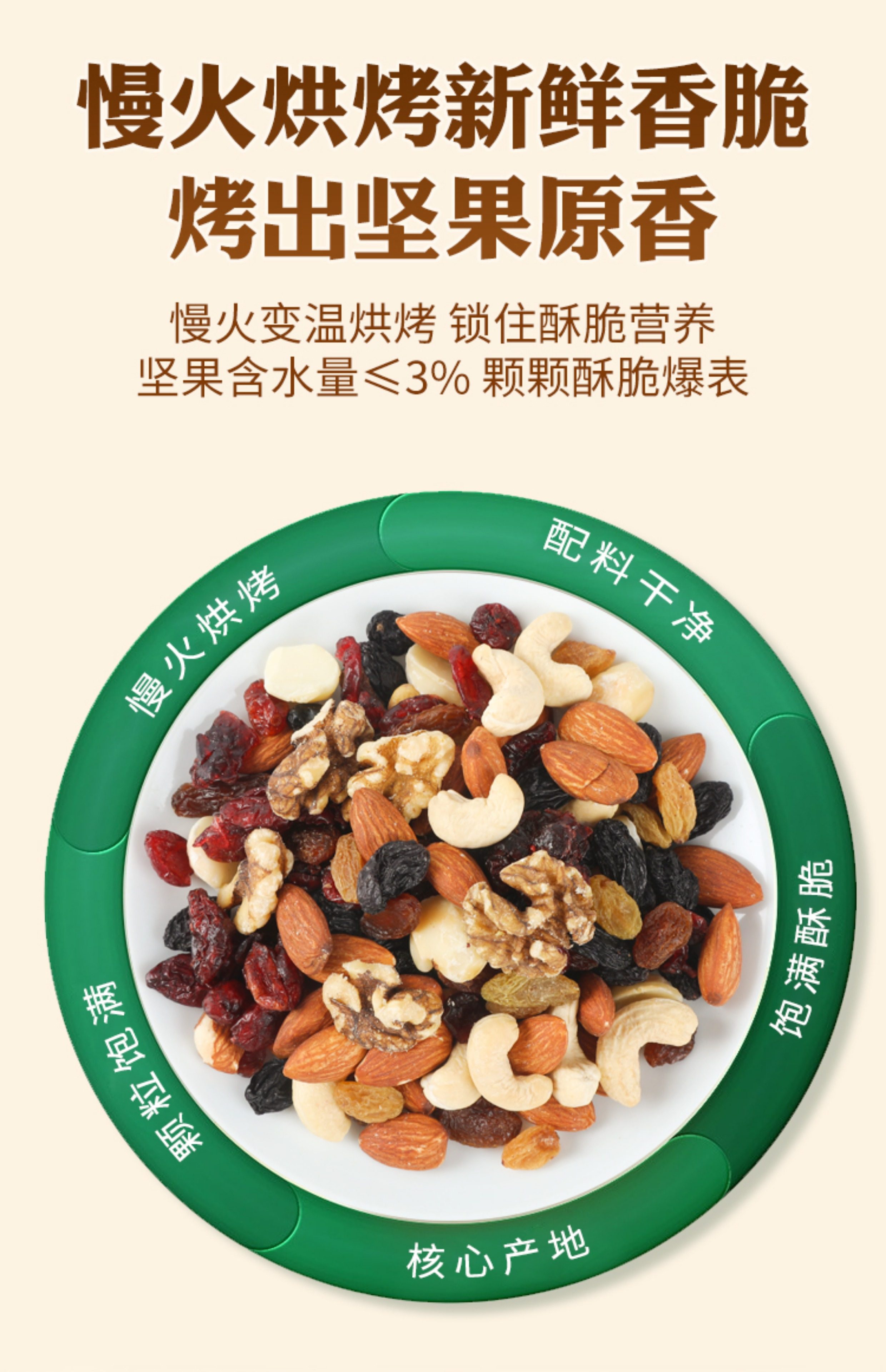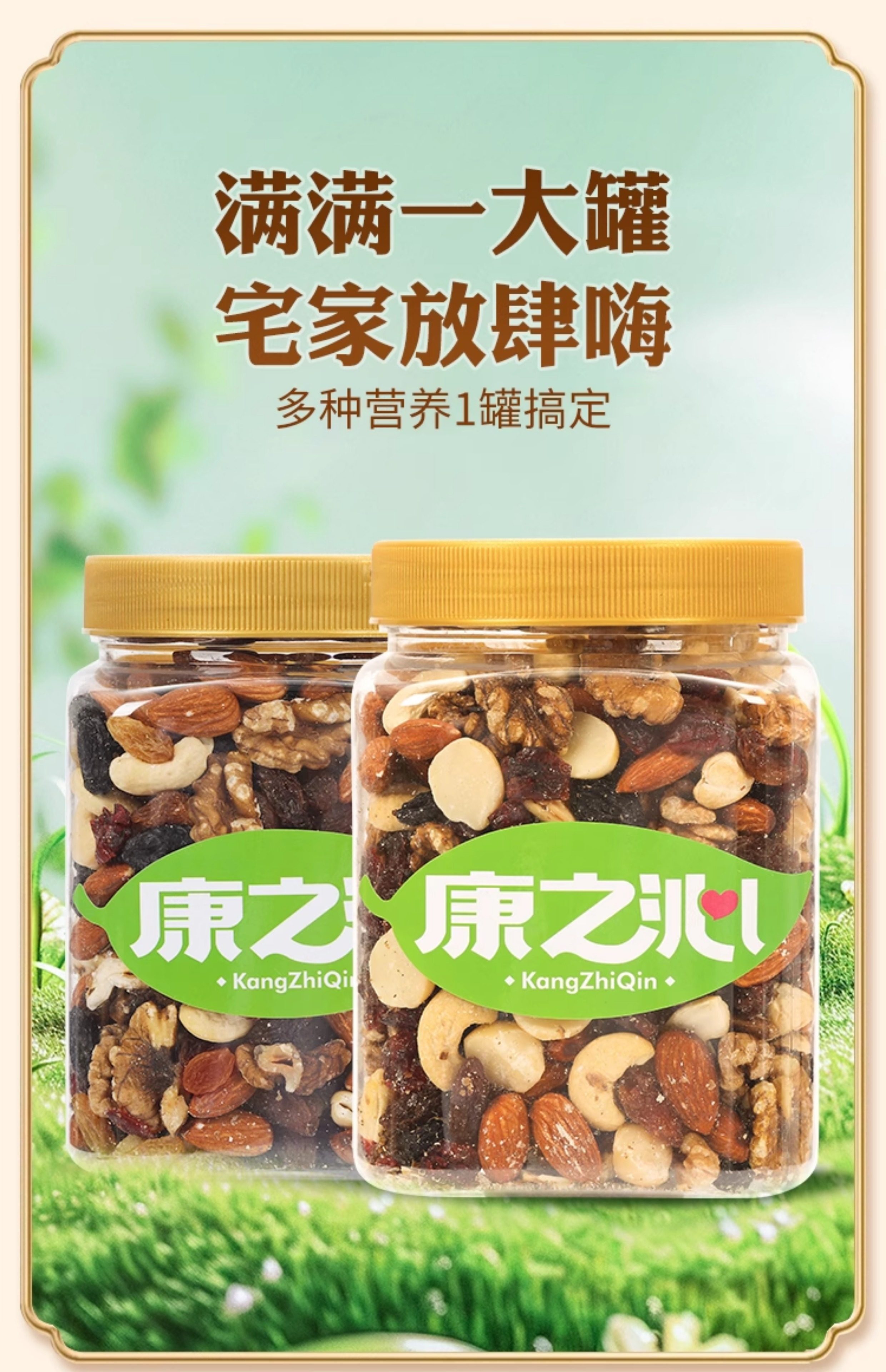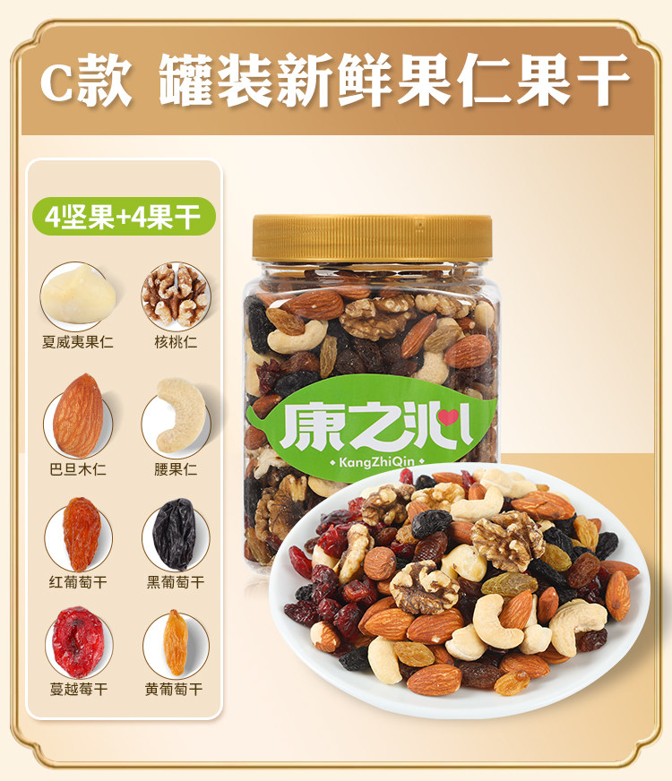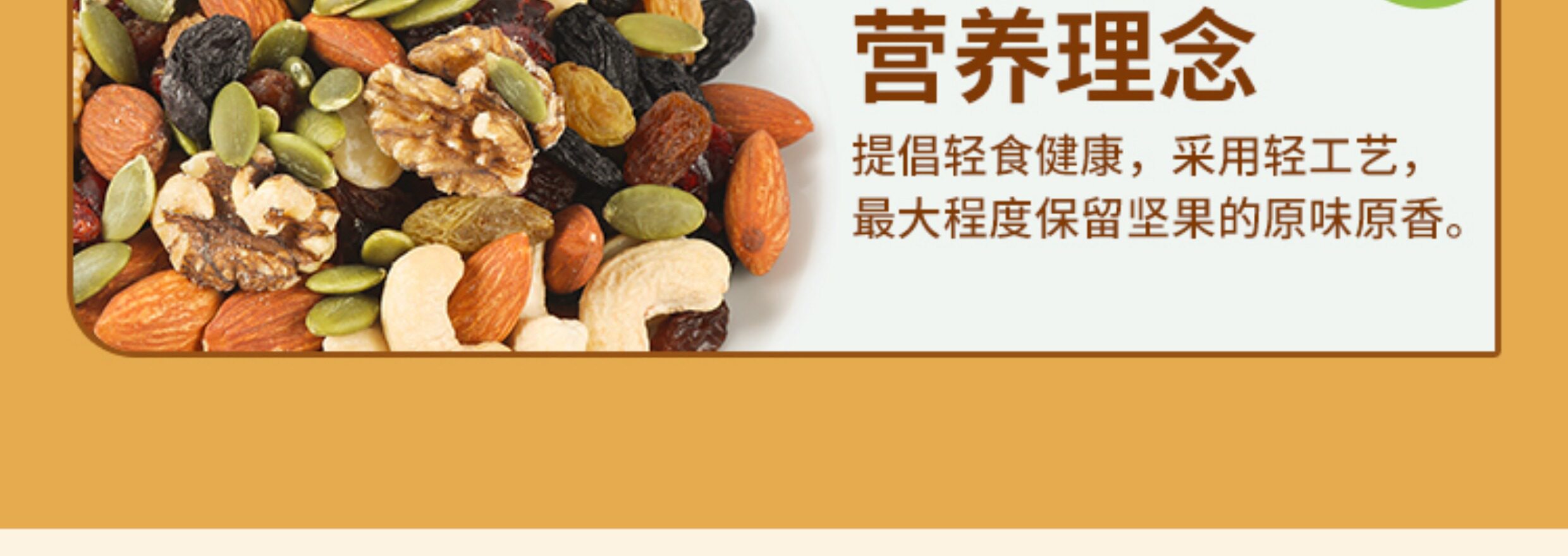 | Packaging specifications | Type a [original pure nuts] 0.5kg : 250g*2 bags (buy 10 bags, get 10 bags free, a total of 20 small bags),Type a [original pure nuts] 1.0kg : 250g*4 bags (buy 20 bags, get 20 bags free, a total of 40 small bags),Type a [original pure nuts] half a pound: 250g*1 bag (buy 5 bags, get 5 free, a total of 10 small bags),Type a [original pure nuts] 2.5kg : 250g*10 bags (buy 50 bags, get 50 bags free, a total of 100 small bags),Type b [pure nuts with pecan nuts] 0.5kg : 250g*2 bags (buy 10 bags, get 10 bags free, a total of 20 small bags),Type b [pure nuts with pecan nuts] 1.0kg : 250g*4 bags (buy 20 bags, get 20 bags free, a total of 40 small bags),Type b [pure nuts with pecans] half a pound: 250g*1 bag (buy 5 bags, get 5 free, a total of 10 small bags),Type b [pure nuts with pecans] 2.5kg : 250g*10 bags (buy 50 bags, get 50 bags free, a total of 100 small bags),Type c [7 kinds of fresh nuts and dried fruits] large can: 500g*1 can (4 kinds of nuts + 3 kinds of dried fruits),Type c [7 kinds of fresh nuts and dried fruits] large can: 500g*2 cans (4 kinds of nuts + 3 kinds of dried fruits),Type d [4 kinds of mixed pure nuts] large can: 500g*1 can (almond kernels + cashew kernels + walnut kernels + pecan kernels),Type d [5 kinds of mixed pure nuts] large can: 500g*1 can (almond kernels + cashew kernels + walnut kernels + pecan kernels + hazelnut kernels),Type d [4 kinds of mixed pure nuts] large can: 500g*2 cans (almond kernels + cashew kernels + walnut kernels + pecan kernels),Type d [5 kinds of mixed pure nuts] large can: 500g*2 cans (almond kernels + cashew kernels + walnut kernels + pecan kernels + hazelnut kernels),Type e [type 2kg bags] extra large pistachios + macadamia nuts + almonds + paper-skinned walnuts (net weight 0.5kg each),Type e [classic style 2kg bags] extra large pistachios + macadamia nuts + almonds + purple cashews (net weight 0.5kg each),Type e [type 2.5kg bags] extra large pistachios + macadamia nuts + pecans + almonds + purple cashews (net weight 0.5kg each),Type e [type 2.5kg bags] extra large pistachios + paper-skinned walnuts + pecans + macadamia nuts + almonds (net weight 0.5kg each),Type e [family portrait type 3kg bags] extra large pistachios + macadamia nuts + almonds + pecans + purple cashews + paper walnuts (net weight 0.5kg each) |