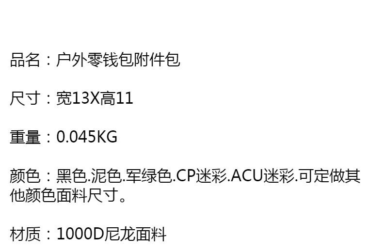 | Color | Black,Mud color,Army green,Orange red,Cp camouflage,Acu camouflage,Black cp |