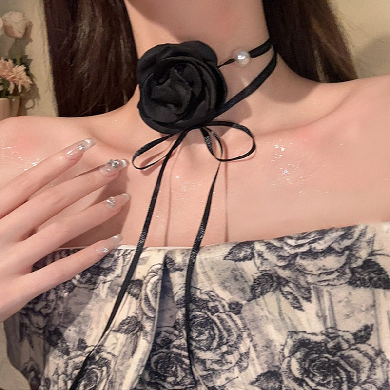 French Versatile Retro Rose Lace-Up Necklace Pearl Strap Choker Long Neck Chain Cross-Border Collarbone Chain for Women