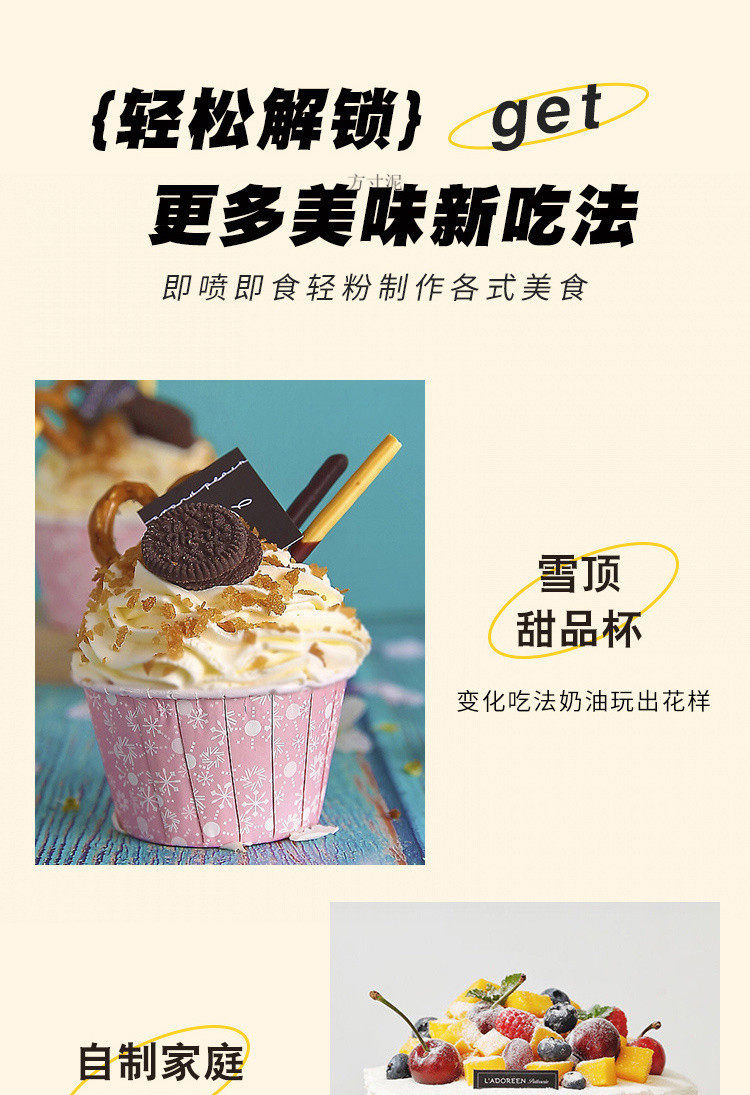 | Packaging specifications | White-pecan crushed 108g,White - crushed almonds 108g,White-frozen dried strawberry pieces 25g,White-crispy biscuit crumbs 400g,White-snow mei niang powder 1kg,White-pistachio crushed kernel 108g,White-presidential cream 250g*1 bottle,White-anjia cream 250g*1 bottle,White-datuo cream 400g*1 bottle,White-aizhen cream 500g*1 bottle,White-doppler cream 470g*1 bottle,White-dubuque cream 716g*1 bottle,White-presidential cream 250g*2 bottles |