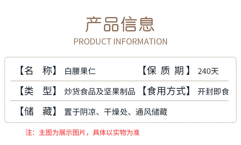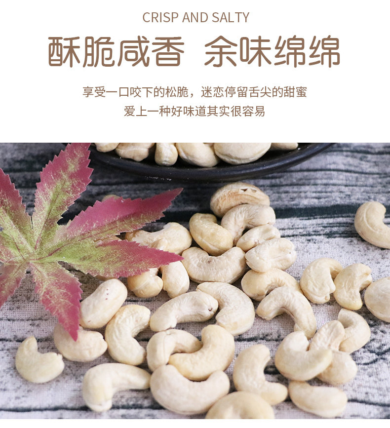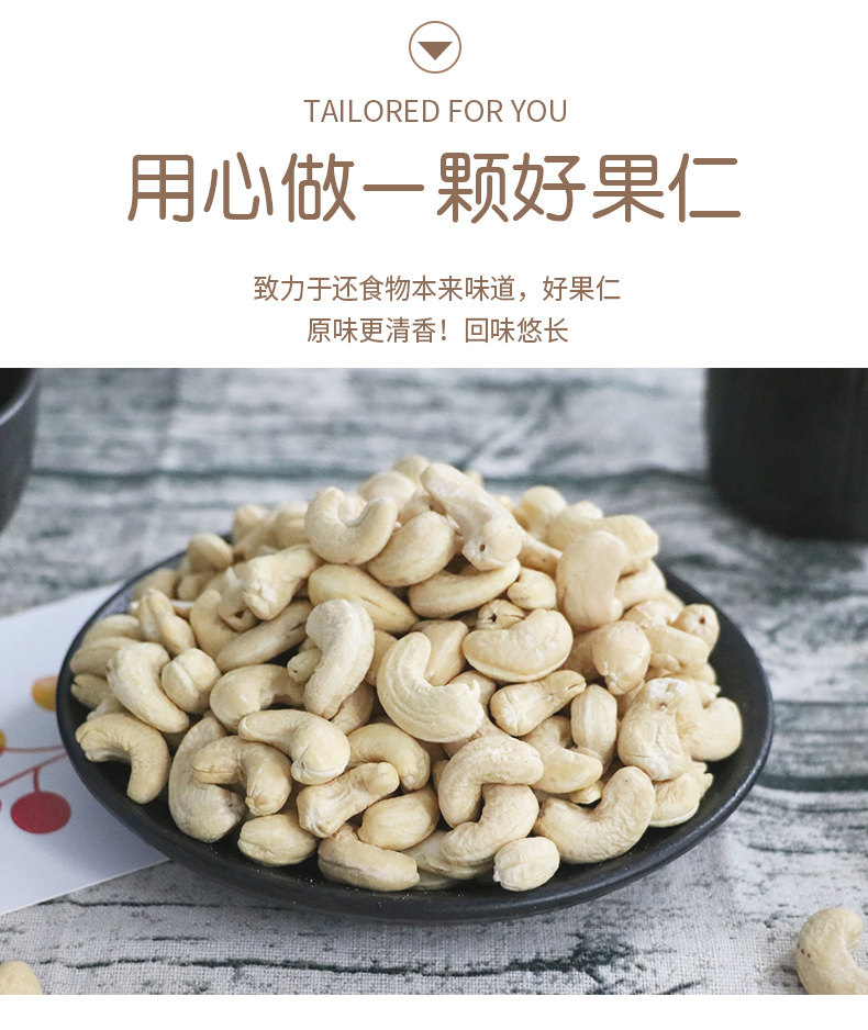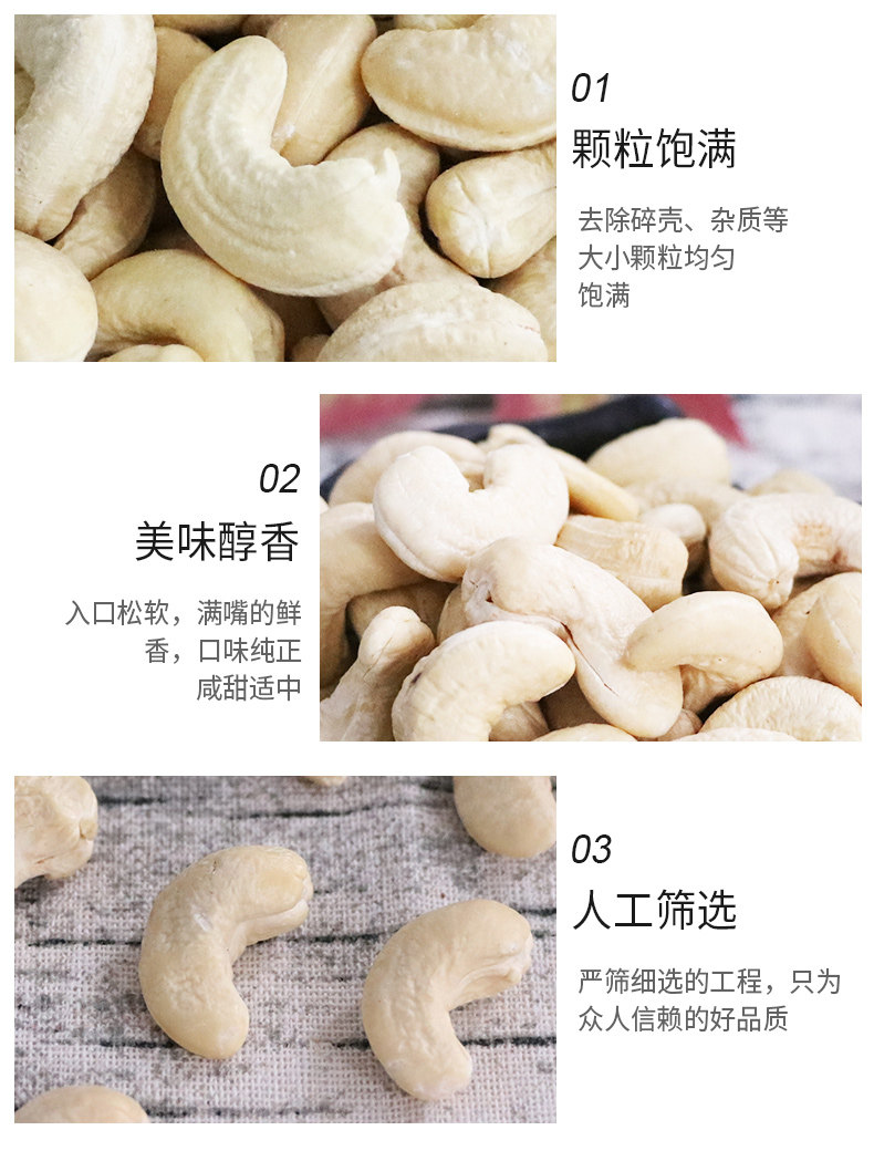 | Packaging specifications | [raw] 0.5kg : white cashew nuts net weight 500g*1 can,[raw] 1.0kg : white cashew nuts net weight 500g*2 cans,[ripe] 0.5kg : white cashew kernel net weight 500g*1 can,[ripe] 1.0kg : white cashew kernel net weight 500g*2 cans,[raw] half a catty: white cashew nuts net weight 250g*1 bag,[ripe] half a catty: white cashew nuts net weight 250g*1 bag |