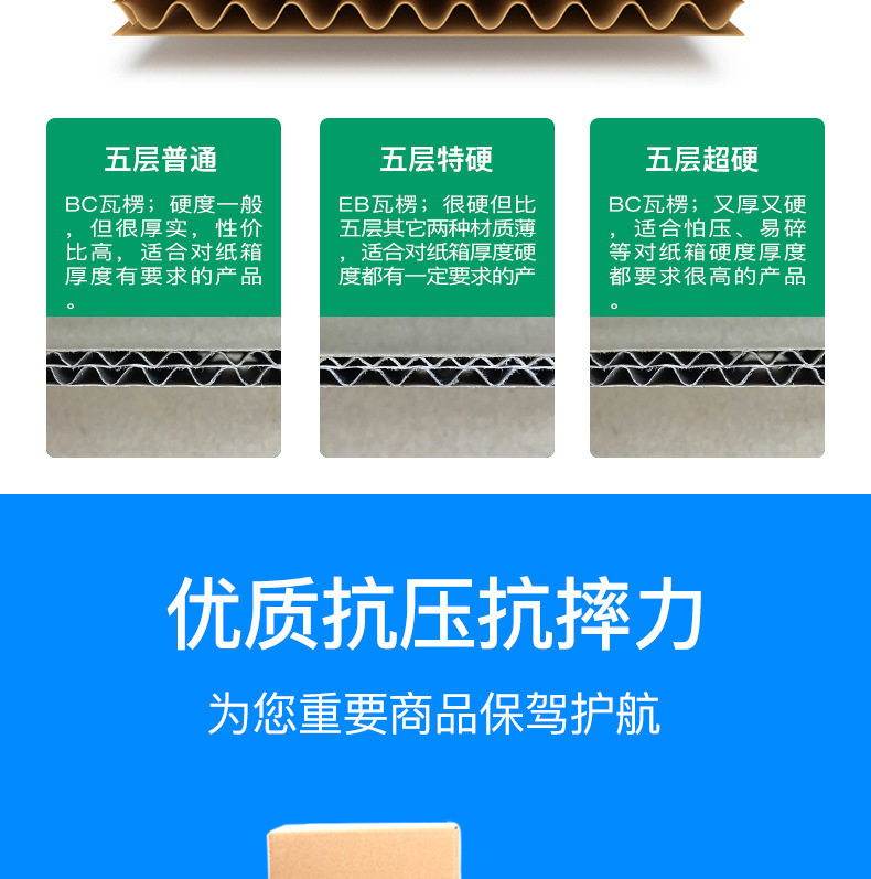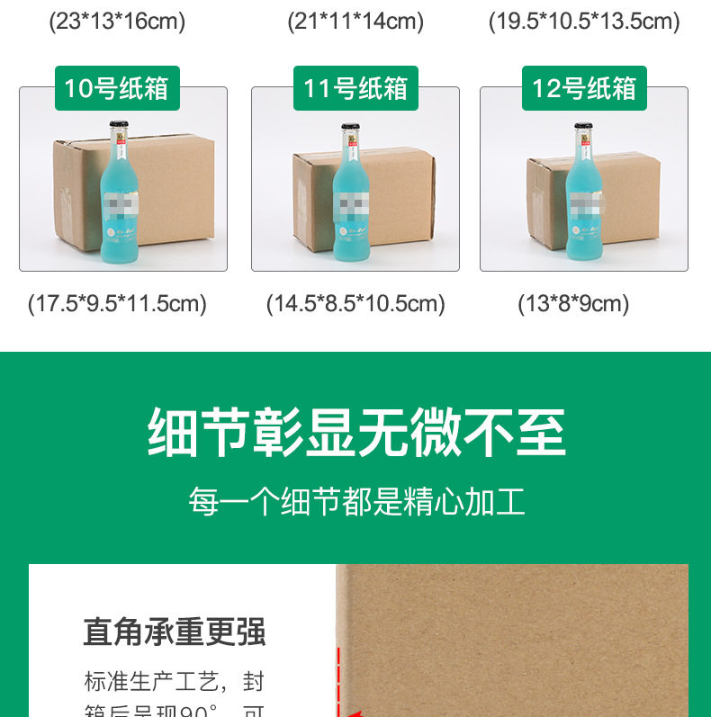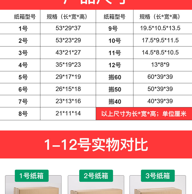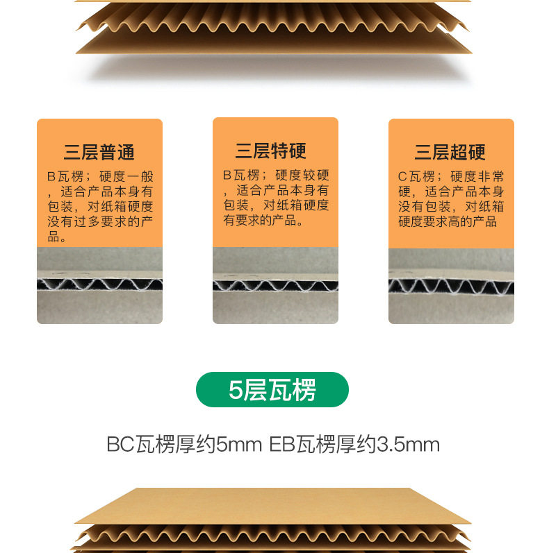 | Specifications and models | No. 12 half height (13*8*4.5); three layers of extra hard aa,No. 11 half height (14.5*8.5*5.3); three layers of extra hard aa,No. 10 half height (17.5*9.3*5.6); three layers of extra hard aa,No. 9 half height (19.5*10.5*6.8); three layers of extra hard aa,No. 8 half height (21*11*7); three layers of extra hard aa,No. 7 half height (23*13*8); three layers of extra hard aa,No. 6 half height (26*15*9); three layers of extra hard aa,No. 12 (13*8*9); three layers of extra hard aa,No. 12 (13*8*9); three-layer low-end bb,No. 12 (13*8*9); three layers of ordinary ab,No. 12 (13*8*9); three layers of super hard kk,No. 12 (13*8*9); five layers of extra hard ae (eb pit-thin),No. 12 (13*8*9); five layers of super hard nn (eb pit-thin),No. 11 (14.5*8.5*10.5); three layers of extra hard aa,No. 11 (14.5*8.5*10.5); three-layer low-end bb,No. 11 (14.5*8.5*10.5); three layers of ordinary ab,No. 11 (14.5*8.5*10.5); three layers of super hard kk,No. 11 (14.5*8.5*10.5); five layers of extra hard ae (eb pit-thin),No. 11 (14.5*8.5*10.5); five layers of super hard nn (eb pit-thin),No. 10 (17.5*9.3*11.1); three layers of extra hard aa,No. 10 (17.5*9.3*11.1); three-layer low-end bb,No. 10 (17.5*9.3*11.1); three layers of ordinary ab,No. 10 (17.5*9.3*11.1); three layers of super hard kk,No. 10 (17.5*9.3*11.1); five layers of extra hard ae (eb pit-thin),No. 10 (17.5*9.3*11.1); five-layer ordinary bb,No. 10 (17.5*9.3*11.1); five layers of super hard kk,No. 10 (17.5*9.3*11.1); five layers of super hard nn (eb pit-thin),No. 9 (19.5*10.5*13.5); three layers of extra hard aa,No. 9 (19.5*10.5*13.5); three-layer low-end bb,No. 9 (19.5*10.5*13.5); three layers of ordinary ab,No. 9 (19.5*10.5*13.5); three layers of super hard kk,No. 9 (19.5*10.5*13.5); five layers of extra hard ae (eb pit-thin),No. 9 (19.5*10.5*13.5); five-layer ordinary bb,No. 9 (19.5*10.5*13.5); five layers of super hard kk,No. 9 (19.5*10.5*13.5); five layers of super hard nn (eb pit-thin),No. 8 (21*11*14); three layers of extra hard aa,No. 8 (21*11*14); three layers of ordinary ab,No. 8 (21*11*14); three layers of super hard kk,No. 8 (21*11*14); five layers of extra hard ae (eb pit-thin),No. 8 (21*11*14); five-layer ordinary bb,No. 8 (21*11*14); five layers of super hard kk,No. 8 (21*11*14); five layers of super hard nn (eb pit-thin),No. 7 (23*13*16); three layers of extra hard aa,No. 7 (23*13*16); three layers of ordinary ab,No. 7 (23*13*16); three layers of super hard kk,No. 7 (23*13*16); five layers of extra hard ae (eb pit-thin),No. 7 (23*13*16); five-layer ordinary bb,No. 7 (23*13*16); five layers of super hard kk,No. 7 (23*13*16); five layers of super hard nn (eb pit-thin),No. 6 (26*15*18); three layers of extra hard aa,No. 6 (26*15*18); three layers of ordinary ab,No. 6 (26*15*18); three layers of super hard kk,No. 6 (26*15*18); five layers of extra hard ae (eb pit-thin),No. 6 (26*15*18); five-layer ordinary bb,No. 6 (26*15*18); five layers of super hard kk,No. 6 (26*15*18); five layers of super hard nn (eb pit-thin),No. 5 (29*17*19); three layers of extra hard aa,No. 5 (29*17*19); three layers of ordinary ab,No. 5 (29*17*19); three layers of super hard kk,No. 5 (29*17*19); five layers of extra hard ae (eb pit-thin),No. 5 (29*17*19); five-layer ordinary bb,No. 5 (29*17*19); five layers of super hard kk,No. 5 (29*17*19); five layers of super hard nn (eb pit-thin),No. 4 (35*19*23); three layers of extra hard aa,No. 4 (35*19*23); three layers of ordinary ab,No. 4 (35*19*23); three layers of super hard kk,No. 4 (35*19*23); five layers of extra hard ae (eb pit-thin),No. 4 (35*19*23); five-layer ordinary bb,No. 4 (35*19*23); five layers of super hard kk,No. 4 (35*19*23); five layers of super hard nn (eb pit-thin),No. 3 (43*21*27); three layers of extra hard aa,No. 3 (43*21*27); three layers of ordinary ab,No. 3 (43*21*27); three layers of super hard kk,No. 3 (43*21*27); five-layer ordinary bb,No. 3 (43*21*27); five layers of super hard kk,No. 2 (53*23*29); five-layer ordinary bb,No. 2 (53*23*29); five layers of super hard kk,No. 1 (53*29*37); five-layer ordinary bb,No. 1 (53*29*37); five-layer super-hard kk,Moving box (60*39*49); five-layer ordinary bb,Moving box (60*39*49); five layers of super hard kk,Moving box (50*39*39); five-layer ordinary bb,Moving box (50*39*39); five layers of super hard kk,Moving box (40*29*29); five-layer ordinary bb |