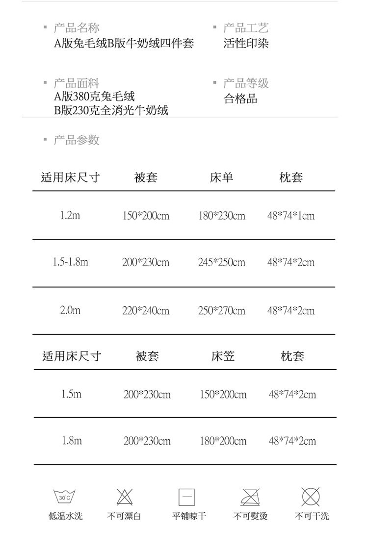 | Dimensions | 0.9- 1.2m three-piece bed sheet set [applicable to 150x200 quilt core],1.5m four-piece bed sheet set [applicable to 200x230 quilt core],1.8m four-piece bed sheet set [applicable to 200x230 quilt core],2.0m four-piece bed sheet set [applicable to 220x240 quilt core],1.5m four-piece set of fitted sheets [applicable to 200x230 quilt core],1.8m four-piece set of fitted sheets [applicable to 200x230 quilt core],1.8m four-piece set of fitted sheets [suitable for 220x240 quilt core],A rabbit down pillowcase |