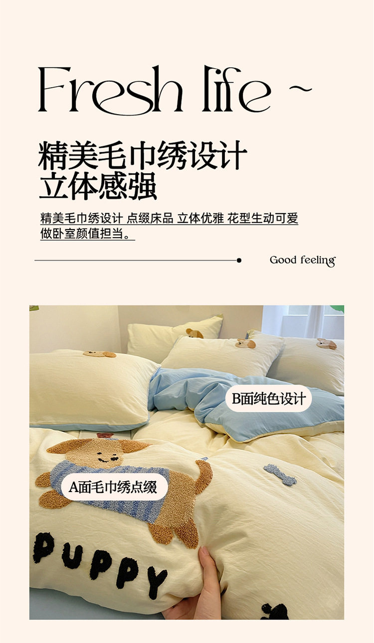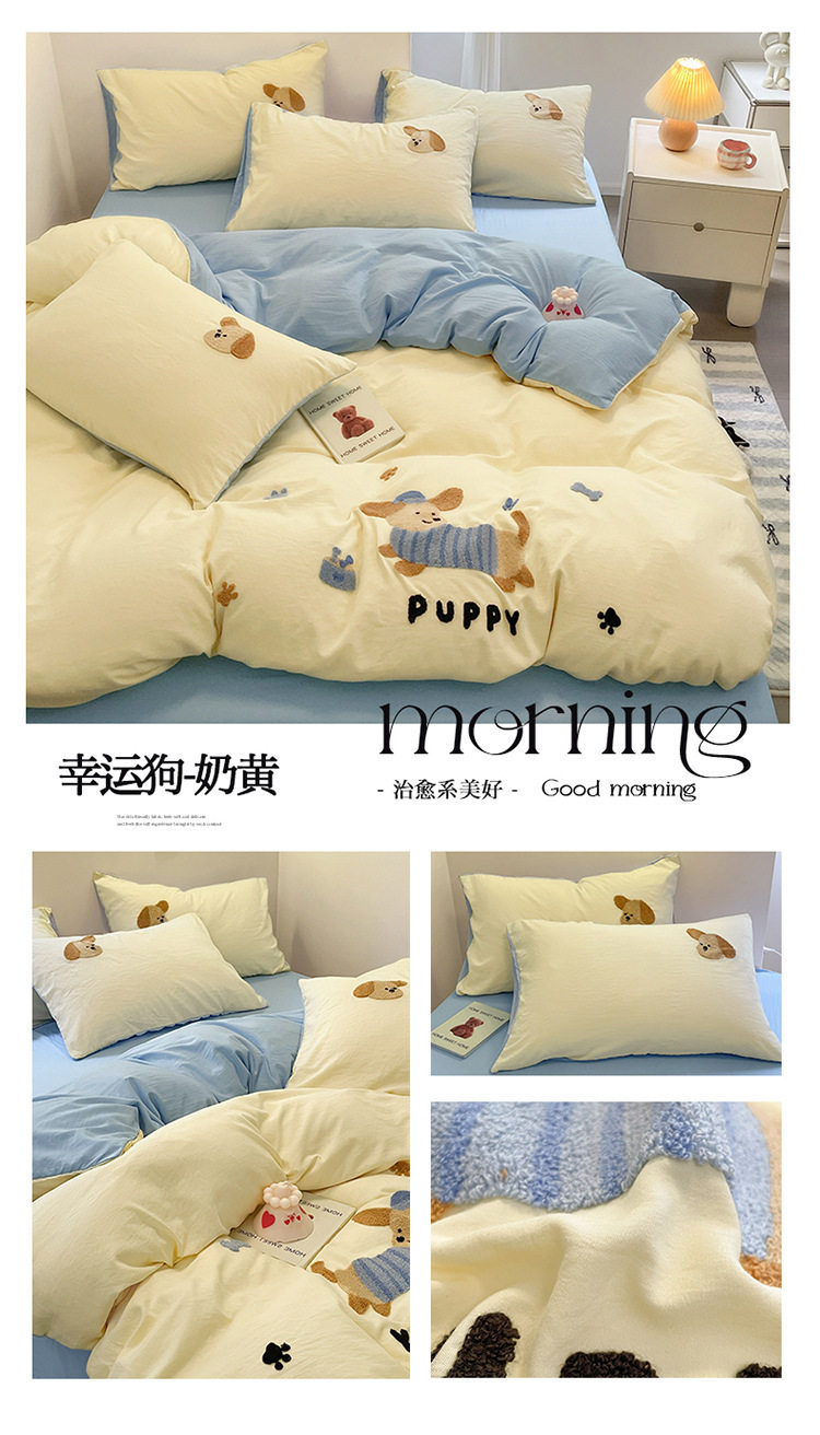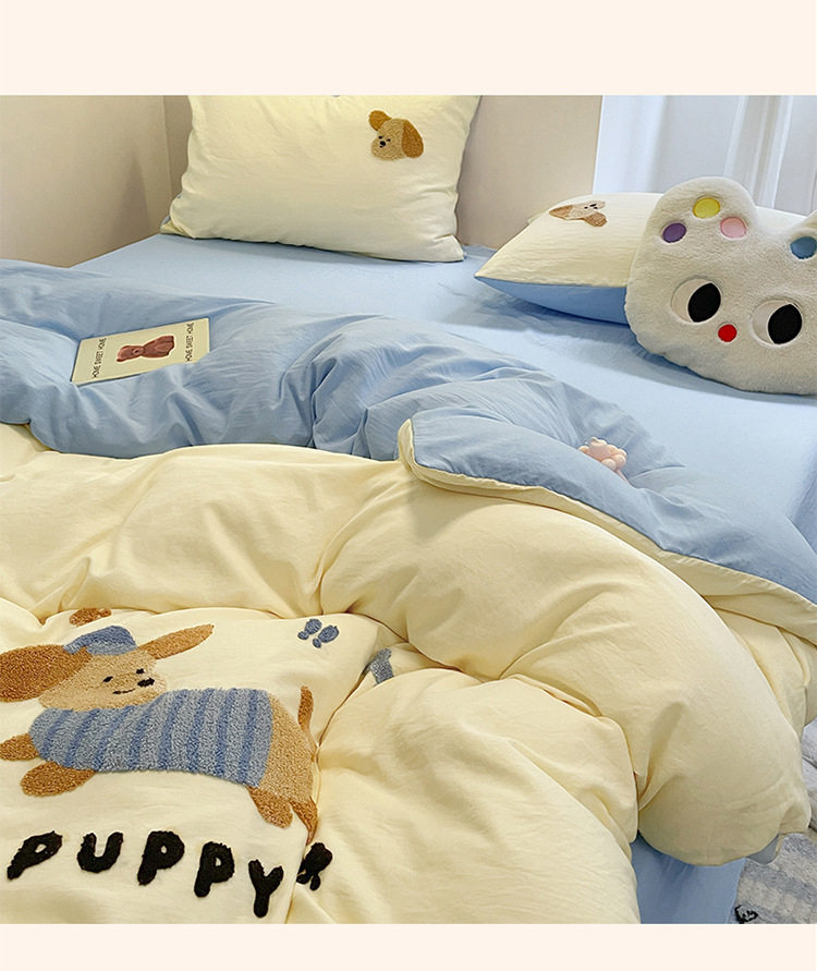 Class a Bedding Four-Piece Set Pure Color Cotton Cartoon Towel Embroidered Quilt Cover Skin-Friendly Washed Cotton Student Dormitory Cute Set