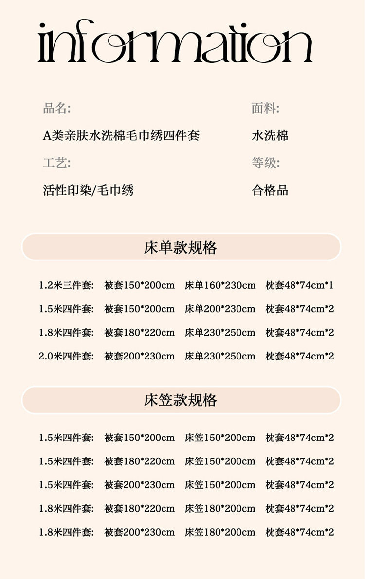 | Dimensions | 1.2m bed sheet three-piece quilt cover 150x200,1.5mbed sheets four-piece quilt cover 150x200,1.8mbed sheets four-piece quilt cover 180x220,2.0m bed sheet four-piece quilt cover 200x230,1.5m fitted sheet four-piece quilt cover 150x200,1.5m fitted sheet four-piece quilt cover 180x220,1.5m fitted sheet four-piece quilt cover 200x230,1.8m fitted sheet four-piece quilt cover 180x220,1.8m fitted sheet four-piece quilt cover 200x230 |