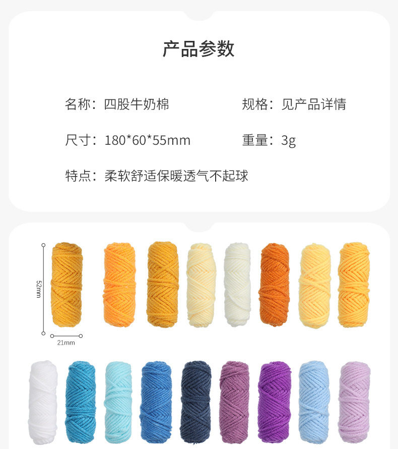 | Specifications and models | Four strands of milk cotton 1 # Skin color-3g,Four strands of milk cotton 2 # Light gray-3g,Four strands of milk cotton 3 # Pink-3g,Four strands of milk cotton 4 # Light yellow-3g,Four strands of milk cotton 5 # Willow green-3g,Four strands of milk cotton 6 # Beige-3g,Four strands of milk cotton 7 # Aqua blue-3g,Four strands of milk cotton 8 milky white-3g,Four strands of milk cotton 9 # Black-3g,Four strands of milk cotton 10 # Orange-3g,Four strands of milk cotton 11 # Olive green-3g,Four strands of milk cotton 12 # Pure white-3g,Four strands of milk cotton 13 # Goose yellow-3g,Four strands of milk cotton 14 # Chinese red-3g,Four strands of milk cotton 15 # Off-white-3g,Four strands of milk cotton 16 # Khaki-3g,Four strands of milk cotton 17 # Big green-3g,Four strands of milk cotton 18 # Khaki white-3g,Four strands of milk cotton 19 # Coffee-3g,Four strands of milk cotton 20 # Brown-3g,Four strands of milk cotton 21 # Lemon yellow-3g,Four strands of milk cotton 22 # Light purple-3g,Four strands of milk cotton 23 # Aqua green-3g,Four strands of milk cotton 24 # Fruit green-3g,Four strands of milk cotton 25 # Blue-3g,Four strands of milk cotton 26 # Bright yellow-3g,Four strands of milk cotton 27 # Lake blue-3g,Four strands of milk cotton 28 # Carmine-3g,Four strands of milk cotton 29 # Green-green-3gvv,Four strands of milk cotton 30 # Bud green-3g,Four strands of milk cotton 31 # Navy blue-3g,Four strands of milk cotton 32 # Ailu-3g,Four strands of milk cotton 33 # Purple-3g,Four strands of milk cotton 35 # Eggplant purple-3g,Four strands of milk cotton 36 # Autumn fragrance green-3g,Four strands of milk cotton 38 # Big red-3g,Four strands of milk cotton 39 # Gold-3g,Four strands of milk cotton 40 # Deep purple-3g,Four strands of milk cotton 42 # Melon yellow-3g,Four strands of milk cotton 43 # Peach powder-3g,Four strands of milk cotton 44 # Chocolate-3g,Four strands of milk cotton 45 # Dark powder-3g,Four strands of milk cotton 47 # Cherry powder-3g,Four strands of milk cotton 49 # Chicken yolk-3g,Four strands of milk cotton 50 # Carbon black-3g,Four strands of milk cotton 52 # Rust red-3g,Four strands of milk cotton 54 # Christmas green-3g,Four strands of milk cotton 57 # Evening powder-3g,Four strands of milk cotton 37 # Yalu-3g,Four strands of milk cotton 58 # Yellow powder-3g,Four strands of milk cotton 56 # Light orange powder-3g,Four strands of milk cotton 61 # Skin powder-3g,Four strands of milk cotton 59 # Royal blue-3g |