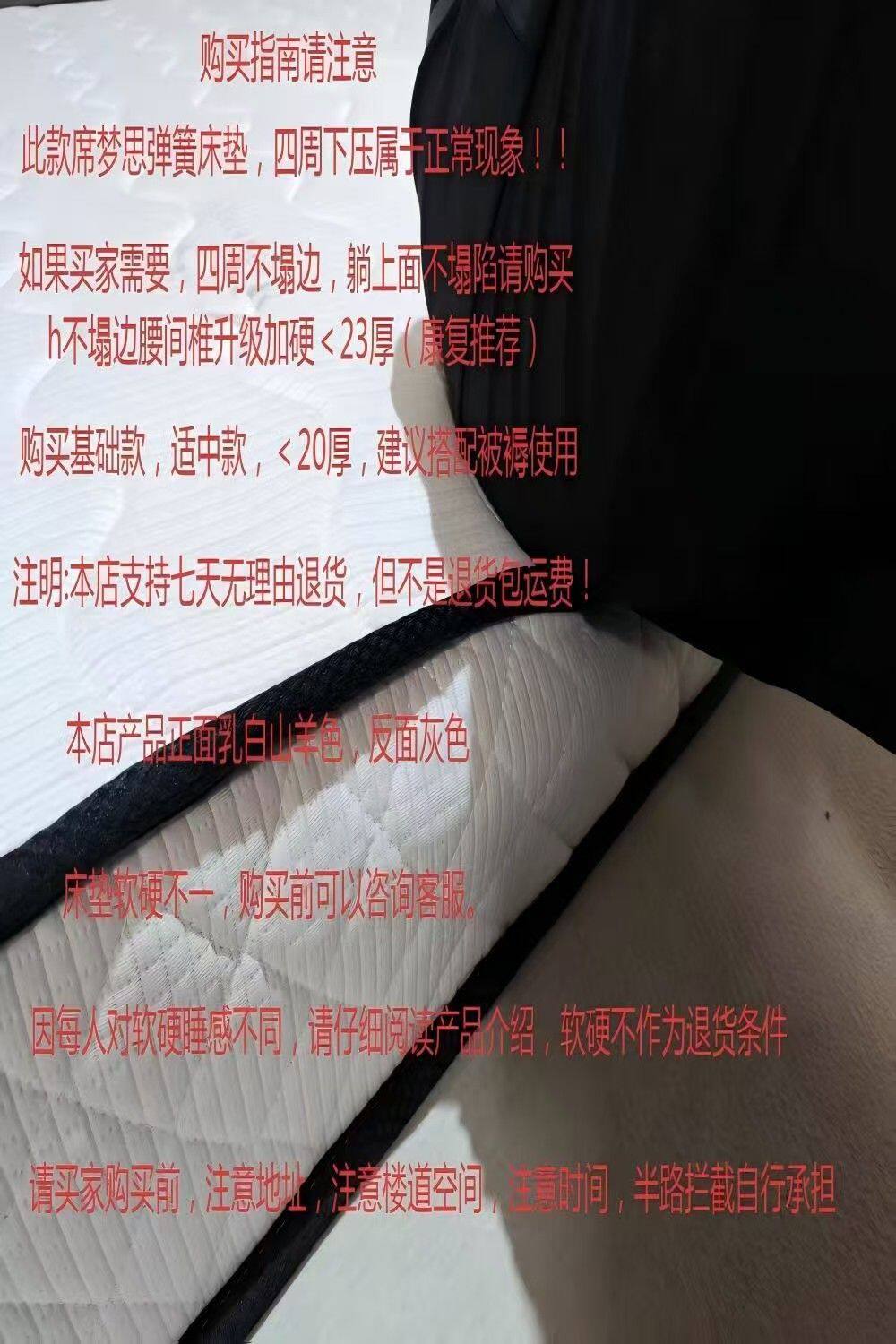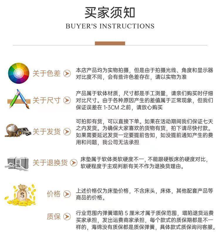 | Color | A1-economic guarantee of ten years without collapse + microsoft moderate 20 thickness,A2-durable and guaranteed not to collapse for 20 years + standard moderate thickness of 20,A4-medium compression spring + about 11 thick,A5-guaranteed not to collapse for ten years + slightly hard spine protection <22 thick,A9-guaranteed not to collapse for ten years + latex + extra comfort <22 thick,A17-hard compression spring + coconut palm about 13 thick,A10-guaranteed not to collapse for 20 years + latex + extra comfort <22 thick,A12-comfortable compression spring + latex about 13 thick,A6-guaranteed not to collapse for twenty years + hard spine protection <22 thick,A14-twenty years of non-collapse latex + reinforced soft and hard dual-use <23 thick,A16-comfortable compression spring + soft and hard dual use, about 14 thick,A18-comfortable soft pedal pressure,A13-10-year guaranteed latex + reinforced soft and hard use <23 thick,A3-30 years of non-collapse, silent single bag + moderate = 20 thick,A7-no collapse for thirty years + reinforced and hardened spine protection <22 thick,A11-30 years of non-collapse + latex + extra comfort <22 thick,A8-haima lumbar disc and cervical spine special (upgraded and hardened) 23 thickness,A15-30 years of non-collapse latex + reinforced soft and hard dual-use <23 thick |