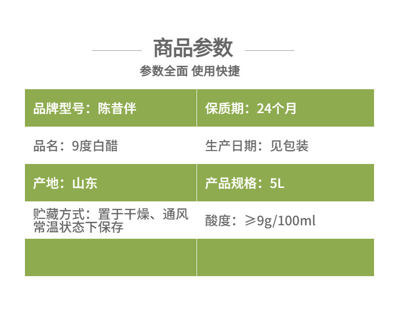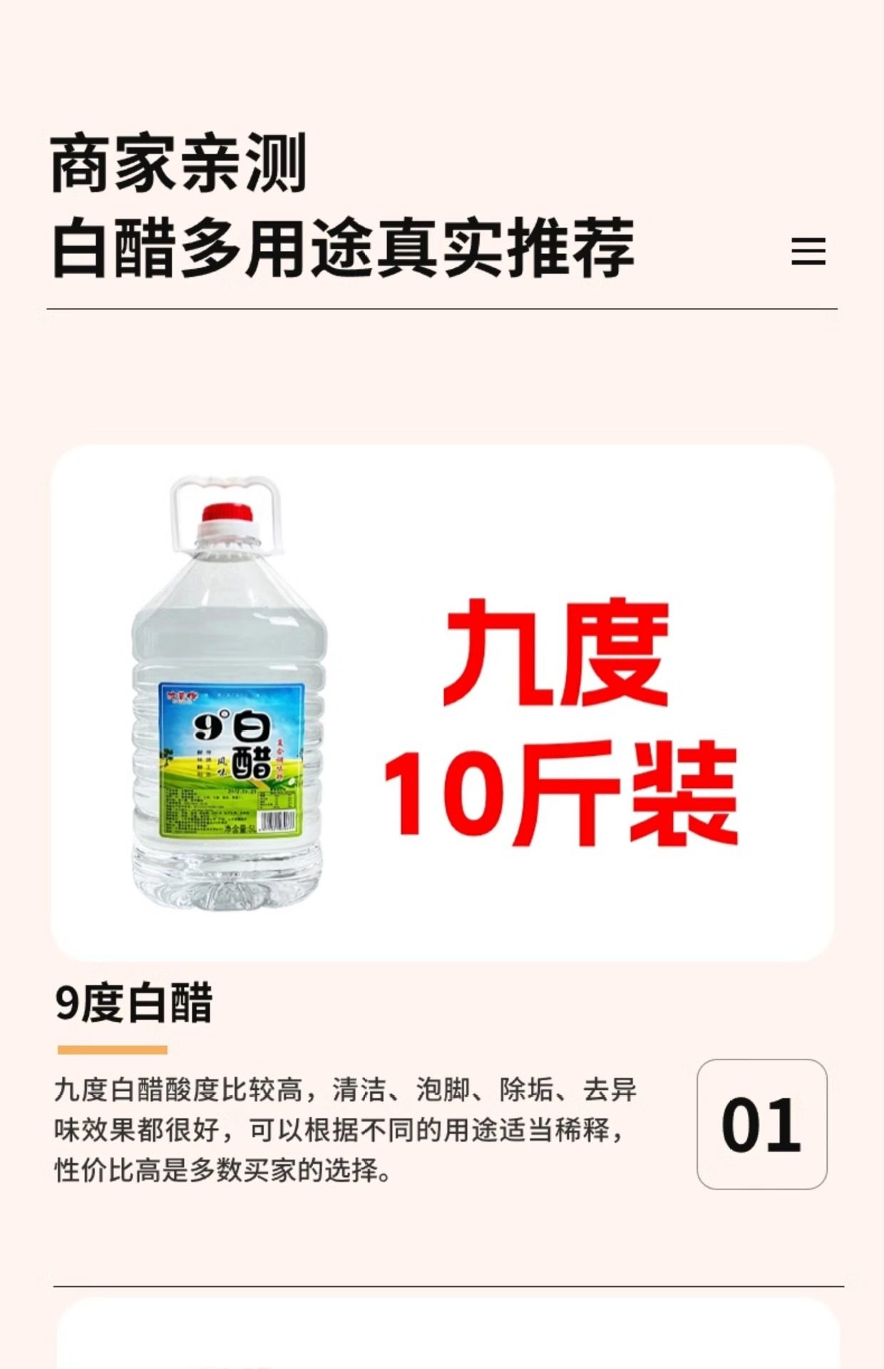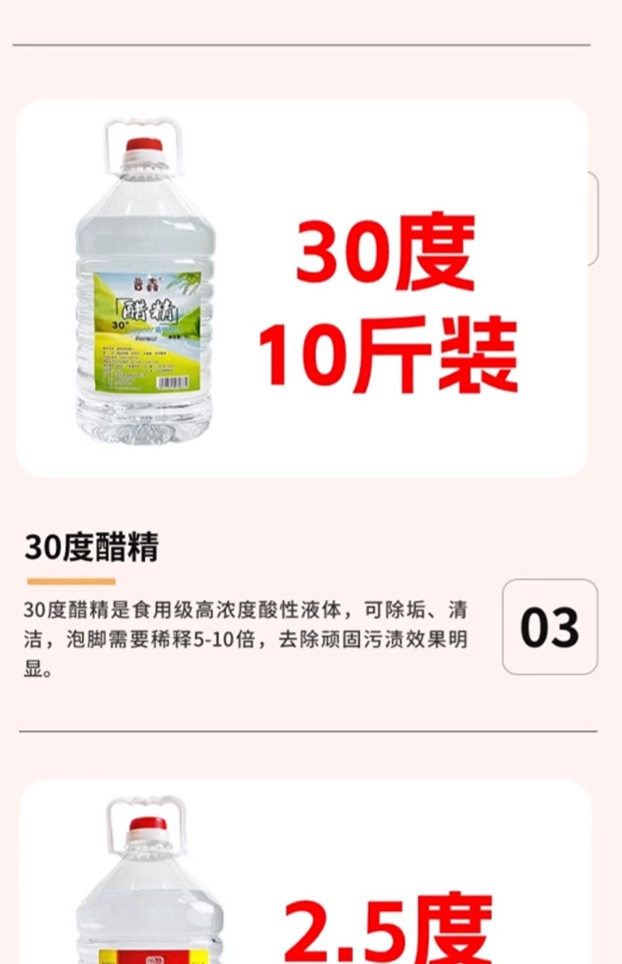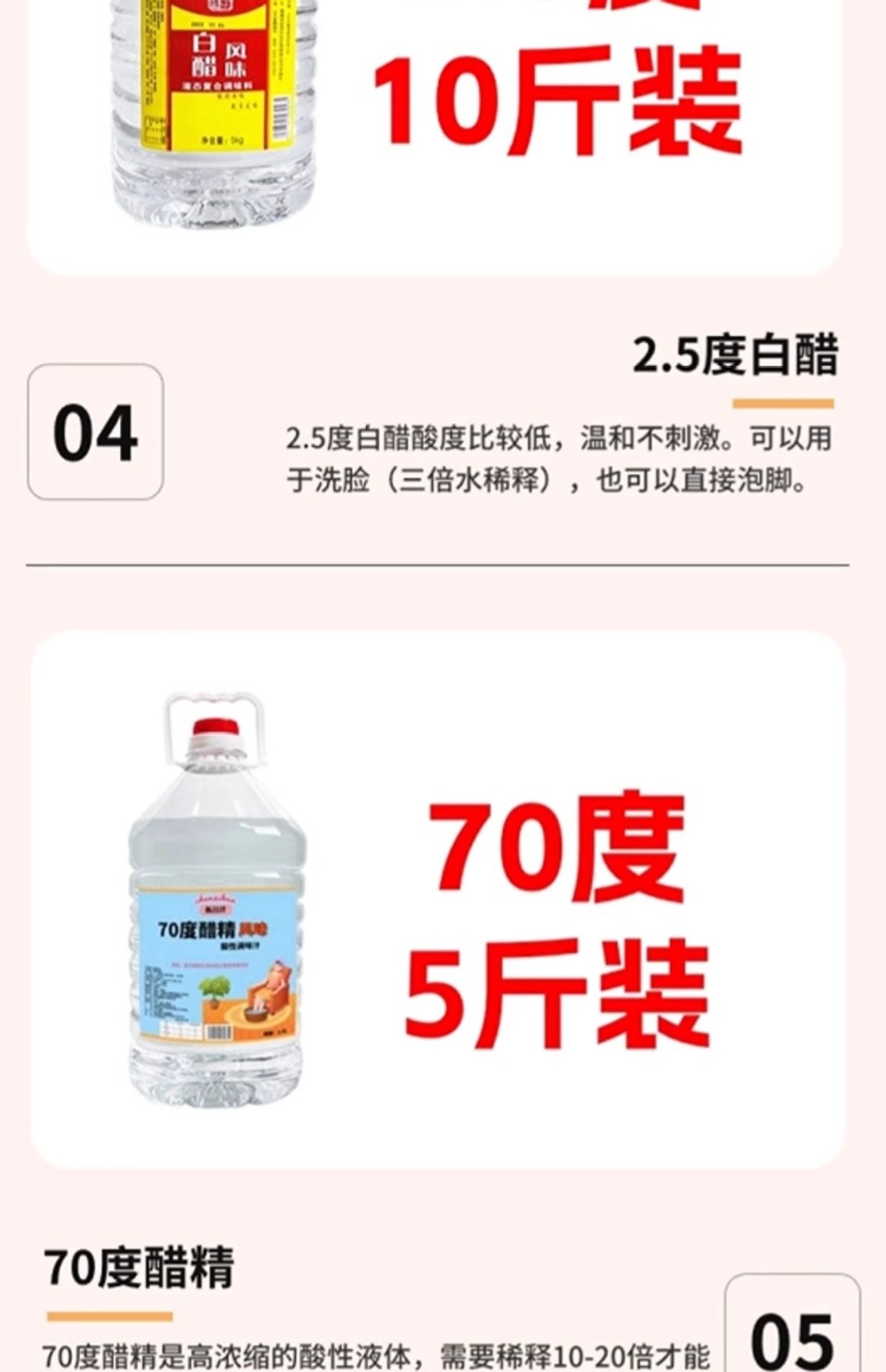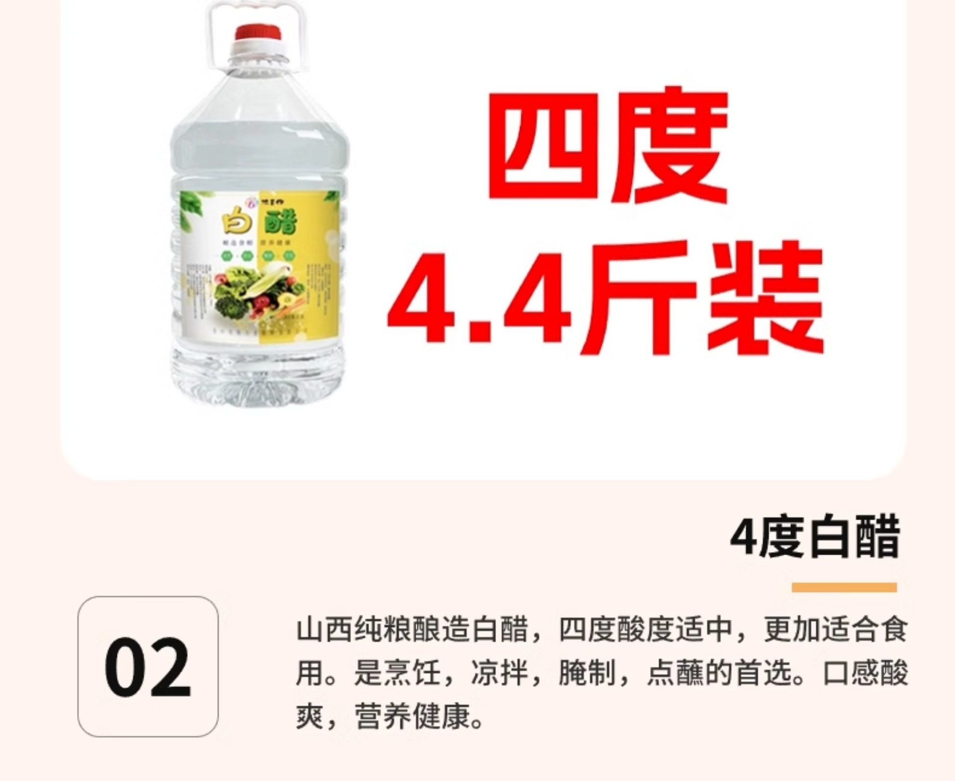 | Packaging specifications | 4 degree white vinegar bucket 2.2kg pack,9 degree white vinegar in a large barrel (color bleaching agent included),2.5 degree white vinegar in a large barrel (color bleaching agent included),30 degree vinegar essence in large barrel,Two barrels of 4 degree white vinegar, total 4.5kg,70 degree vinegar essence 2.5kg pack |