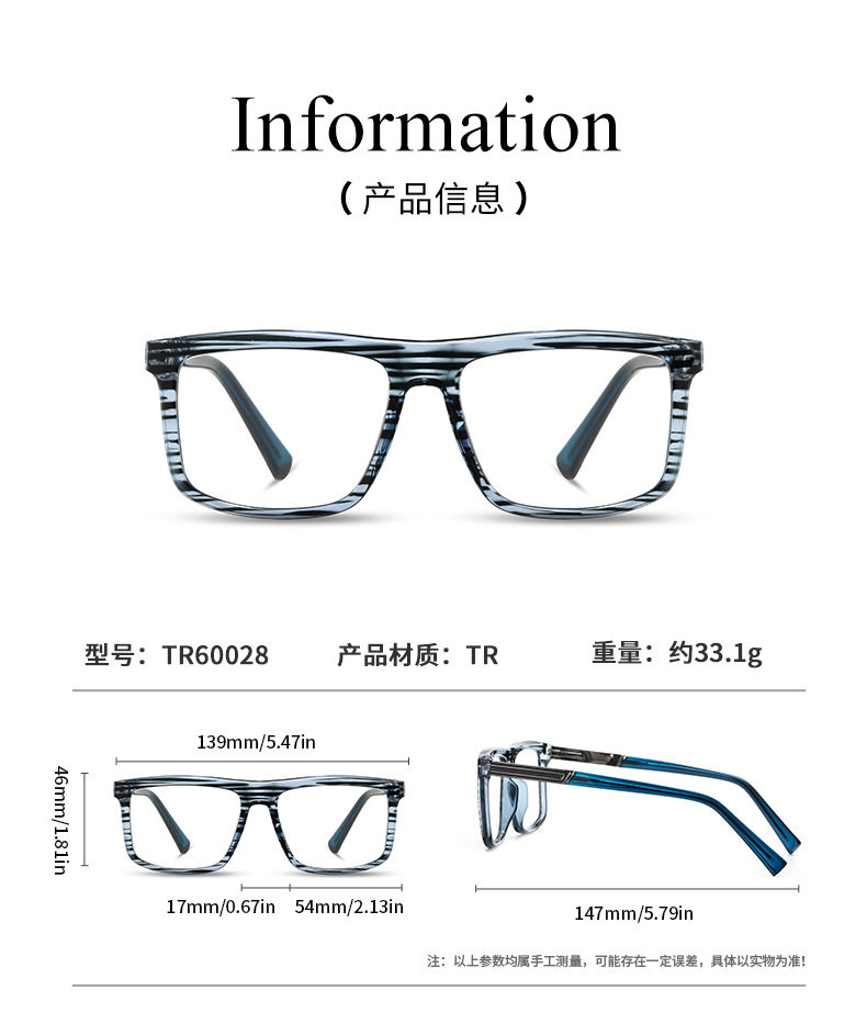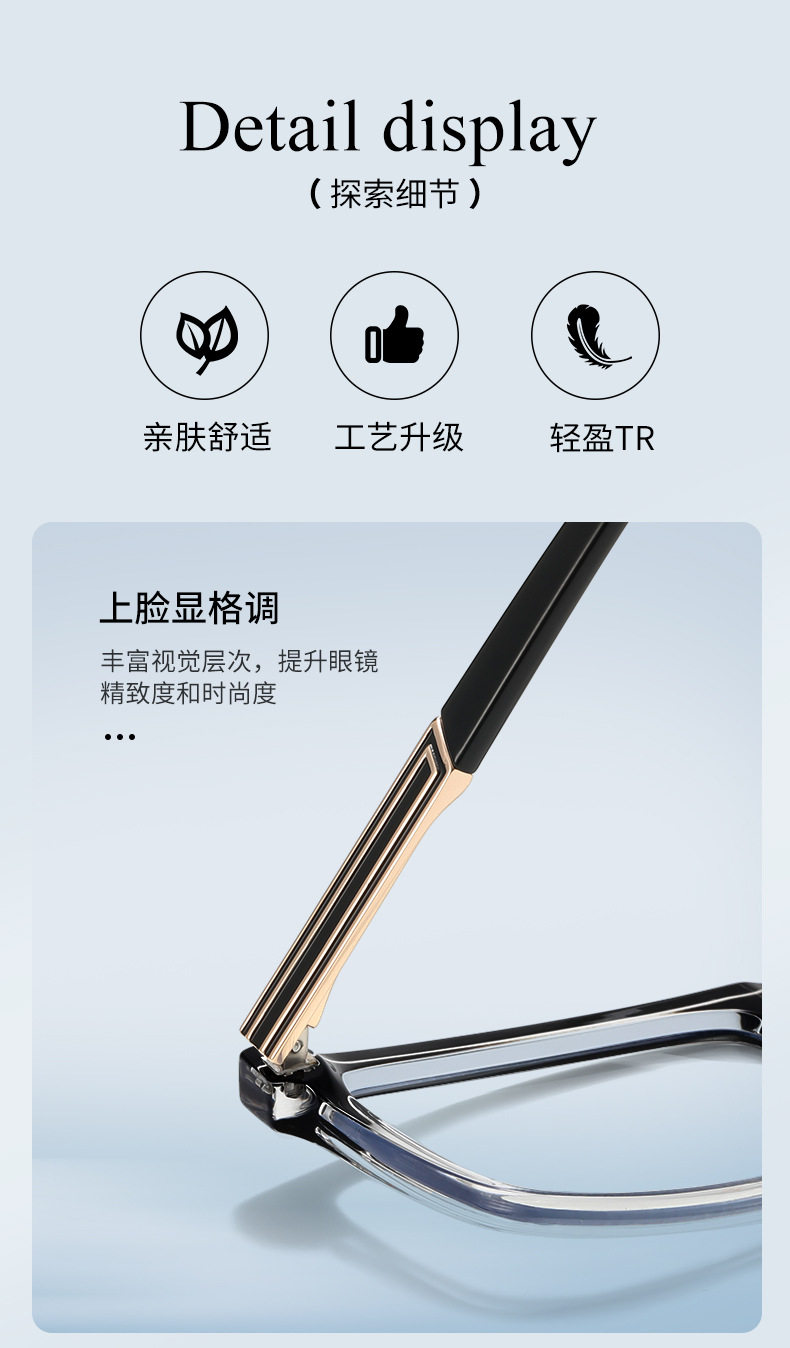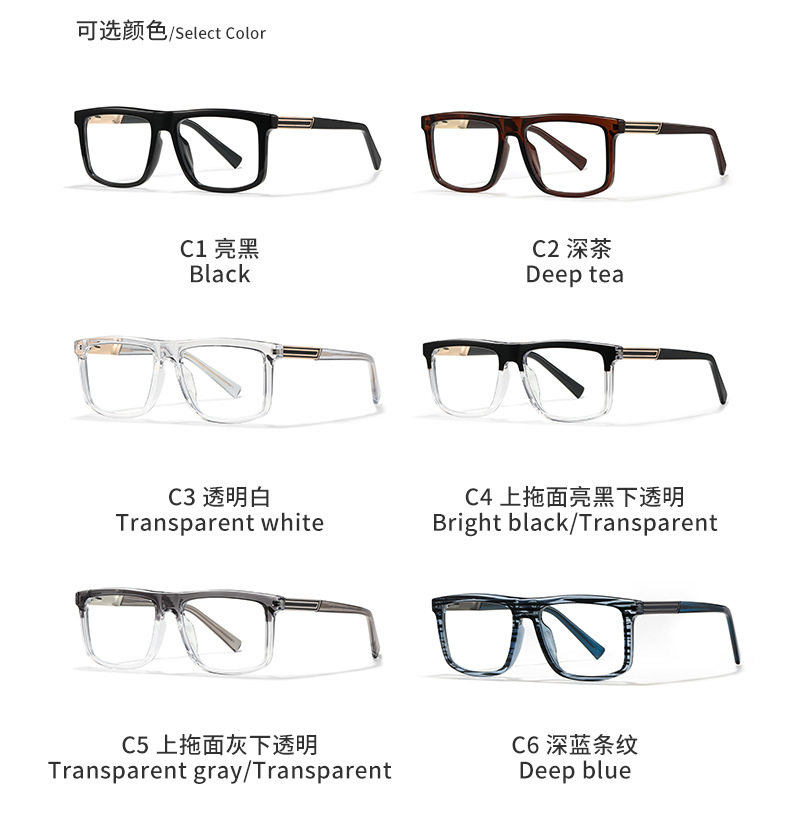 | Frame color | C1 bright black,C2 dark tea,C3 transparent white,C4 the upper surface is bright and the lower surface is transparent,C5 upper mop surface gray and lower transparent,C6 dark blue stripes |