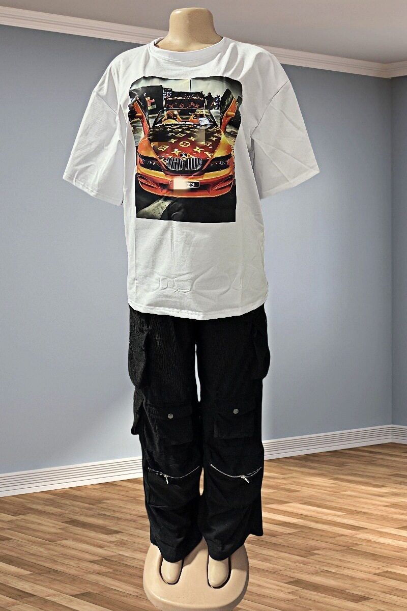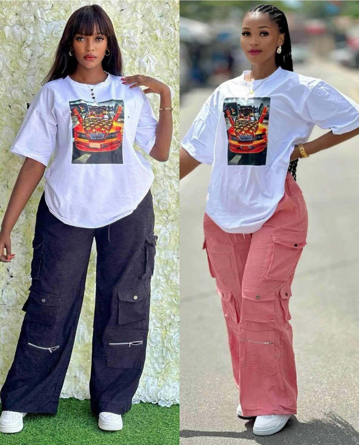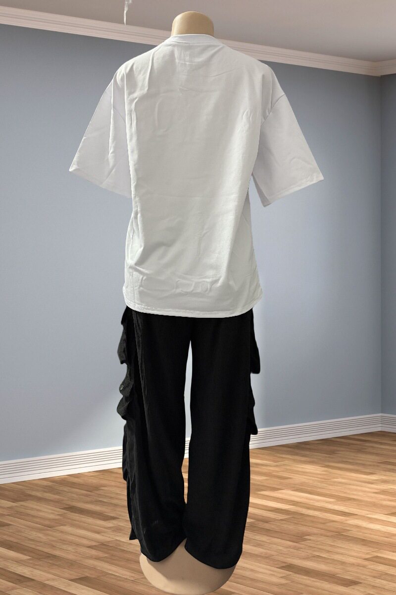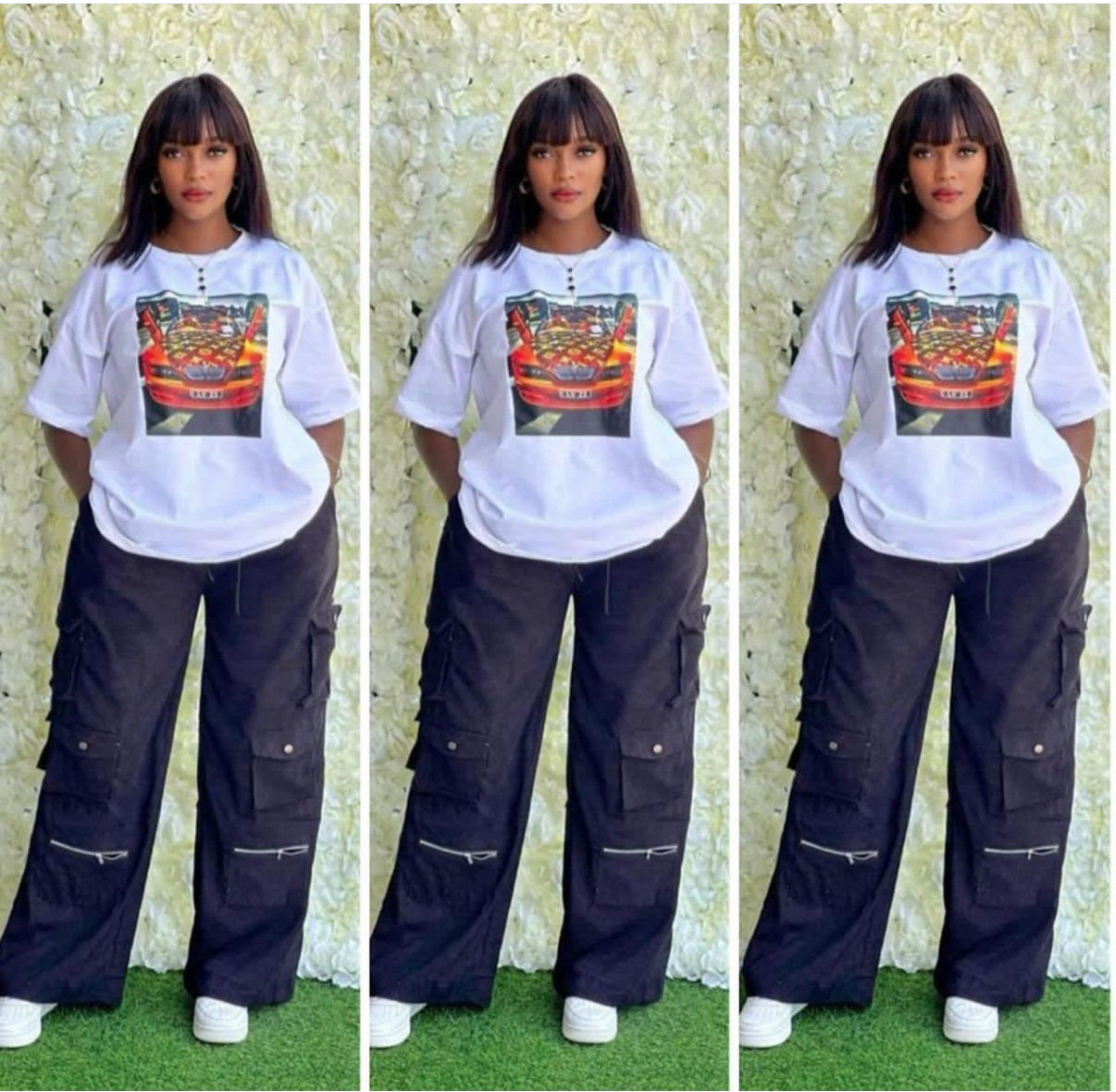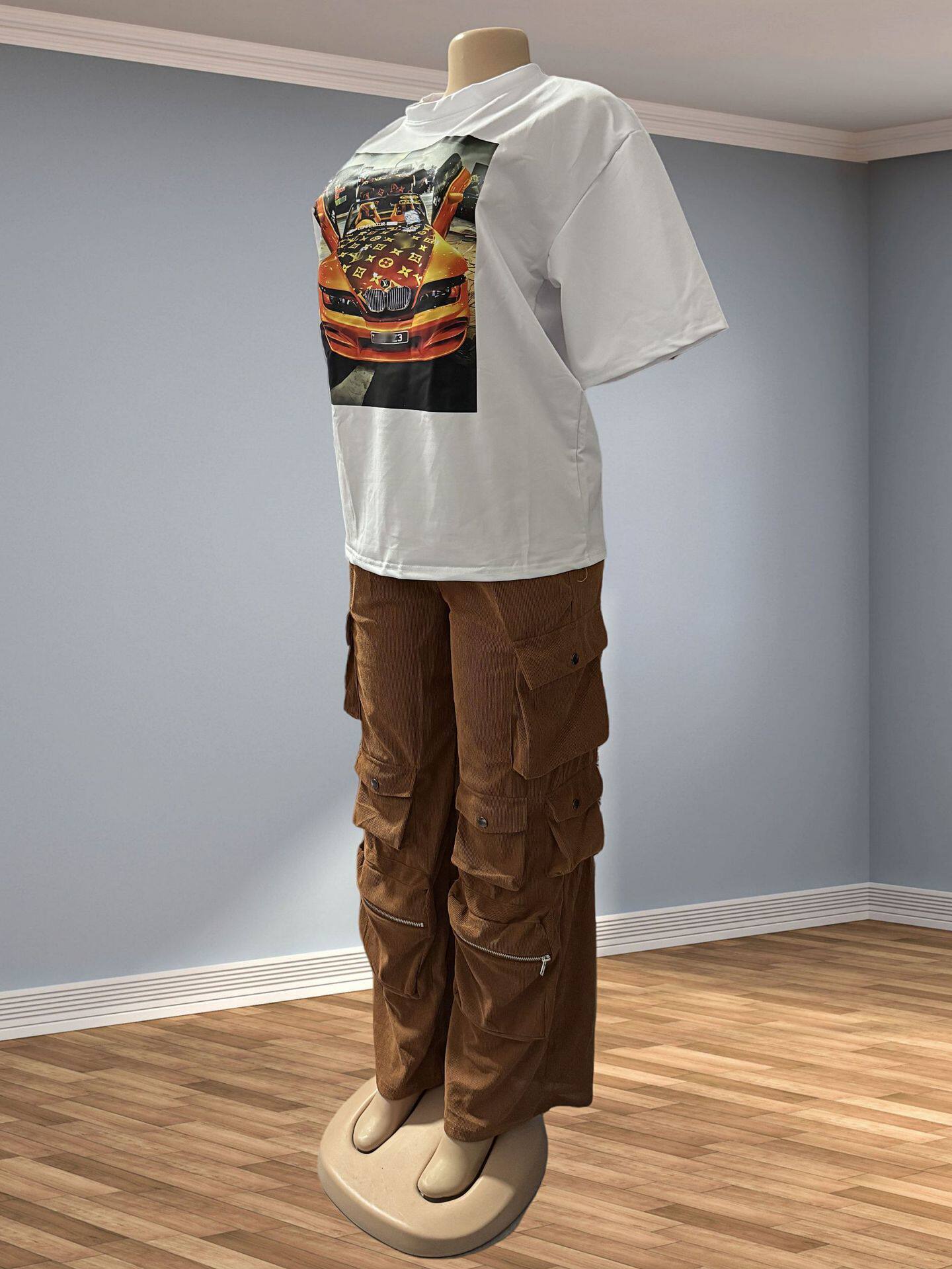 2025 Ready-Made New Hip-Hop Slimming Loose Casual Wide-Leg Cargo Pants and Heat-Printed Tops Two-Piece Set