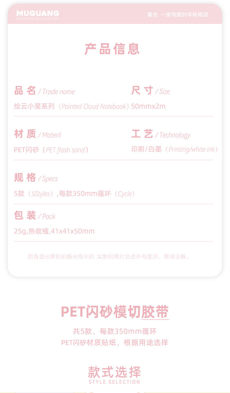 | Color | 1. milky note,2.forest cabin,3. galaxy whisper,4. floral orchard,5. holiday picnic |