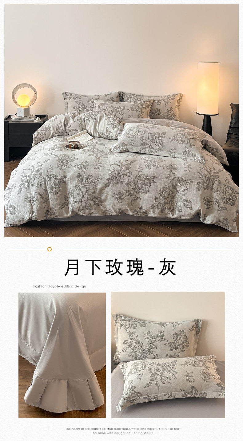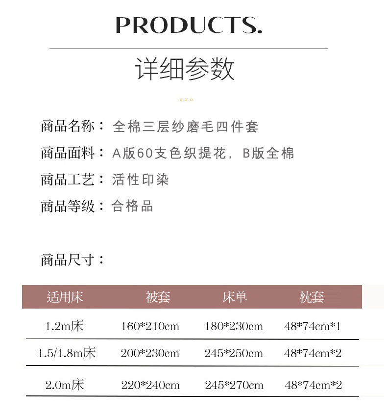 | Dimensions | Quilt cover 160*210 sheets 180*230 (three-piece set),Quilt cover 200*230 sheets 245*250 (set of four),Quilt cover 220*240 sheets 245*270 (set of four) |