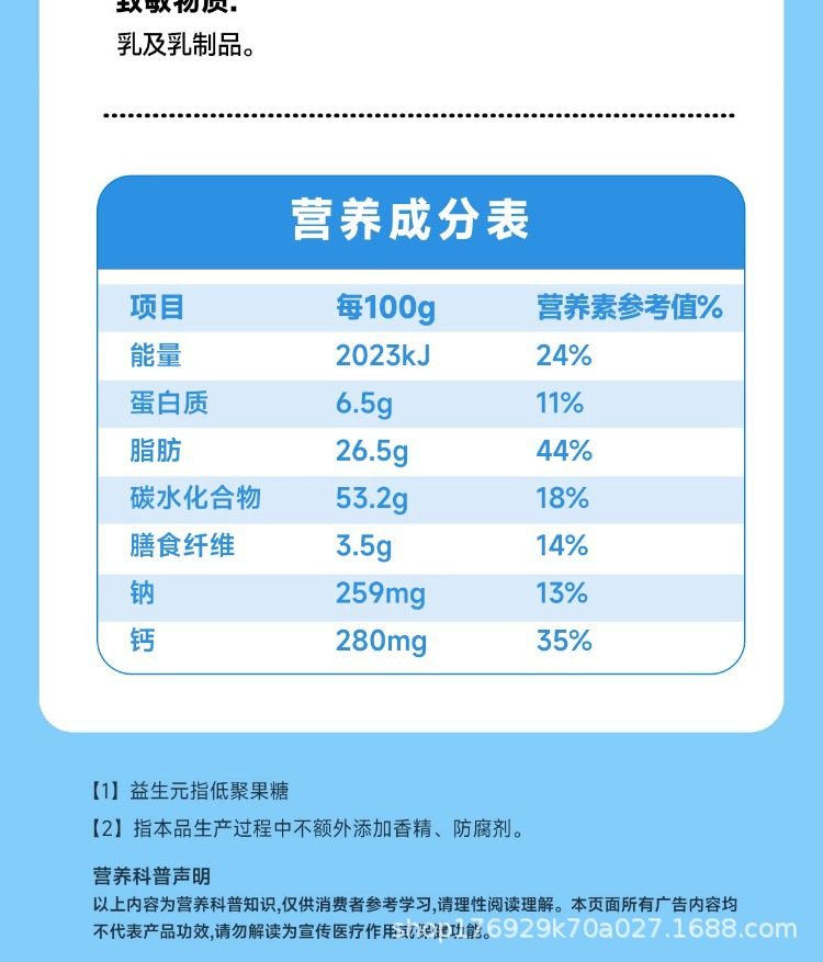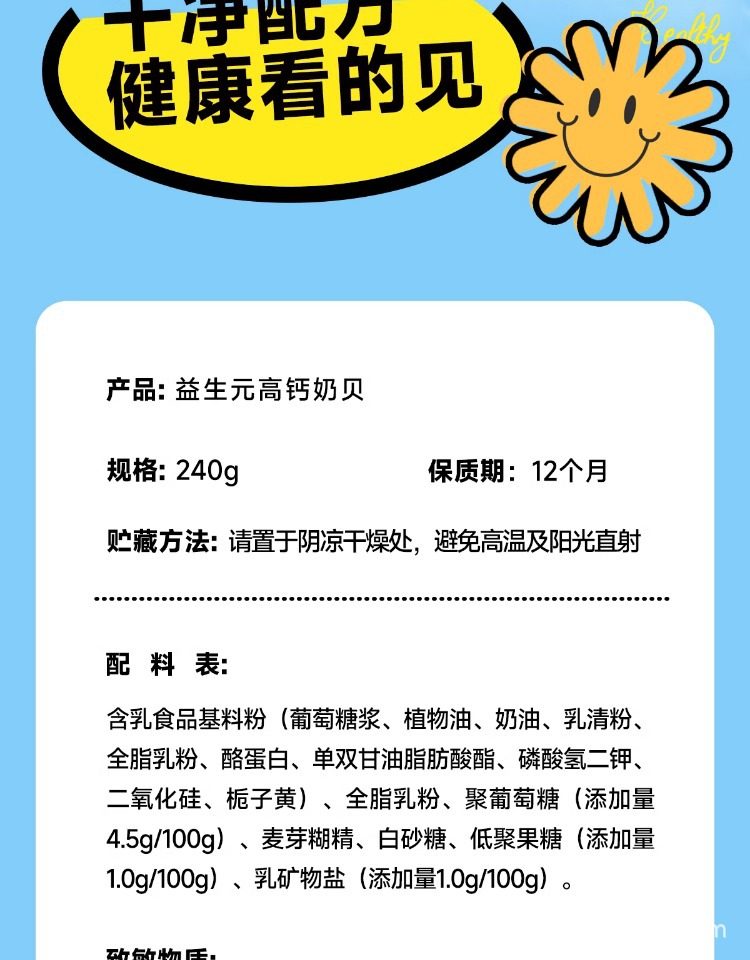 | Packaging specifications | Prebiotic high calcium milk clams 240g |