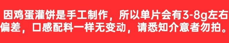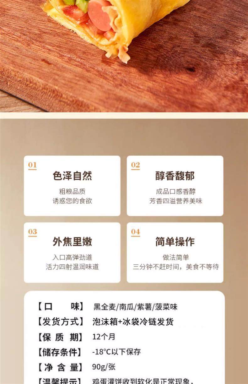 | Packaging specifications | [high-gluten flour] 90g*10 pieces [no gifts],[high-gluten flour] 90g*10 pieces [free 110g egg pancake sauce + paper bag + oil brush],[high-gluten flour] 90g*20 pieces [free 110g egg pancake sauce + paper bag + oil brush],[high-gluten flour] 90g*30 pieces [free 110g egg pancake sauce + paper bag + oil brush],10 slices each of fruit and vegetable pancakes ---- 30 pieces in total, no gifts,10 slices each of fruit and vegetable pancakes ---- 30 pieces in total [110g egg pancake sauce + paper bag + oil brush] |