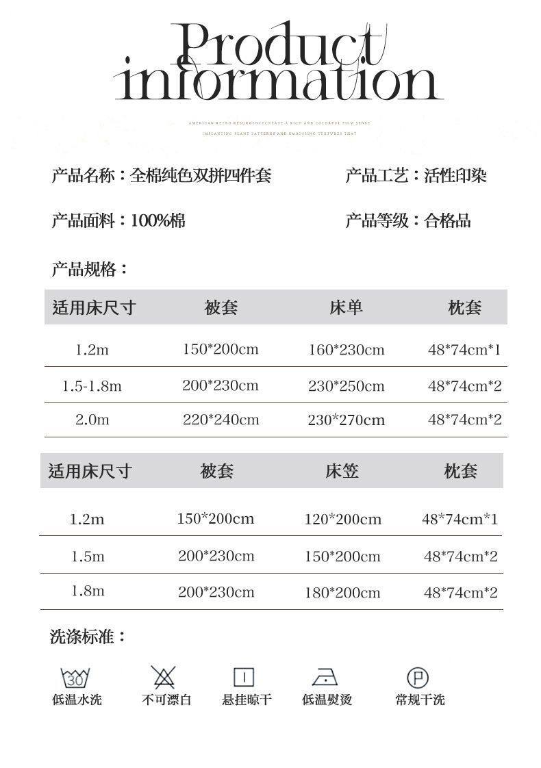 | Dimensions | 1.2 bed sheet three-piece set [quilt cover 150*200],1.5-sheet four-piece set [quilt cover 180*220],1.8-sheet four-piece set [quilt cover 180*220],1.5-sheet four-piece set [quilt cover 200*230],1.8-sheet four-piece set [quilt cover 200*230],2.0 bed sheet four-piece set [quilt cover 220*240],1.2 three-piece fitted sheet set [quilt cover 150*200],1.5 fitted sheet set of four [quilt cover 200*230],1.8 fitted sheet set of four [quilt cover 200*230],150*200cm single piece quilt cover,180*220cm single piece quilt cover,200*230cm single piece quilt cover,220*240cm single quilt cover |