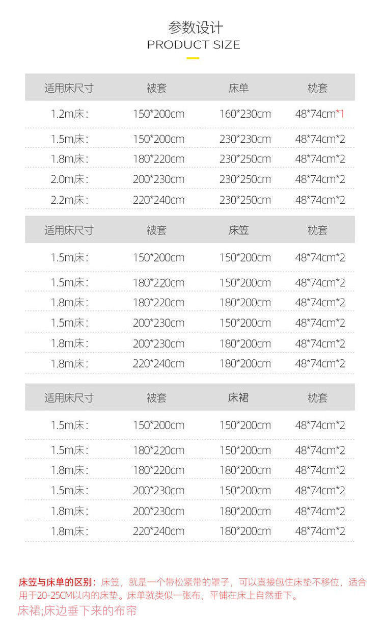 | Dimensions | 1.2 dormitory three-piece set: quilt cover 150*200,1.5bed sheets four-piece set: quilt cover 150*200,1.8bed sheets four-piece set: quilt cover 180*220,2.0bed sheets four-piece set: quilt cover 200*230,2.2bed sheets four-piece set: quilt cover 220*240 |