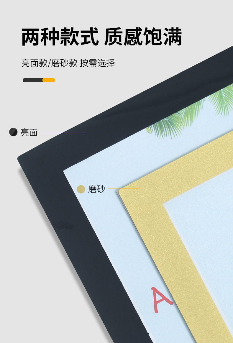 | Inner frame size | A3【29.7*42cm】—high-quality frosted model,A4【21*29.7cm】—high-quality frosted model,8 open [26.6*38.2cm]—high-quality frosted model,16 karat [26.6*19.1cm]—glossy model,4 open [38.2*53.2cm]—high-quality frosted model,A5【21*14.8cm】—high-quality frosted model,A6 14.8*10.5cm】—high-quality frosted model,A3-glossy model,A4- glossy model,A5-glossy model,8 open-glossy style,5inch - glossy style,6inch - glossy style,4 open-glossy style,Square picture frame [30*30cm]—glossy style,Square picture frame [33*33cm]—glossy style,Square picture frame [38*38cm]—glossy style,Square picture frame [50*50cm]—glossy style,A4-glossy model (special for double-sided display glass),A3-glossy model (special for double-sided display glass),A5-glossy model (special for double-sided display glass),A6-glossy model (special for double-sided display glass),8k-glossy model (for double-sided display glass only),A4-glossy model (special for single-layer display iron plates),A3-glossy model (special for single-layer display iron plates),A4-glossy model (special for double-page display iron plates),A3-glossy model (special for double-page display iron plates),A2 (60× 40cm inner frame size) glossy model, two packs,50× 70cm (inner frame size) glossy model, two packs,60× 80cm (inner frame size) glossy model, two packs,60* 90cm (inner frame size) glossy model, two packs |