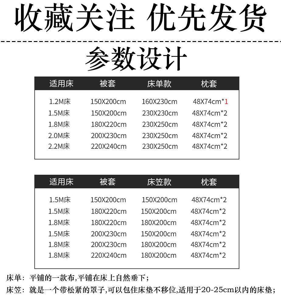 | Dimensions | 1.2 dormitory three-piece set, quilt cover 150x200,1.5 bed sheets four-piece set, quilt cover 150x200,1.8bed sheets four-piece set, quilt cover 180x220,2.0bed sheets four-piece set, quilt cover 200x230,1.5m fitted sheet set of four, quilt cover 150x200,2.2bed sheets four-piece set, quilt cover 220x240,1.5m fitted sheet set of four, quilt cover 180x220,1.8m fitted sheet set of four, quilt cover 180x220,1.5m fitted sheet four-piece set, duvet cover 200x230 cm,1.8m fitted sheet four-piece set, duvet cover 200x230cm,1.8m fitted sheet four-piece set, duvet cover 220x240cm |