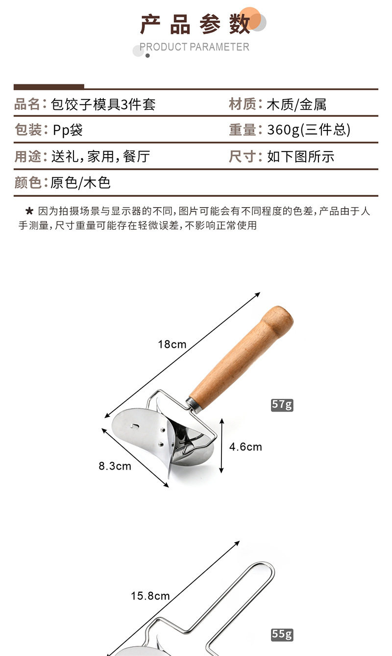 | Specification | 430 stainless steel dumpling mold [bag],430 stainless steel skin roller [bag],Stainless steel skin roller with wooden handle [bag] |