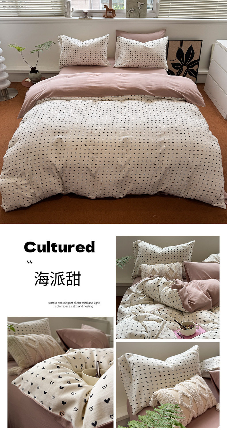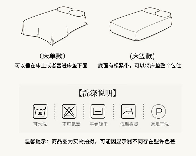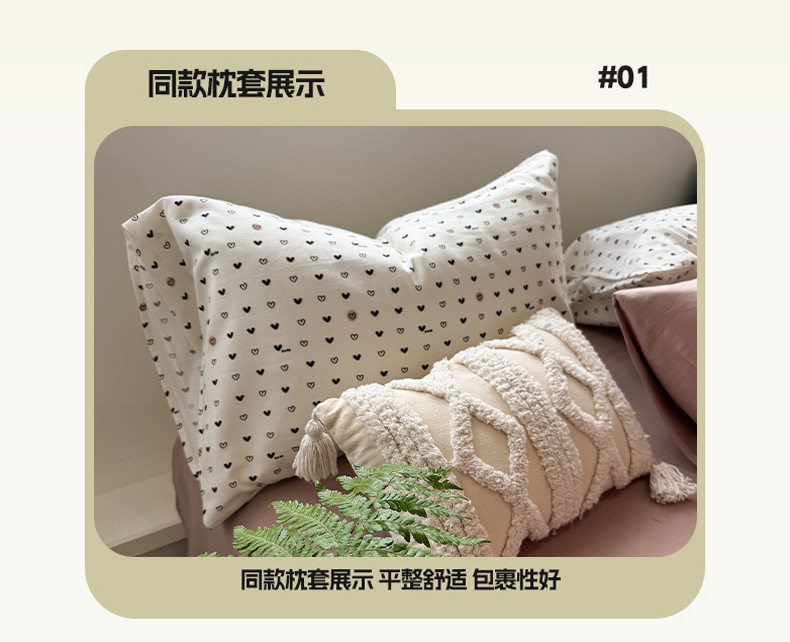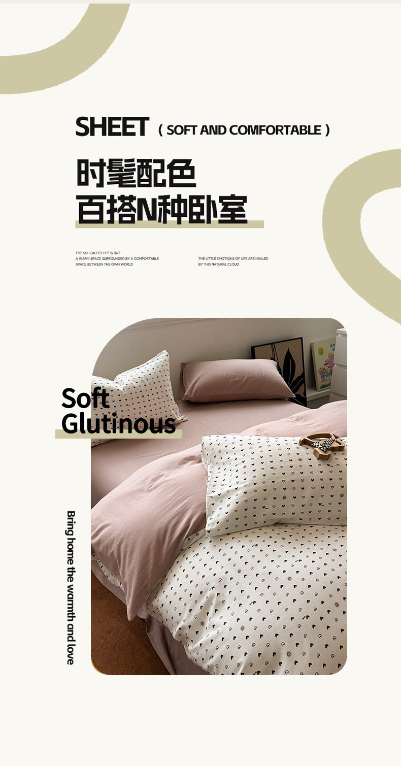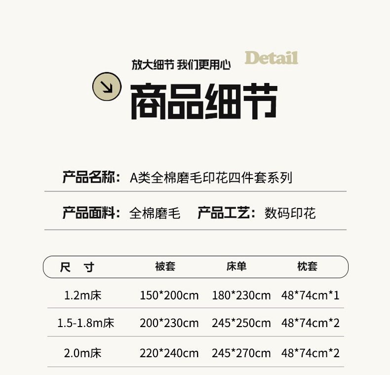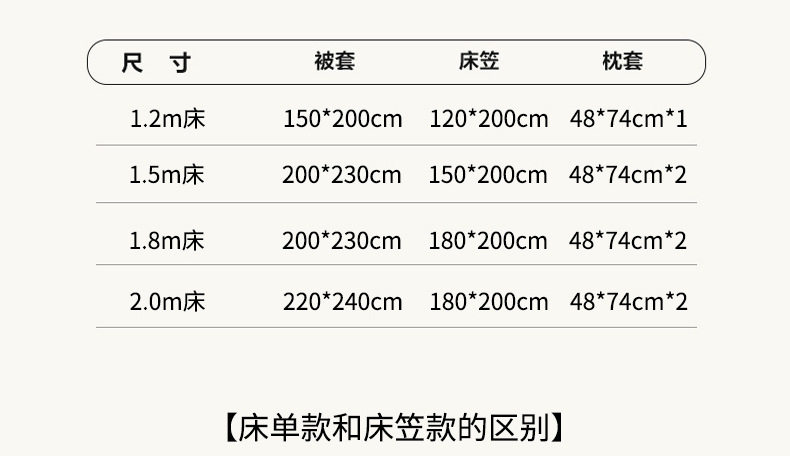 | Dimensions | 1.2m bed sheet three-piece set | Suitable for 150x200 quilt core,1.5m bed sheet four-piece set | Suitable for 200x230 quilt core,1.8m bed sheet four-piece set | Suitable for 200x230 quilt core,2.0m bed sheet four-piece set | Suitable for 220x240 quilt core,1.2m fitted sheet three-piece set | Suitable for 150x200 quilt core,1.5m fitted sheet set of four | Suitable for 200x230 quilt core,1.8m fitted sheet set of four | Suitable for 200x230 quilt core,Extra large quilt cover 1.8m fitted sheet set of four | Suitable for 220x240 quilt core |