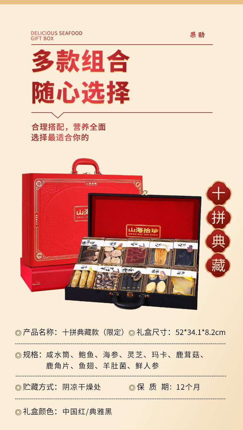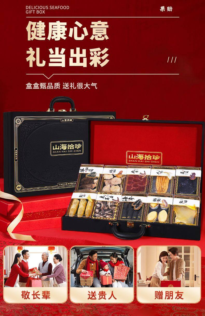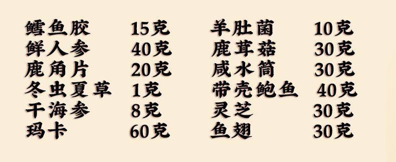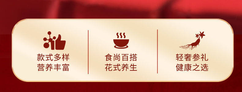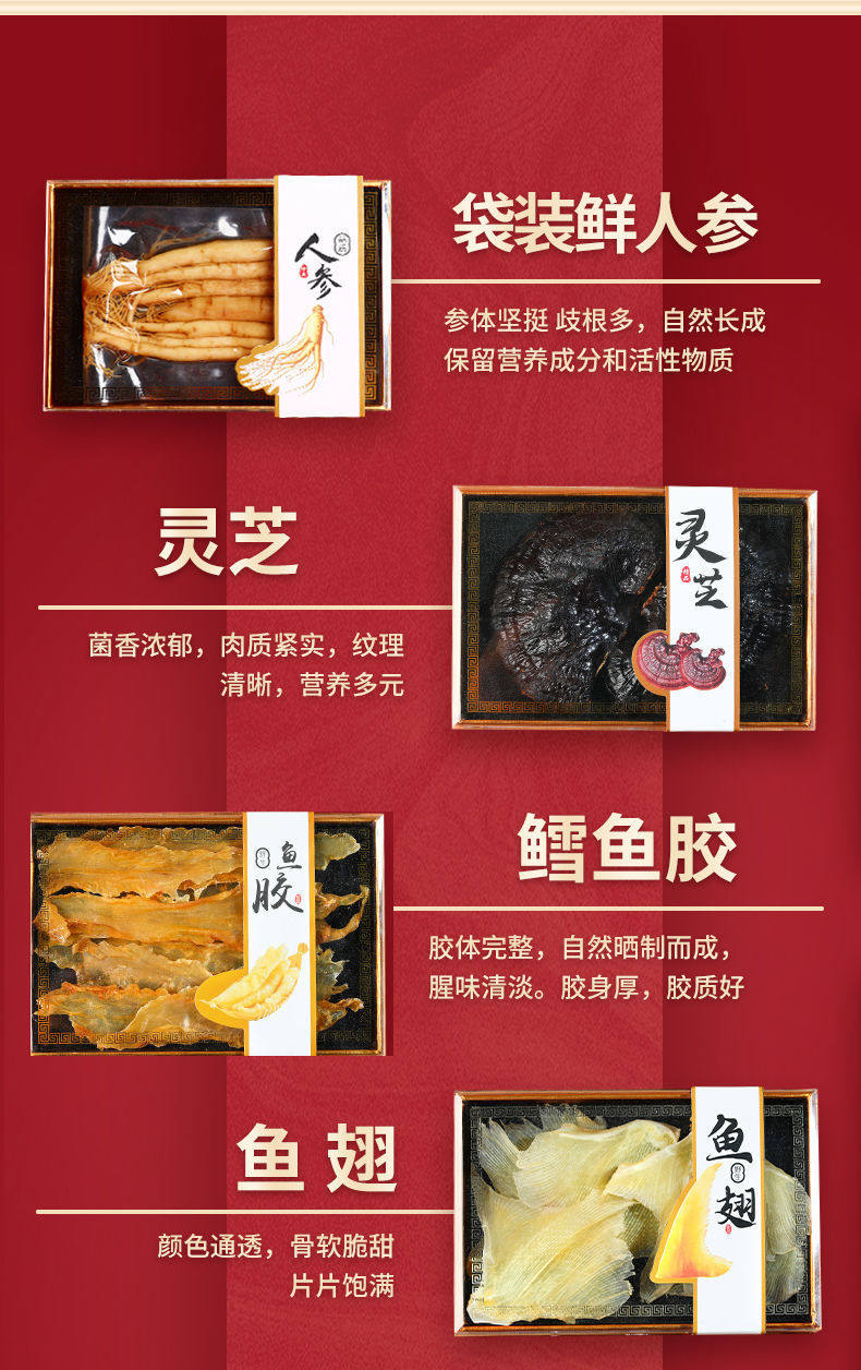 | Packaging specifications | The ultimate gift [ten fresh ginseng style] chinese red,The ultimate gift [ten pieces of fresh ginseng] dazzling black,Enjoy light luxury [eight pin fresh ginseng style] chinese red,Enjoy light luxury [eight pin fresh ginseng style] dazzling black,Classic delicacies from mountains and seas [four-piece ginseng and abalone style] chinese red,Classic delicacies from mountains and seas [four-piece ginseng and abalone style] dazzling black |