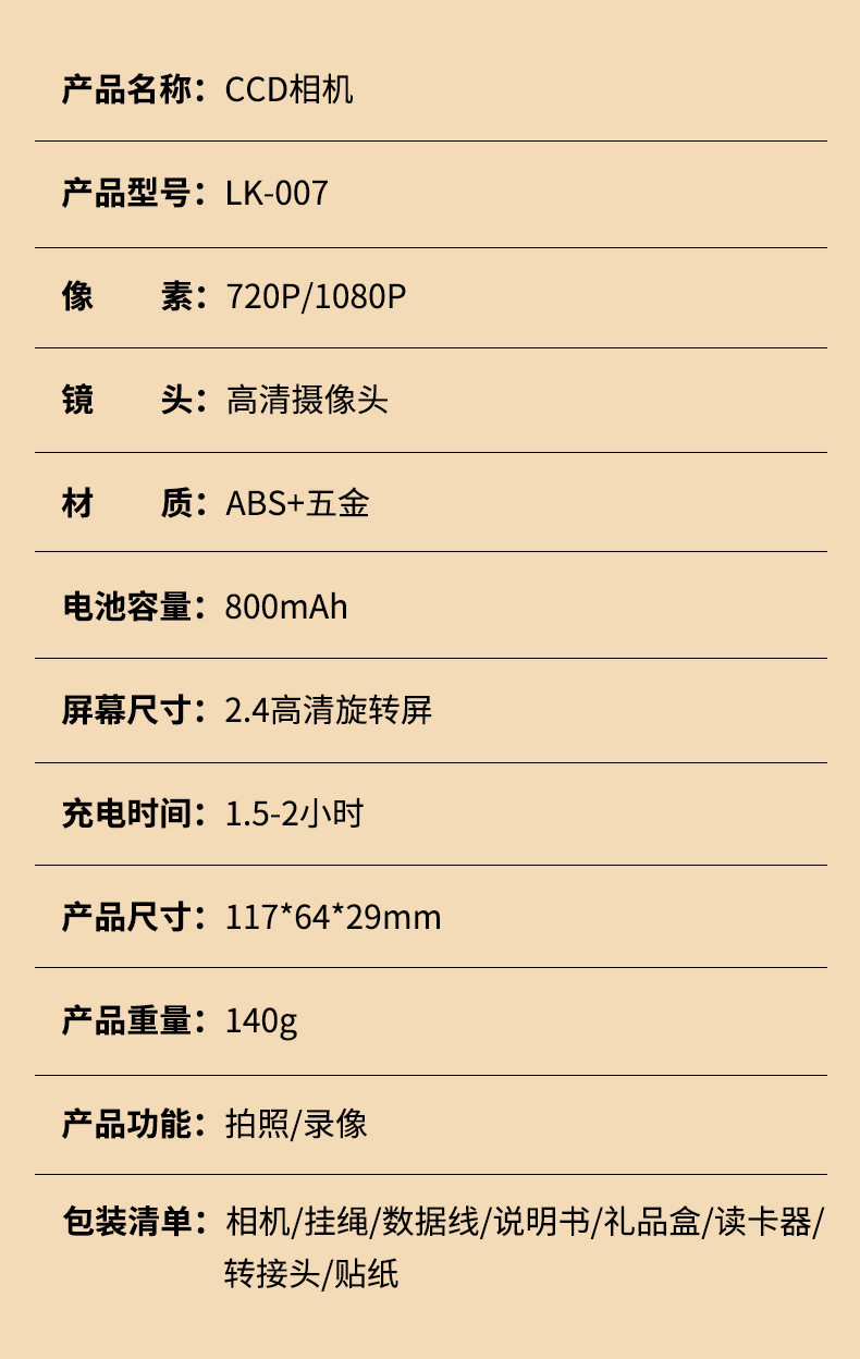 | Body color | Elegant white,Girly pink,Gentle purple,Sunshine yellow,Twilight green,Deep black,Coffee brown,[upgraded version] elegant white + 32g card + card reader adapter + data cable + lanyard + sticker,[upgraded version] girly pink + 32g card + card reader adapter + data cable + lanyard + sticker,[upgraded version] gentle purple + 32g card + card reader adapter + data cable + lanyard + sticker,[upgraded version] sunlight yellow + 32g card + card reader adapter + data cable + lanyard + sticker,[upgraded version] twilight green + 32g card + card reader adapter + data cable + lanyard + sticker,[upgraded version] deep black + 32g card + card reader adapter + data cable + lanyard + sticker,[upgraded version] coffee brown + 32g card + card reader adapter + data cable + lanyard + sticker,[upgraded version] elegant white + 64g card + card reader adapter + data cable + lanyard + sticker,[upgraded version] girly pink + 64g card + card reader adapter + data cable + lanyard + sticker,[upgraded version] gentle purple + 64g card + card reader adapter + data cable + lanyard + sticker,[upgraded version] daylight yellow + 64g card + card reader adapter + data cable + lanyard + sticker,[upgraded version] twilight green + 64g card + card reader adapter + data cable + lanyard + sticker,[upgraded version] deep black + 64g card + card reader adapter + data cable + lanyard + sticker,[upgraded version] coffee brown + 64g card + card reader adapter + data cable + lanyard + sticker |