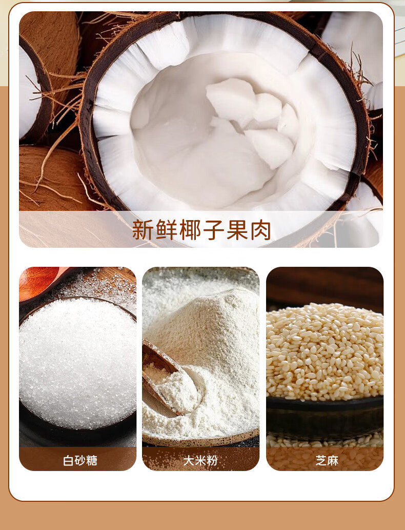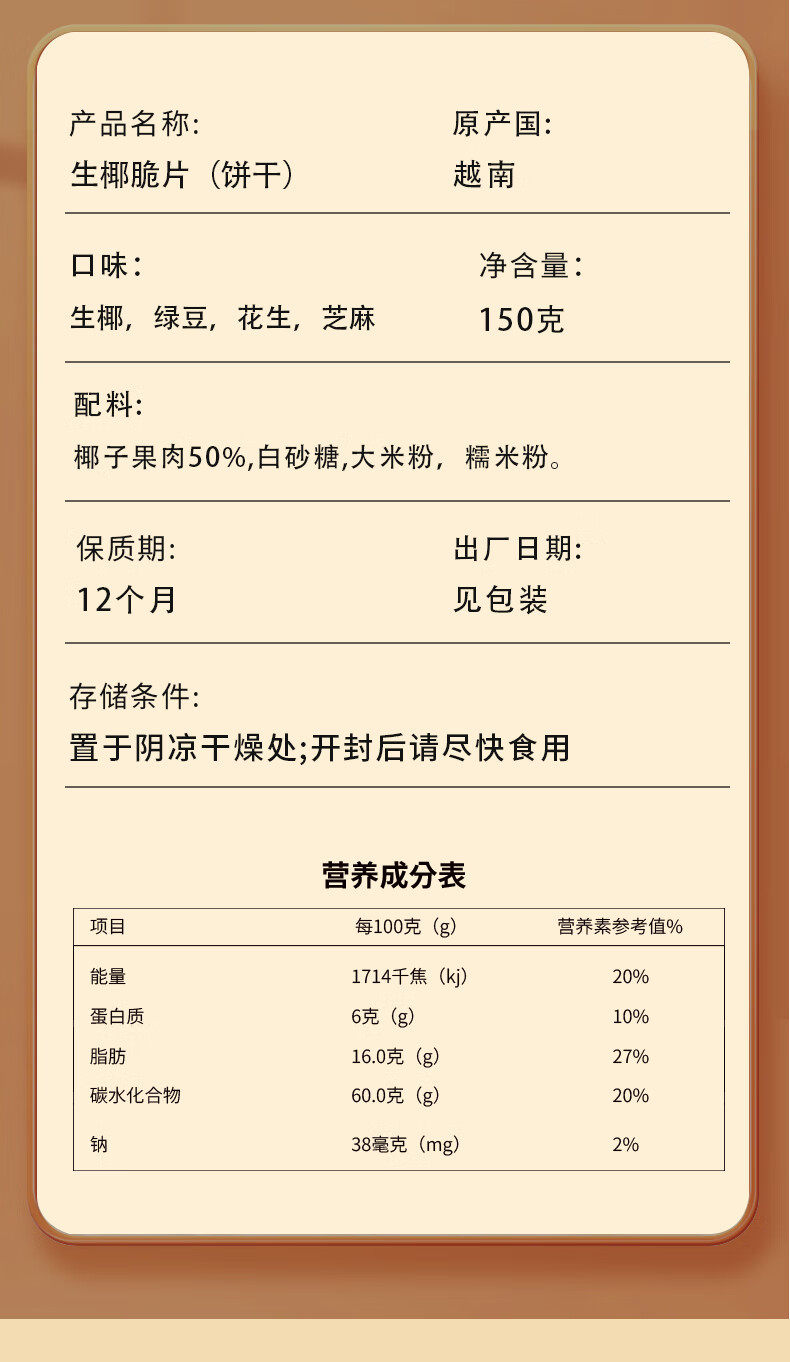 | Packaging specifications | Sesame raw coconut crisps 150g,Mung bean raw coconut crisps 150g,Raw coconut chips 150g,Peanut raw coconut crisps 150g |