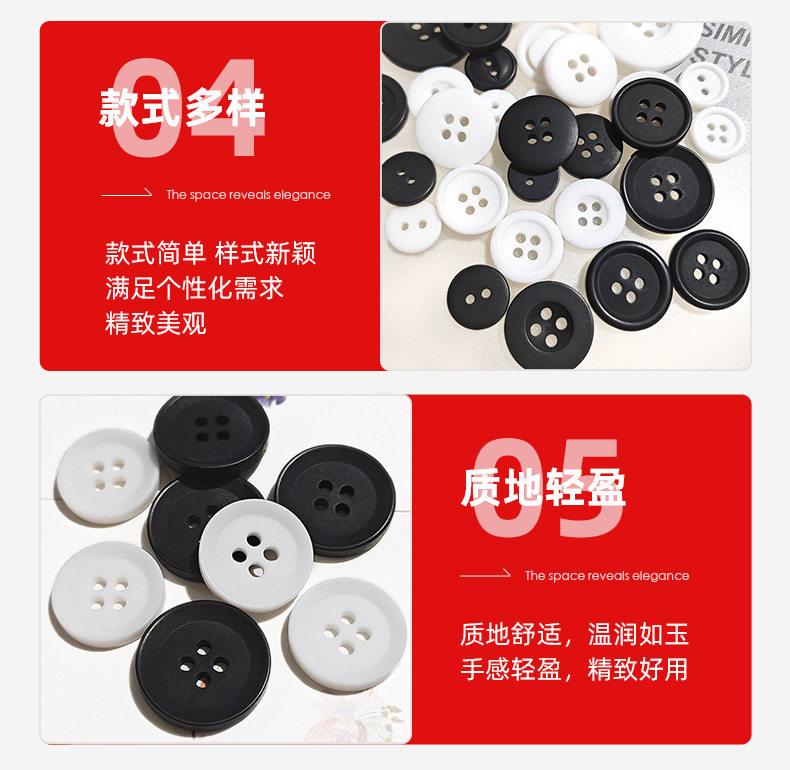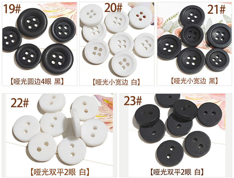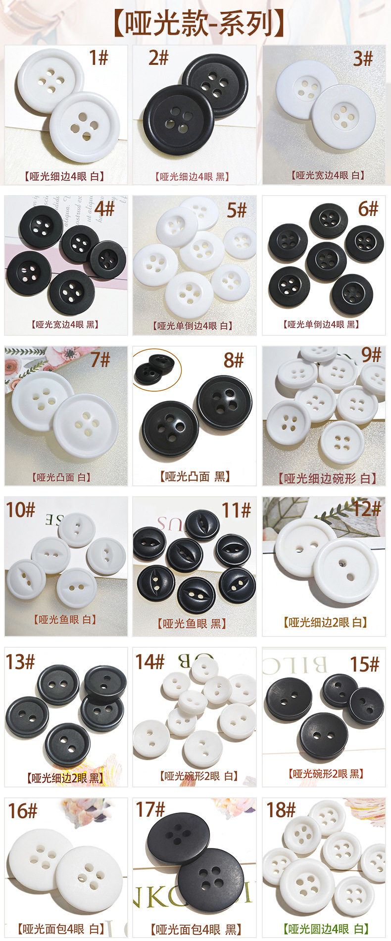 | Specifications and models | 16l=10mm*round*white*thin edge matte*1 #,18l=11.5mm*round*white*thin edge matte*1 #,20l=12.5 mm*round*white*thin edge matte*1 #,24l=15.0mm*round*white*thin edge matte*1 #,28l=18.0mm*round*white*thin edge matte*1 #,32l=20.0mm*round*white*thin edge matte*1 #,36l=23.0mm*round*white*thin edge matte*1 #,16l=10mm*round*black*fine edge matte*2 #,18l=11.5mm*round*black*thin edge matte*2 #,20l=12.5 mm*round*black*thin edge matte*2 #,24l=15.0mm*round*black*thin edge matte*2 #,28l=18.0mm*round*black*thin edge matte*2 #,32l=20.0mm*round*black*thin edge matte*2 #,36l=23.0mm*round*black*thin edge matte*2 #,16l=10mm*round*white*wide edge matte*3 #,18l=11.5mm*round*white*wide edge matte*3 #,20l=12.5 mm*round*white*wide edge matte*3 #,24l=15.0mm*round*white*wide edge matte*3 #,28l=18.0mm*round*white*wide edge matte*3 #,32l=20.0mm*round*white*wide edge matte*3 #,36l=23.0mm*round*white*wide edge matte*3 #,16l=10mm*round*black*wide edge matte*4 #,18l=11.5mm*round*black*wide edge matte*4 #,20l=12.5 mm*round*black*wide edge matte*4 #,24l=15.0mm*round*black*wide edge matte*4 #,28l=18.0mm*round*black*wide edge matte*4 #,32l=20.0mm*round*black*wide edge matte*4 #,36l=23.0mm*round*black*wide edge matte*4 #,40l = 25.0mm * round * black * wide bezel matte * 4#,40l = 25.0mm * round * white * wide rim matte * 4#,16l=10mm*round*white*single beveled matte*5 #,18l=11.5mm*round*white*single beveled matte*5 #,20l=12.5 mm*round*white*single beveled matte*5 #,24l=15.0mm*round*white*single beveled matte*5 #,28l=18.0mm*round*white*single beveled matte*5 #,32l=20.0mm*round*white*single beveled matte*5 #,36l=23.0mm*round*white*single beveled matte*5 #,16l=10mm*round*black*single beveled matte*6 #,18l=11.5mm*round*black*single beveled matte*6 #,20l=12.5 mm*round*black*single beveled matte*6 #,24l=15.0mm*round*black*single beveled matte*6 #,28l=18.0mm*round*black*single bevel matte*6 #,32l=20.0mm*round*black*single beveled matte*6 #,36l=23.0mm*round*black*single beveled matte*6 #,16l=10mm*round*white*convex matte*7 #,18l=11.5mm*round*white*convex matte*7 #,20l=12.5 mm*round*white*convex matte*7 #,24l=15.0mm*round*white*convex matte*7 #,28l=18.0mm*round*white*convex matte*7 #,32l=20.0mm*round*white*convex matte*7 #,36l=23.0mm*round*white*convex matte*7 #,16l=10mm*round*black*convex matte*8 #,18l=11.5mm*round*black*convex matte*8 #,20l=12.5 mm*round*black*convex matte*8 #,24l=15.0mm*round*black*convex matte*8 #,28l=18.0mm*round*black*convex matte*8 #,32l=20.0mm*round*black*convex matte*8 #,36l=23.0mm*round*black*convex matte*8 #,16l=10mm*round bowl shape*white*thin edge matte*9 #,18l=11.5mm*round bowl shape*white*thin edge matte*9 #,20l=12.5 mm*round bowl shape*white*thin edge matte*9 #,24l=15.0mm*round bowl shape*white*thin edge matte*9 #,28l=18.0mm*round bowl shape*white*thin edge matte*9 #,32l=20.0mm*round bowl shape*white*thin edge matte*9 #,36l=23.0mm*round bowl shape*white*thin edge matte*9 #,16l=10mm*round*white*fisheye matte*10 #,18l=11.5mm*round*white*fisheye matte*10 #,20l=12.5 mm*round*white*fisheye matte*10 #,24l=15.0mm*round*white*fisheye matte*10 #,28l=18.0mm*round*white*fisheye matte*10 #,32l=20.0mm*round*white*fisheye matte*10 #,16l=10mm*round*black*fisheye matte*11 #,18l=11.5mm*round*black*fisheye matte*11 #,20l=12.5 mm*round*black*fisheye matte*11 #,24l=15.0mm*round*black*fish eye matte*11 #,28l=18.0mm*round*black*fish eye matte*11 #,32l=20.0mm*round*black*fisheye matte*11 #,16l=10mm*round*white*thin edge two-eye matte*12 #,18l=11.5mm*round*white*thin edge two-eye matte*12 #,20l=12.5 mm*round*white*thin edge two-eye matte*12 #,24l=15.0mm*round*white*thin edge two-eye matte*12 #,28l=18.0mm*round*white*thin edge two-eye matte*12 #,32l=20.0mm*round*white*thin edge two-eye matte*12 #,16l = 10mm round black button with thin edge, two-hole matte finish * 13#,18l = 11.5mm round black button with thin edge, two-hole matte finish * 13#,20l = 12.5mm round black button with fine edge, two-hole matte finish * 13#,24l = 15.0mm * round * black * thin edge two-hole matte * 13#,28l = 18.0mm * round * black * thin edge two-hole matte * 13#,32l = 20.0mm * round * black * fine edge two-hole matte * 13#,16l=10mm*round bowl shape*white*bowl shaped eyes matte*14 #,18l=11.5mm*round bowl shape*white*bowl shape two eyes matte*14 #,20l=12.5 mm*round bowl shape*white*bowl shape two eyes matte*14 #,24l=15.0mm*round bowl shape*white*bowl shape two eyes matte*14 #,28l=18.0mm*round bowl shape*white*bowl shape two eyes matte*14 #,32l=20.0mm*round bowl shape*white*bowl shape two eyes matte*14 #,16l=10mm*round bowl shape*black*bowl shaped eyes matte*15 #,18l=11.5mm*round bowl shape*black*bowl shape two eyes matte*15 #,20l=12.5 mm*round bowl shape*black*bowl shape two eyes matte*15 #,24l=15.0mm*round bowl shape*black*bowl shape two eyes matte*15 #,28l=18.0mm*round bowl shape*black*bowl shape two eyes matte*15 #,32l=20.0mm*round bowl shape*black*bowl shape two eyes matte*15 #,16l=10mm*round*white*bread four-eye matte*16 #,18l=11.5mm*round*white*bread four-eye matte*16 #,20l=12.5 mm*round*white*bread four-eye matte*16 #,24l=15.0mm*round*white*bread four-eye matte*16 #,28l=18.0mm*round*white*bread four-eye matte*16 #,32l=20.0mm*round*white*bread four-eye matte*16 #,16l=10mm*round*black*bread four-eye matte*17 #,18l=11.5mm*round*black*bread four-eye matte*17 #,20l=12.5 mm*round*black*bread four-eye matte*17 #,24l=15.0mm*round*black*bread four-eye matte*17 #,28l=18.0mm*round*black*bread four-eye matte*17 #,32l=20.0mm*round*black*bread four-eye matte*17 #,18l=11.5mm*round*white*18 #,20l=12.5 mm*round*white*round edge four eyes matte*18 #,24l=15.0mm*round*white*round edge four eyes matte*18 #,28l=18.0mm*round*white*round edge four eyes matte*18 #,32l=20.0mm*round*white*round edge four eyes matte*18 #,18l=11.5mm*round*black*round edge four eyes matte*19 #,20l=12.5 mm*round*black*round edge four eyes matte*19 #,24l=15.0mm*round*black*round edge four eyes matte*19 #,28l=18.0mm*round*black*round edge four eyes matte*19 #,32l=20.0
