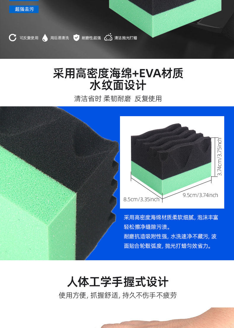 Process advantages Made of high-density sponge + eva, the water-textured surface design has strong adsorption, effectively cleans oil stains, is flexible and abrasion resistant, and can be reused after being washed with water