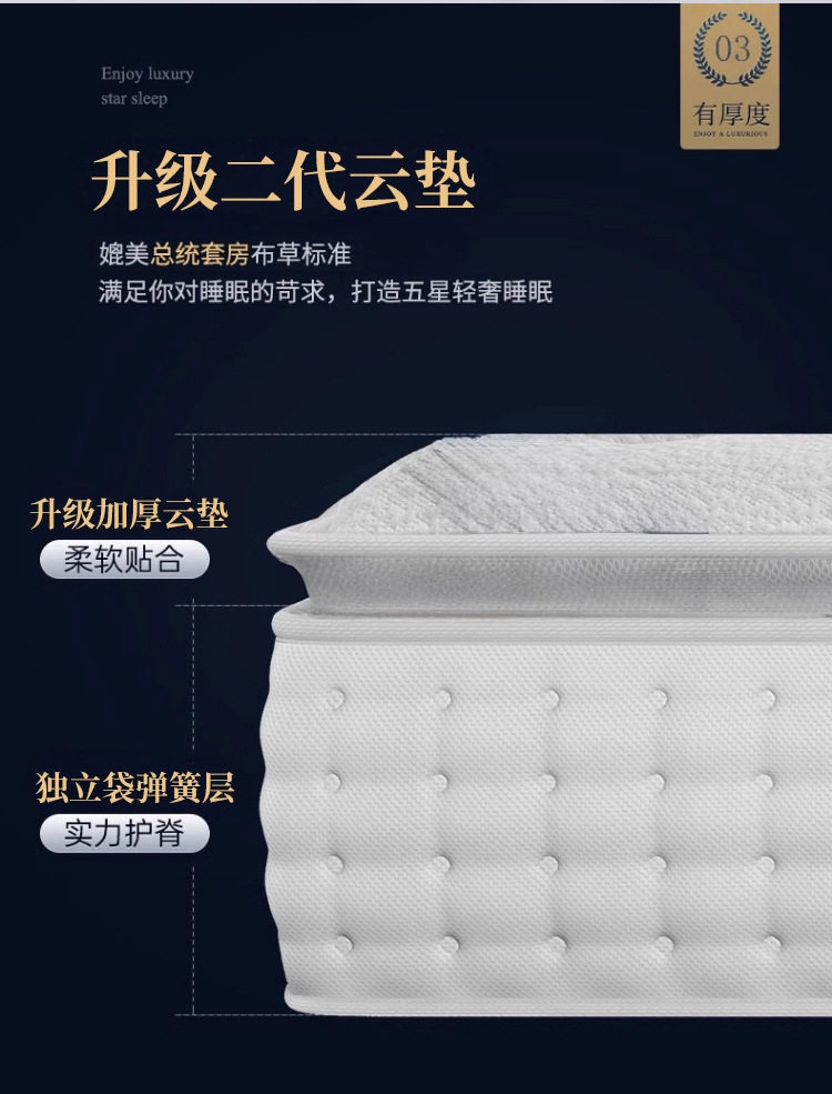 | Color | 20cm ordinary guest room model [2cm high resilience cotton + independent pocket spring],24cm upgraded master bedroom model [3cm natural latex + independent pocket spring],26cm classic slightly harder model [5cm hard cotton + independent pocket spring],26cm zero pressure moderate model [5cm gel memory foam + independent pocket spring],28cm five-star soft model [5cm natural latex + independent pocket spring],28cm spine protection soft and hard models [3cm natural latex + 3e environmentally friendly brown + independent pocket spring],30cm presidential suite model [5cm natural latex + 3cm gel memory foam + independent pocket spring] |