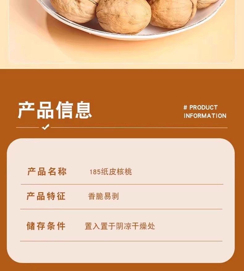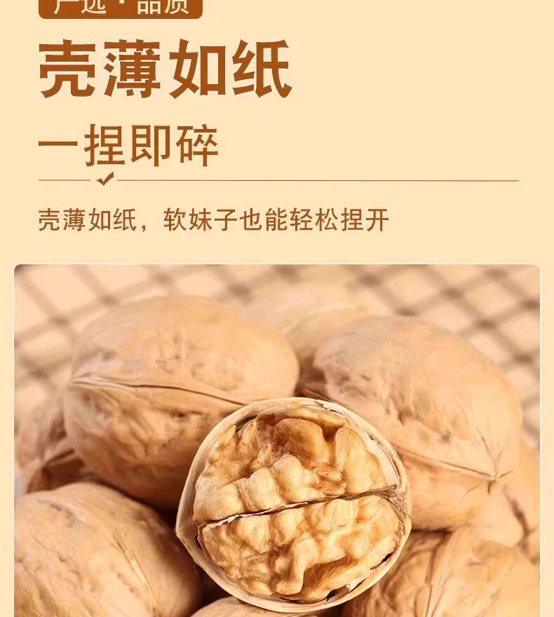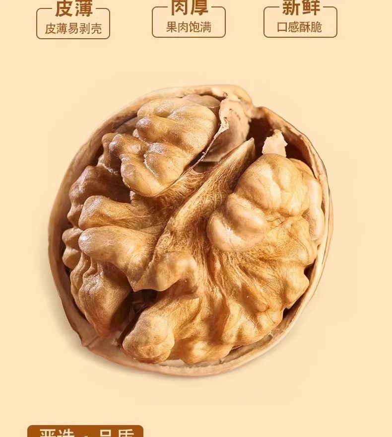 | Taste | 185 paper-skinned walnuts 508*3 bags affordable,185 paper-skinned walnuts 508*2 bags for early adopters,185 paper-skinned walnuts 508*1 bag cost-effective,185 paper-skinned walnuts 250*1 bag tasting pack |