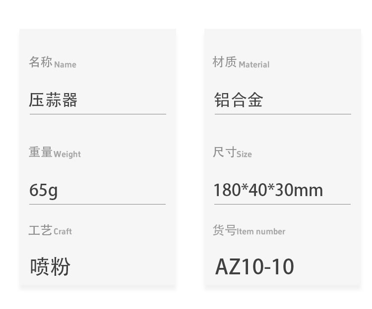 | Specification | 10 # Garlic press shock type,1#Garlic press,2#Garlic press (zhengguang model),3#Garlic press (zhengguang model),4#Garlic press (zhengguang model),5#Garlic press (zhengguang model),5#Garlic press (flash silver model),5#Garlic press (matte black model),6#Garlic press,7#Garlic press,9#Garlic press,11 # Garlic press |