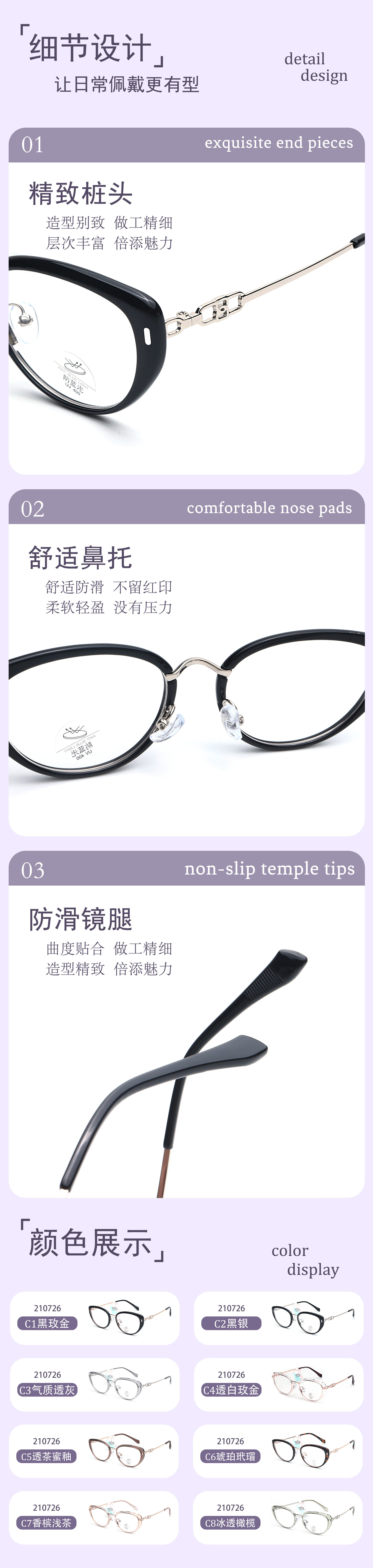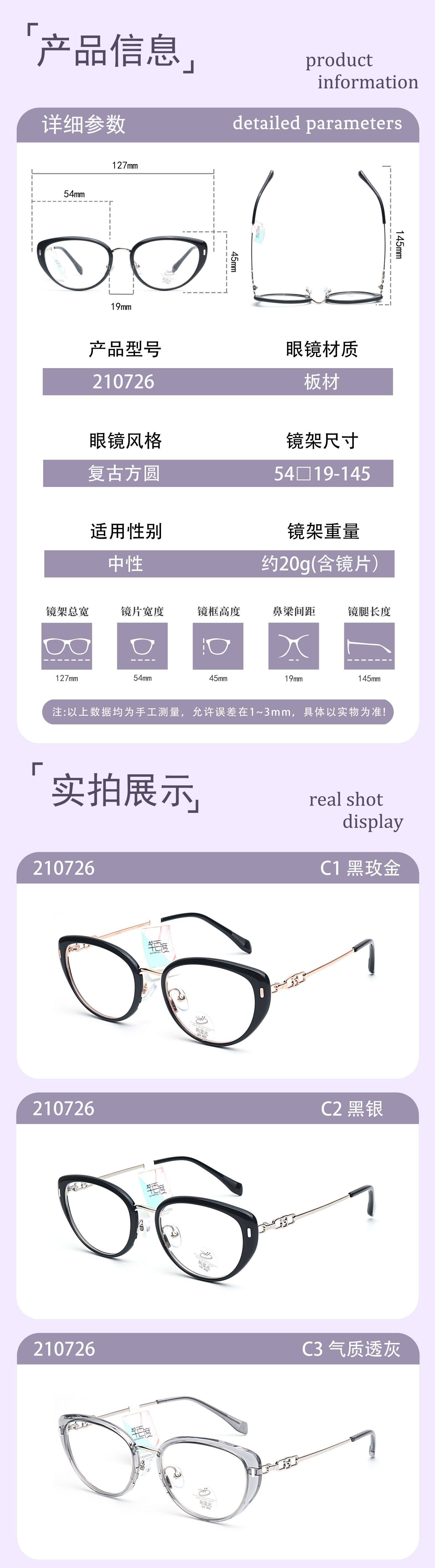 | Frame color | Black rose gold,Black silver,Temperament is gray,Transparent white rose gold,Through tea glaze,Amber tortoise shell,Champagne light tea,Iced olives |