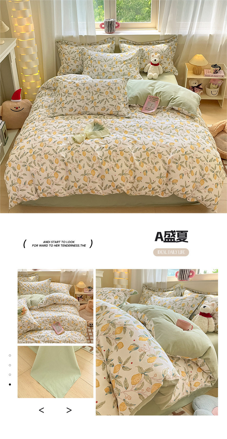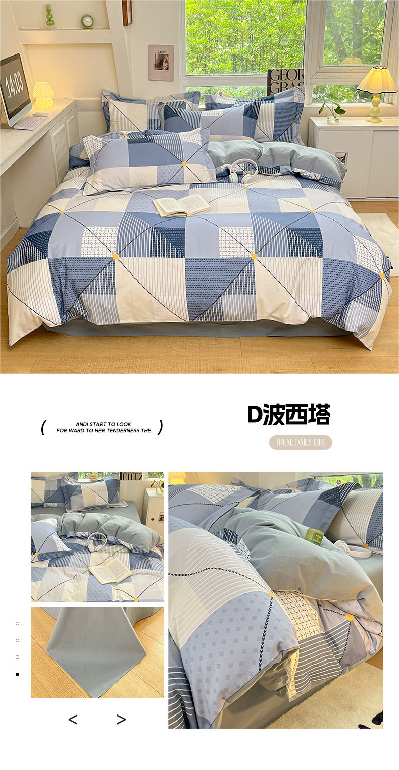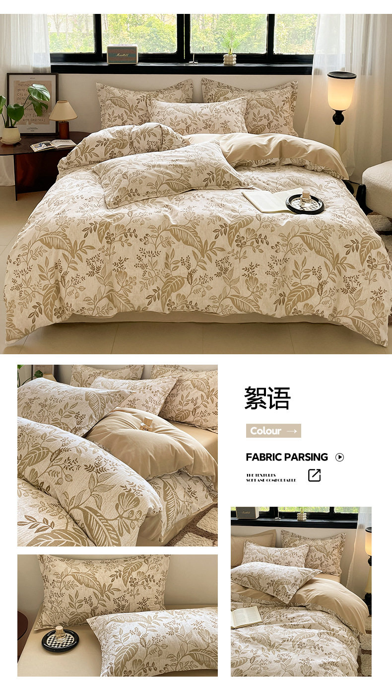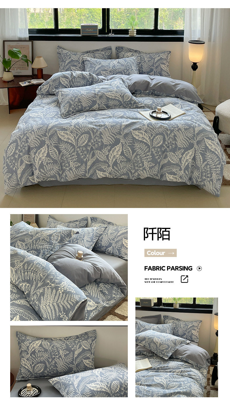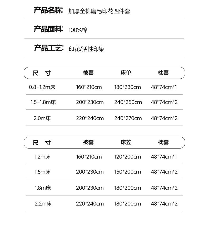 | Dimensions | 1.2m bed sheet three-piece set, quilt cover 1.6*2.1m bed sheet 1.8*2.3m pillowcase*1,1.5m bed sheet four-piece set, quilt cover 2.0*2.3m bed sheet 2.4*2.5m pillowcase*2,1.8m bed sheet four-piece set, quilt cover 2.0*2.3m bed sheet 2.4*2.5m pillowcase*2,2.0m bed sheet four-piece set, quilt cover 2.2*2.4m bed sheet 2.4*2.7m pillowcase*2,1.2m fitted sheet three-piece set, quilt cover 1.5*2.0m fitted sheet 1.2*2.0m pillowcase*1,1.5m fitted sheet set of four, quilt cover 2.0*2.3m fitted sheet 1.5*2.0m pillowcase*2,1.8m fitted sheet set of four, quilt cover 2.0*2.3m fitted sheet 1.8*2.0m pillowcase*2,Extra large 1.8m fitted sheet set of four, quilt cover 2.2*2.4m fitted sheet 1.8*2.0m pillowcase*2 |