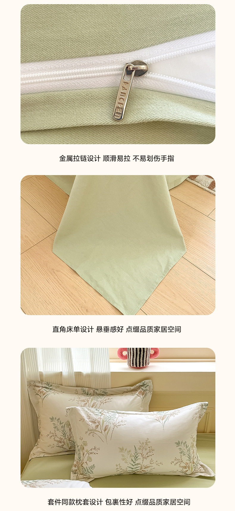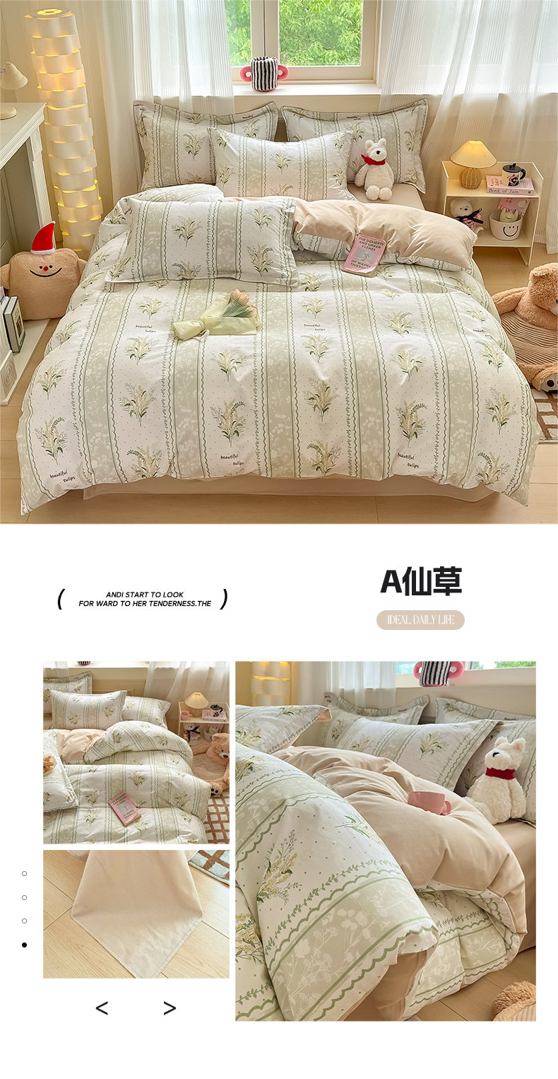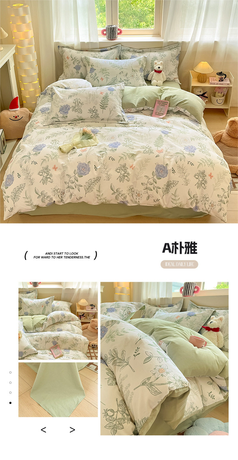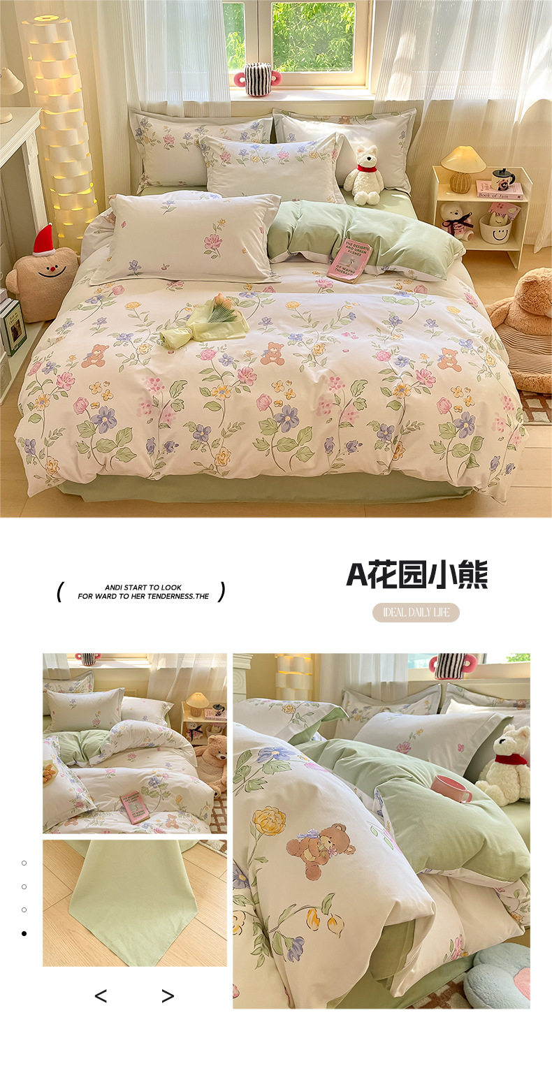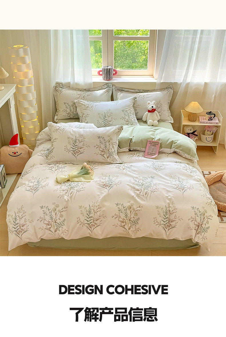 | Dimensions | 1.2m bed sheet three-piece set, quilt cover 1.6*2.1m bed sheet 1.8*2.3m pillowcase*1,1.5m bed sheet four-piece set, quilt cover 2.0*2.3m bed sheet 2.4*2.5m pillowcase*2,1.8m bed sheet four-piece set, quilt cover 2.0*2.3m bed sheet 2.4*2.5m pillowcase*2,2.0m bed sheet four-piece set, quilt cover 2.2*2.4m bed sheet 2.4*2.7m pillowcase*2,1.2m fitted sheet three-piece set, quilt cover 1.5*2.0m fitted sheet 1.2*2.0m pillowcase*1,1.5m fitted sheet set of four, quilt cover 2.0*2.3m fitted sheet 1.5*2.0m pillowcase*2,1.8m fitted sheet set of four, quilt cover 2.0*2.3m fitted sheet 1.8*2.0m pillowcase*2,Extra large 1.8m fitted sheet set of four, quilt cover 2.2*2.4m fitted sheet 1.8*2.0m pillowcase*2 |