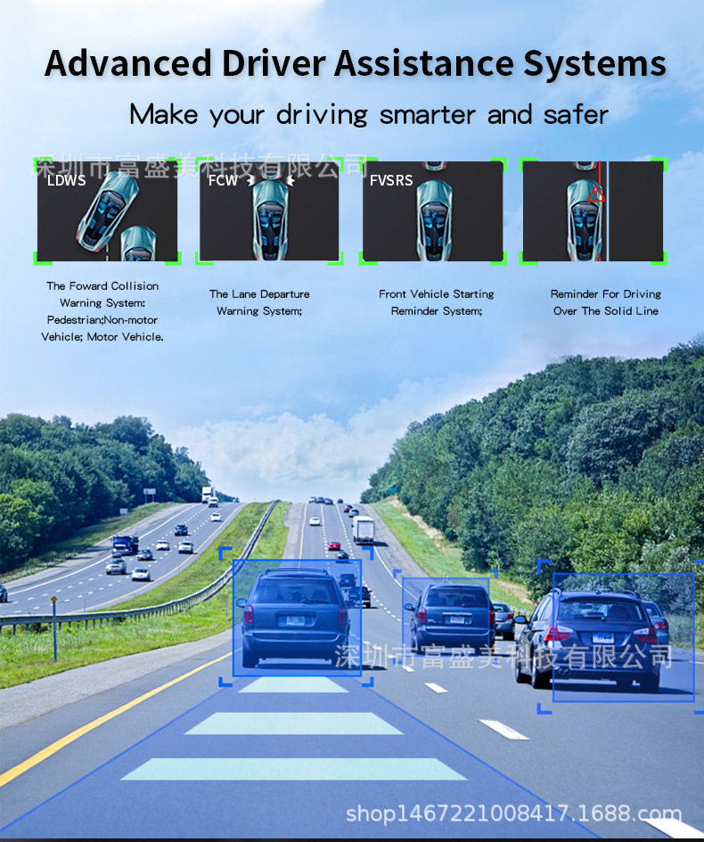 | Function | Motion detection,Loop recording,Parking monitoring,Front vehicle distance detection,Orbital deviation warning,Front vehicle collision warning,Pedestrian collision warning,Before and after video,Short video sharing |