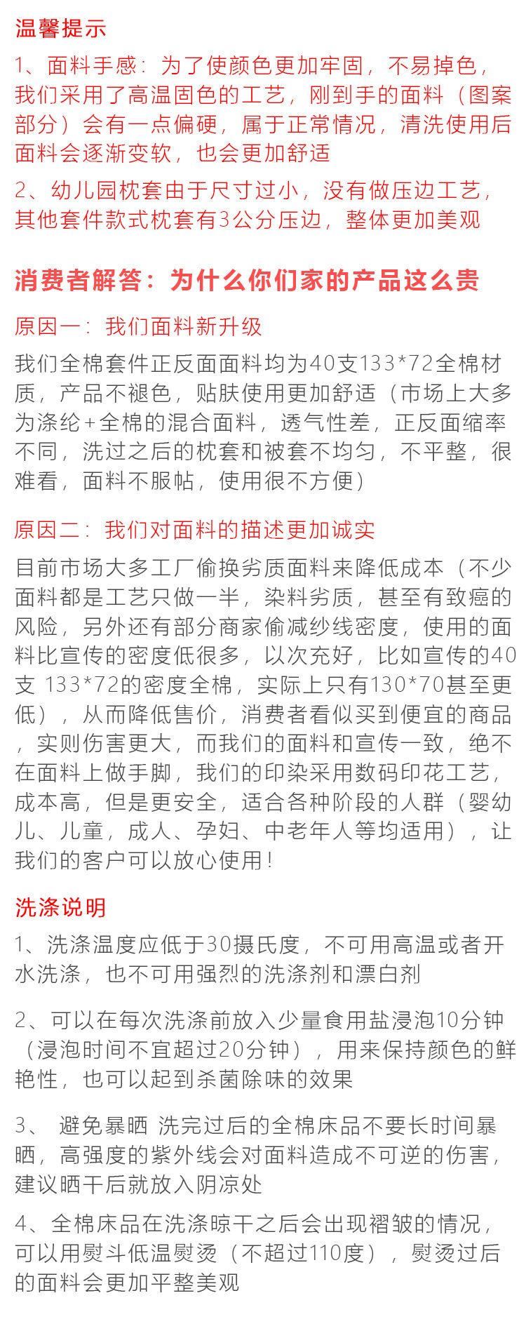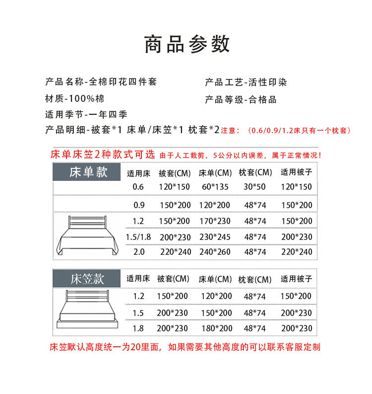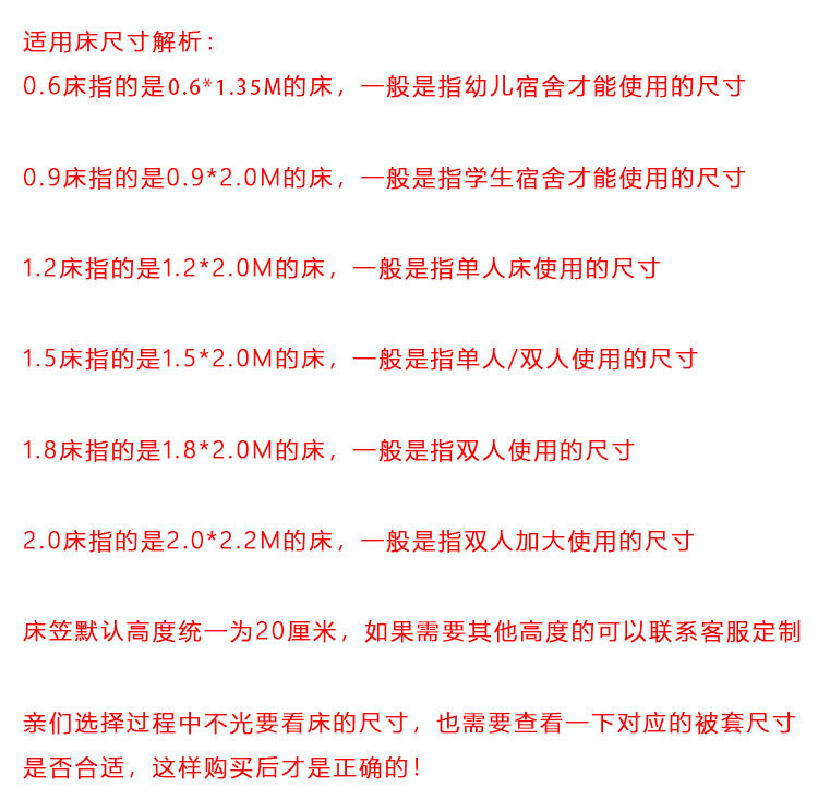 | Dimensions | Individual quilt cover 120*150cm,Individual quilt cover 150*200cm,Individual quilt cover 200*230cm,Individual quilt cover 220*240cm,0.6m bed three-piece cushion set: quilt cover 120*150cm,0.9m bed three-piece bed sheets model: quilt cover 150*200cm,1.2m bed three-piece bed sheets model: quilt cover 150*200cm,1.5m bed four-piece bed sheets model: quilt cover 150*200cm,1.5m bed four-piece bed sheets model: quilt cover 200*230cm,1.8m bed four-piece bed sheets model: quilt cover 200*230cm,2.0m bed four-piece bed sheets model: quilt cover 220*240cm,1.2m three-piece bed set: quilt cover 150*200cm,1.5m bed four-piece fitted sheet set: quilt cover 150*200cm,1.5m bed four-piece fitted sheet set: quilt cover 200*230cm,1.8m bed four-piece fitted sheet set: quilt cover 200*230cm |
