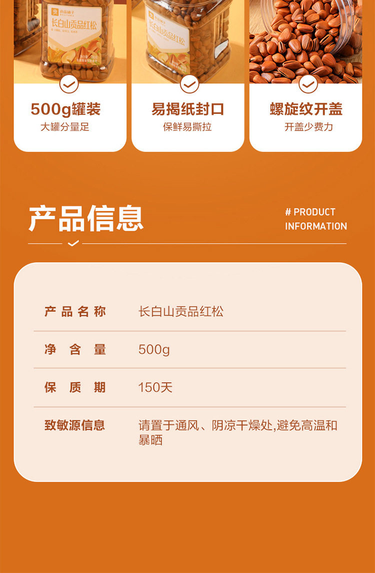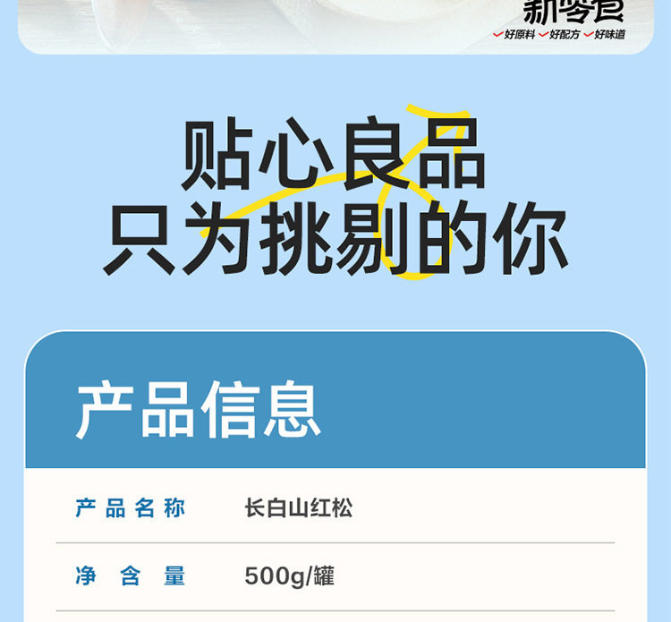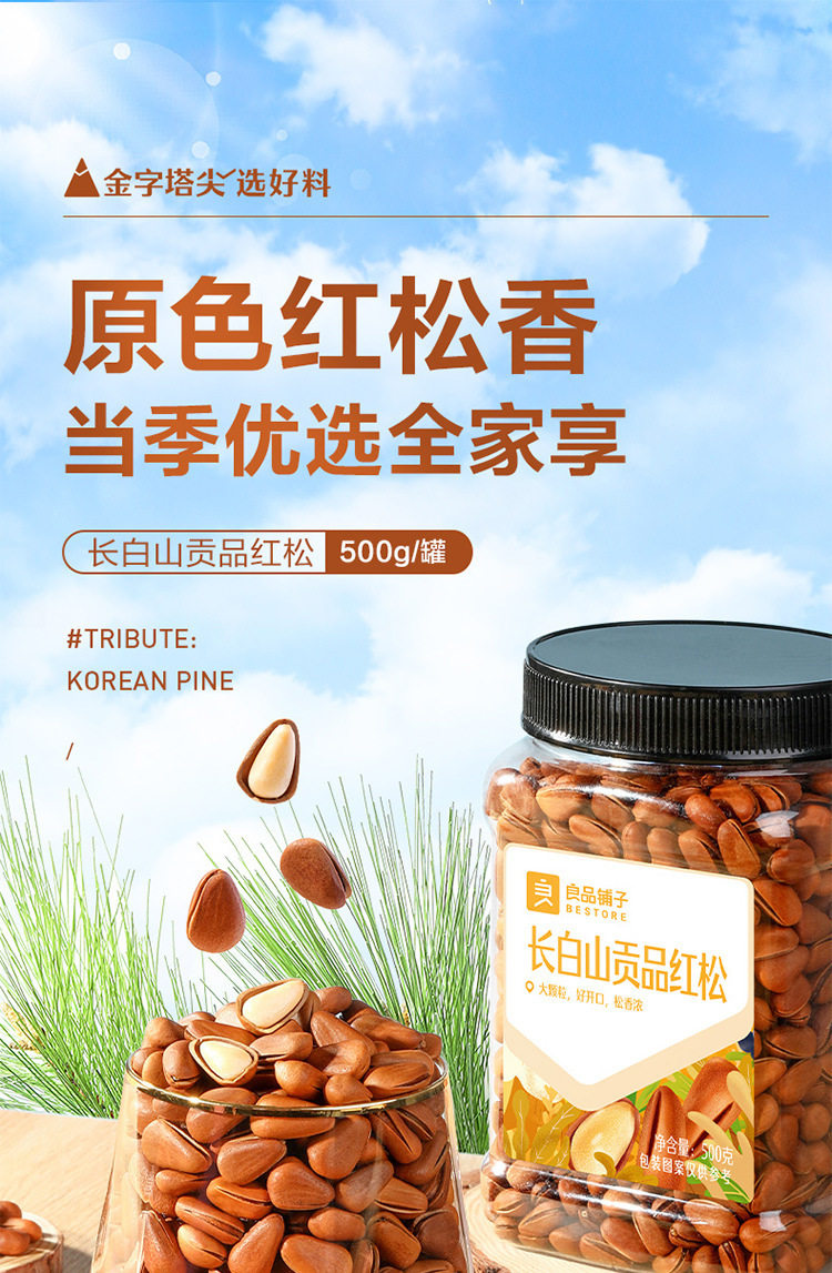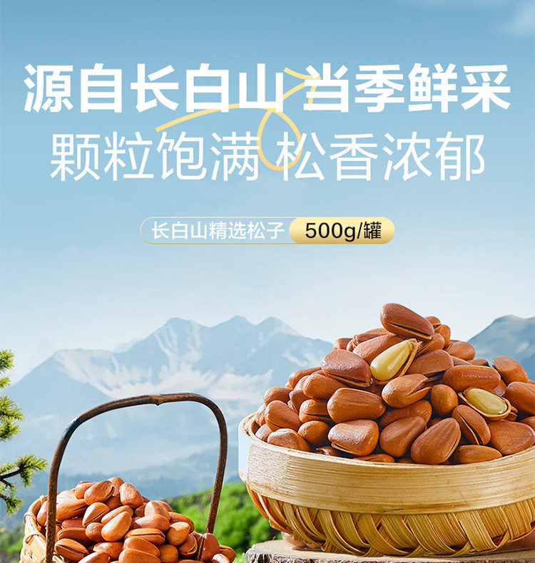 | Packaging specifications | Changbai mountain tribute red pine 500g (canned),Changbai mountain red pine 500g (canned),Changbai mountain selected red pine 500g (canned) |