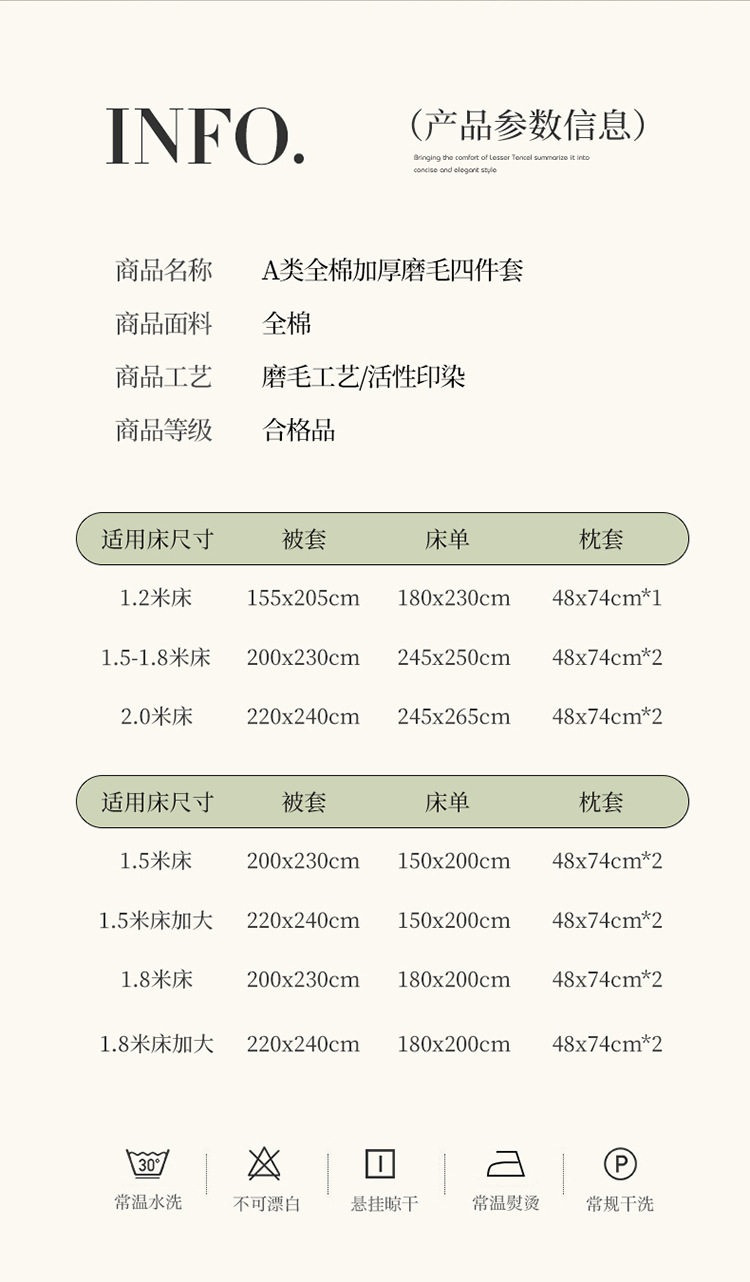 | Dimensions | 1.2m bed sheet three-piece set-quilt cover 155*200,1.35m three-piece bed sheet set-quilt cover 155*200,1.5m bed sheet four-piece set-quilt cover 200*230,1.8m bed sheet four-piece set-quilt cover 200*230,2.0m bed sheet four-piece set-quilt cover 220*240,1.5m fitted sheet set of four-quilt cover 200*230,1.8m fitted sheet set of four-quilt cover 200*230,1.5m fitted sheet set of four-quilt cover 220*240,1.8m fitted sheet set of four-quilt cover 220*240 |