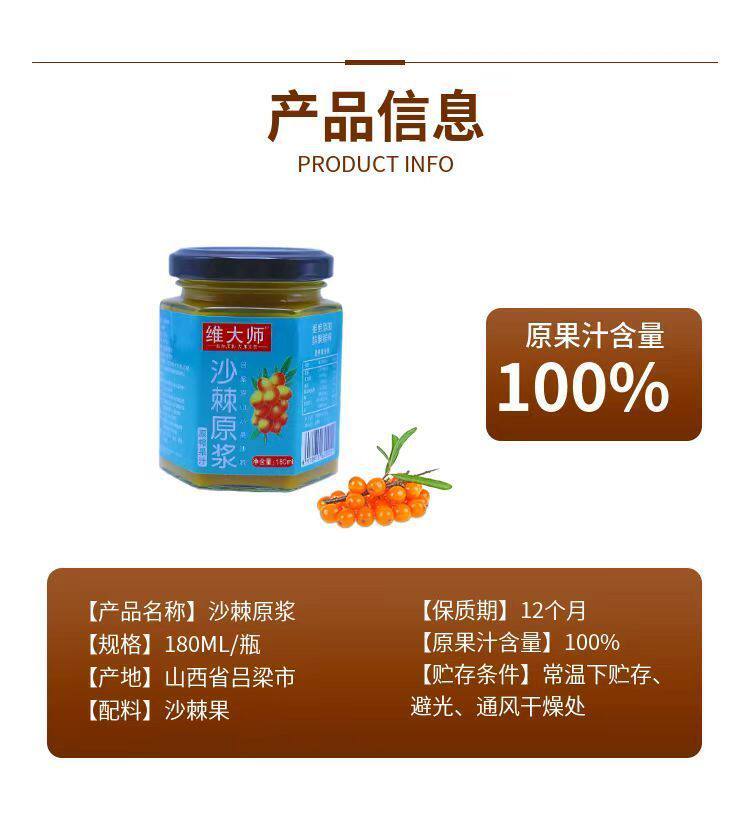 Shanxi Specialty Weidashi Sea Buckthorn Puree Bottled 180ml Original Juice Wild Fresh Fruit Freshly Squeezed Juice Drink